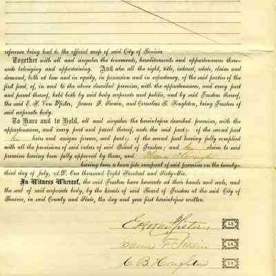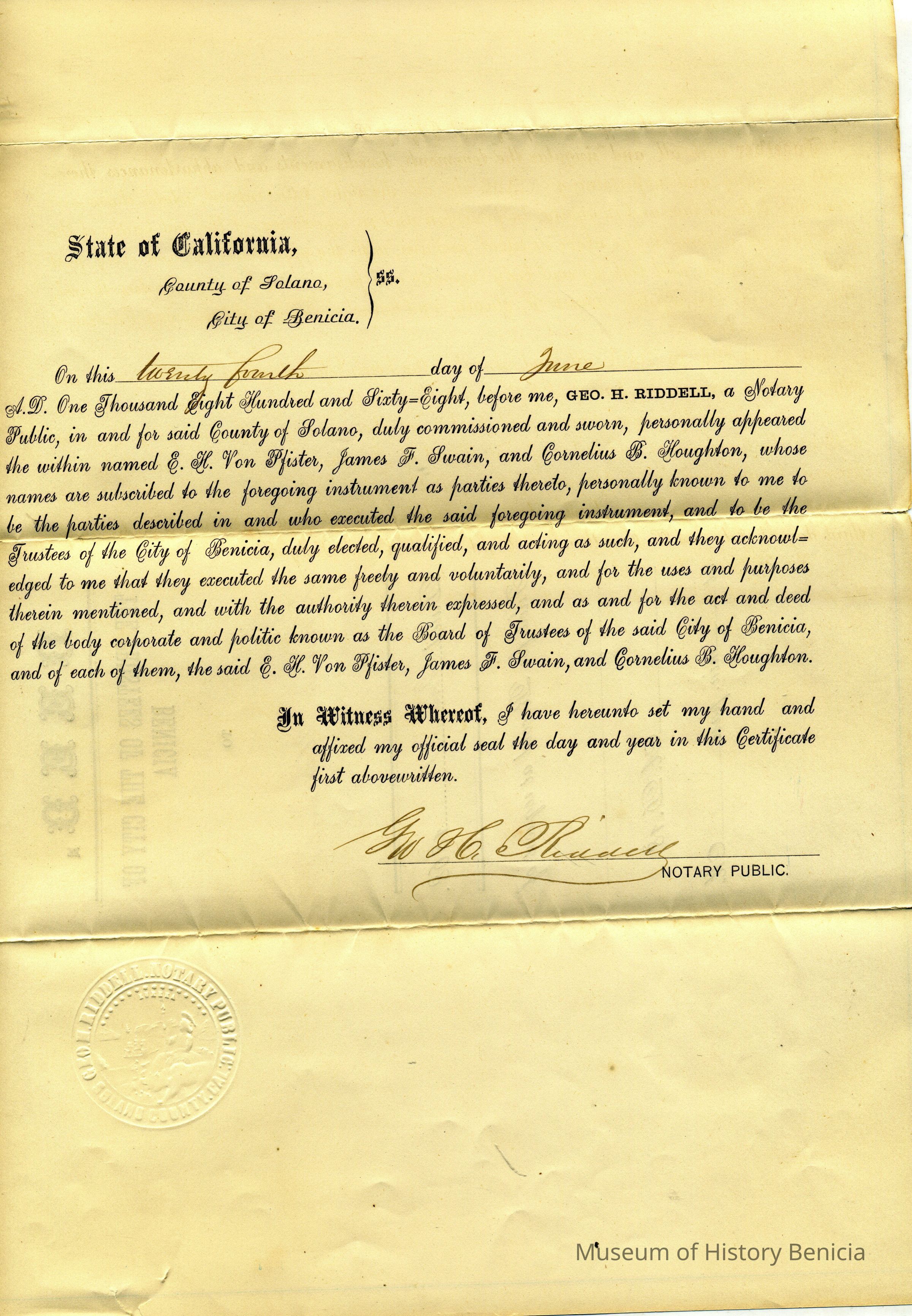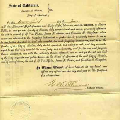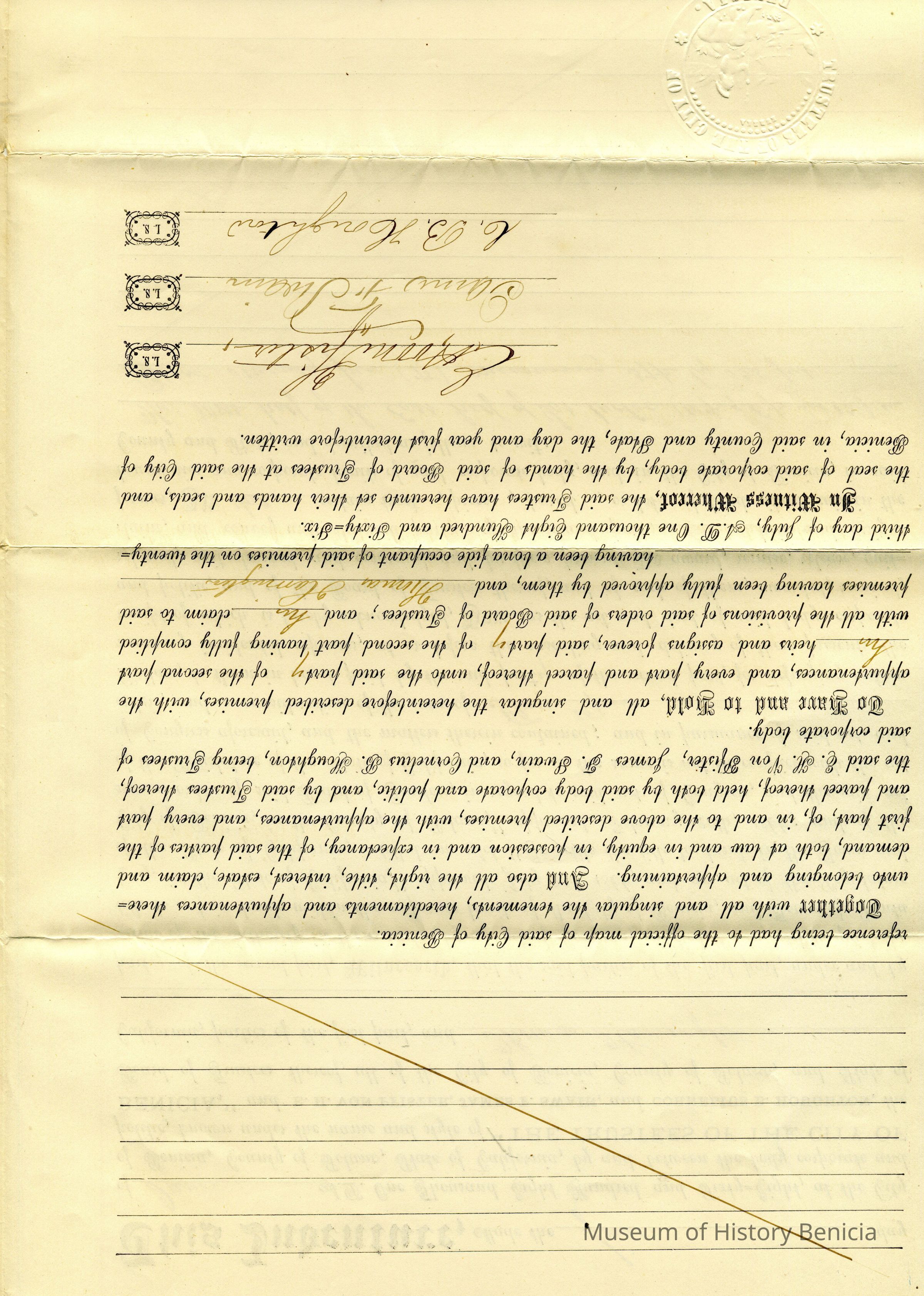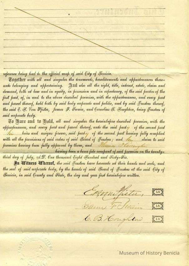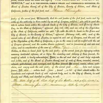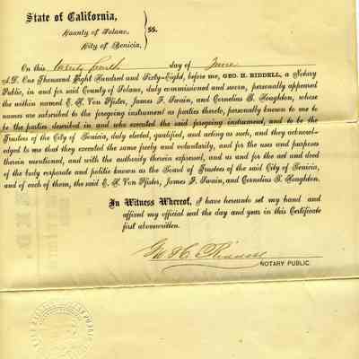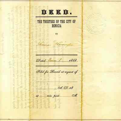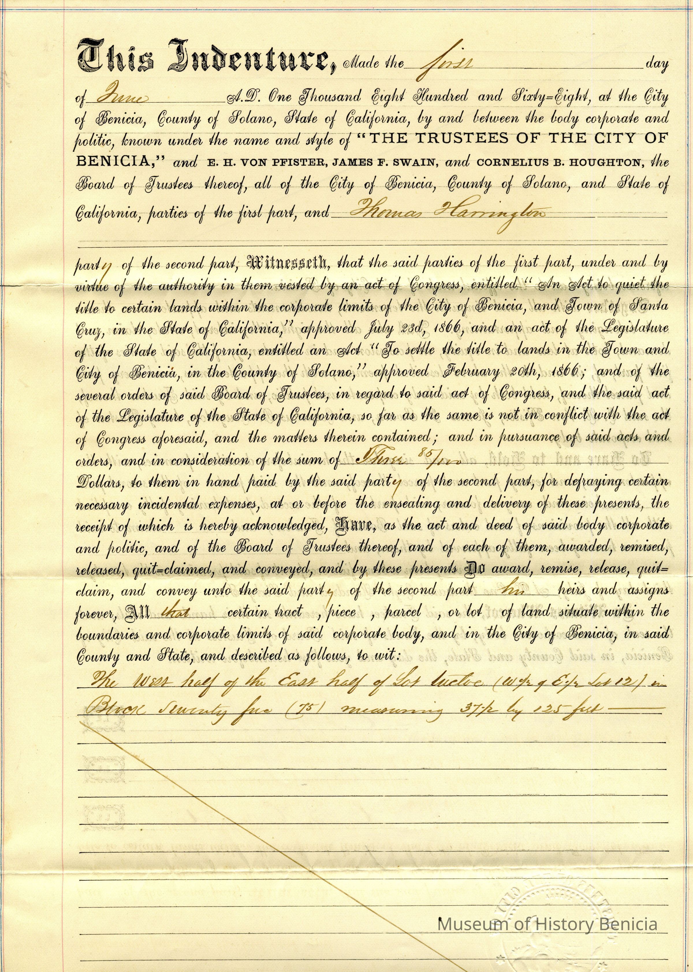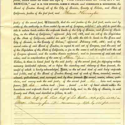 This is an original deed for the west half of the east half of lot 12 in block 75 in Benicia. The deed is dated 06/01/1868 and is for the sum of $3.85. This is an example of a deed provided to Benicia land owners after the Supreme Court case ruled that the lands sold via the Soscul Ranch from General Vallej were not valid. This required the City of Benicia (as well as other cities in Solano County) to have land owners re-title their property. In this case the land owner, Thomas Harrington, must file a new deed for his partial lot and pay the $3.85 administrative fee to the city of Benicia.