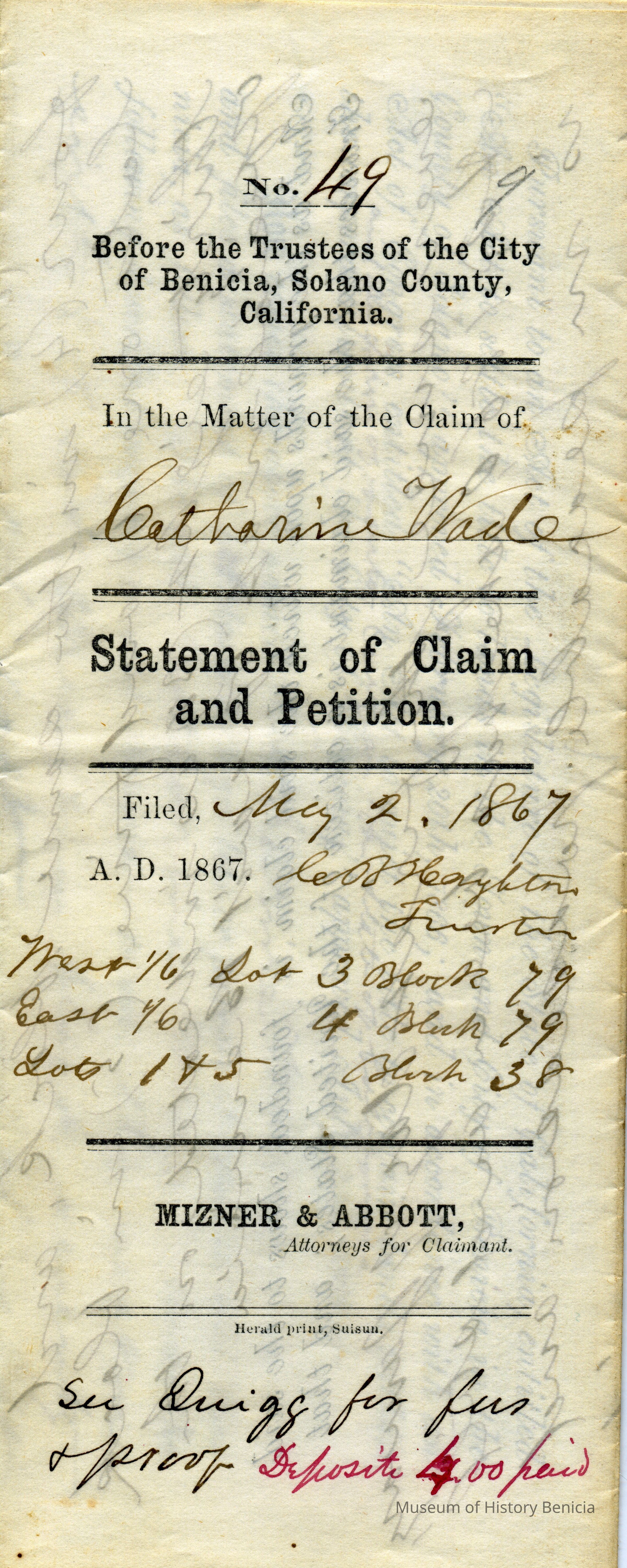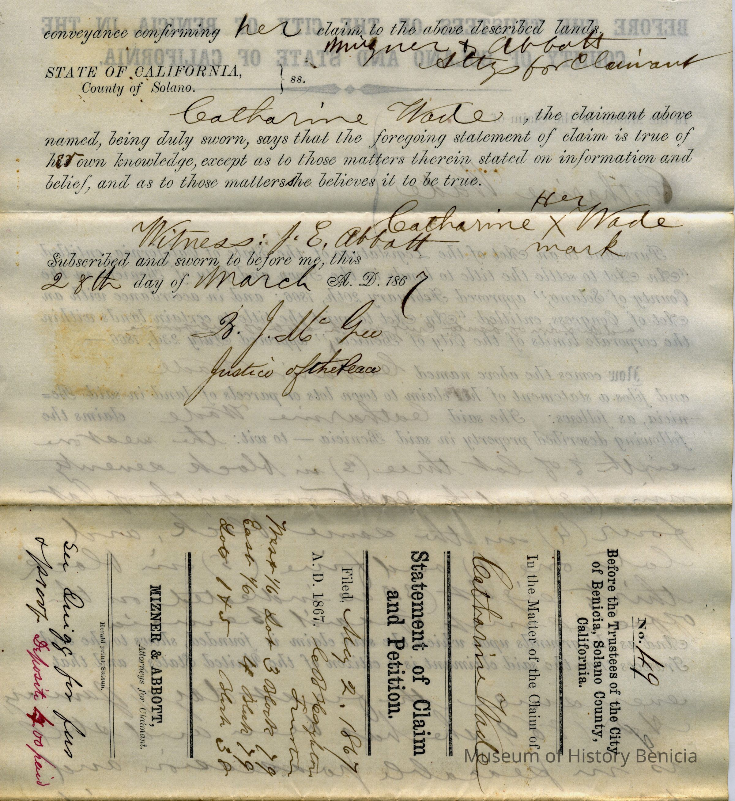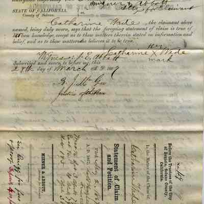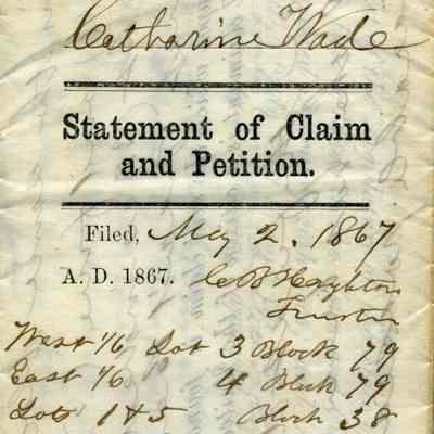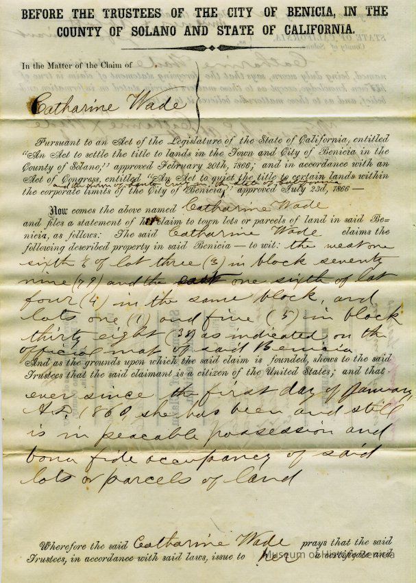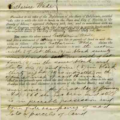 This is a Statement of Claim and Petition by Catherine Wade. It was necessary for land owners in Benicia to re-purchase their lands due to the Supreme Court ruling in the Suscol Ranch case. This is a statement of ownership which would be followed by payment of fees for each piece of property owned in Benicia. The parcels in this claim are: