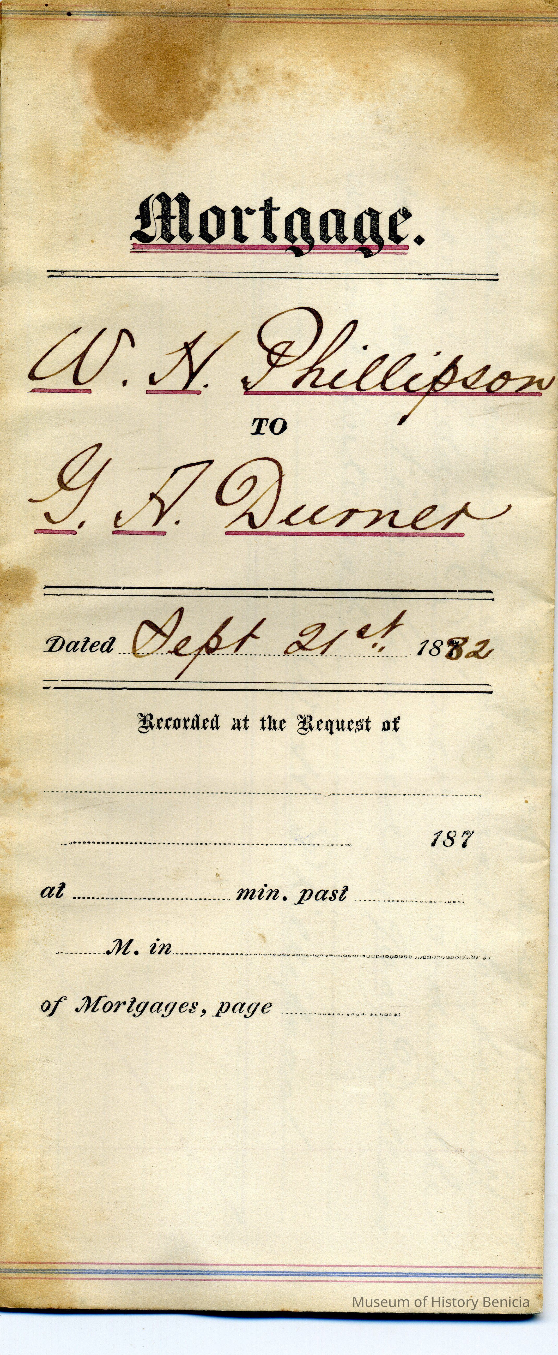 Papers for a mortgage to W.H. Phillipson from G.A. Durner dated 09/21/1882. It is based on part of lot 15 block 19 and is for $900 and due in 5 years.