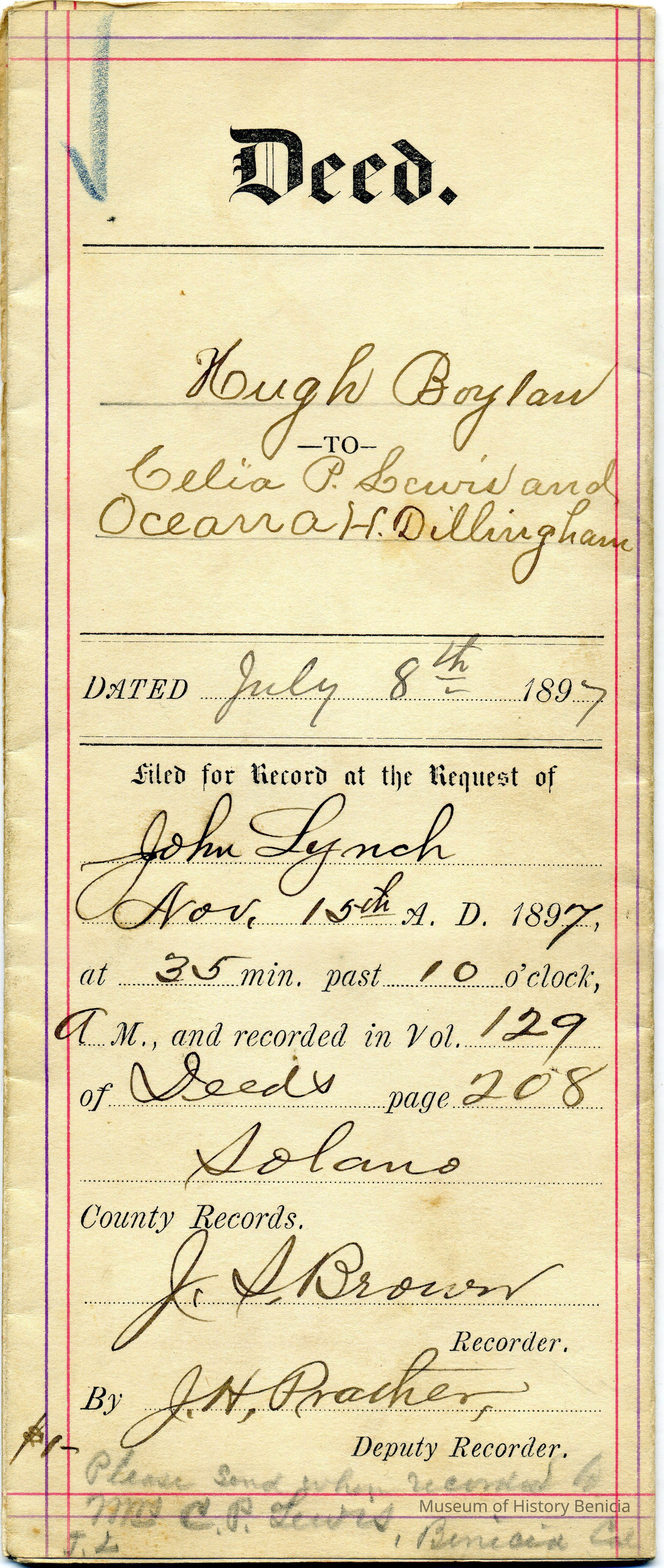 This is a deed transferring property from Hugh Boylan to Celia P. Lewis and Oceanna H. Dillingham on 07/08/1897. The price was $$10 and was for the West 25 feet of lot 3 block 13 in Benicia.