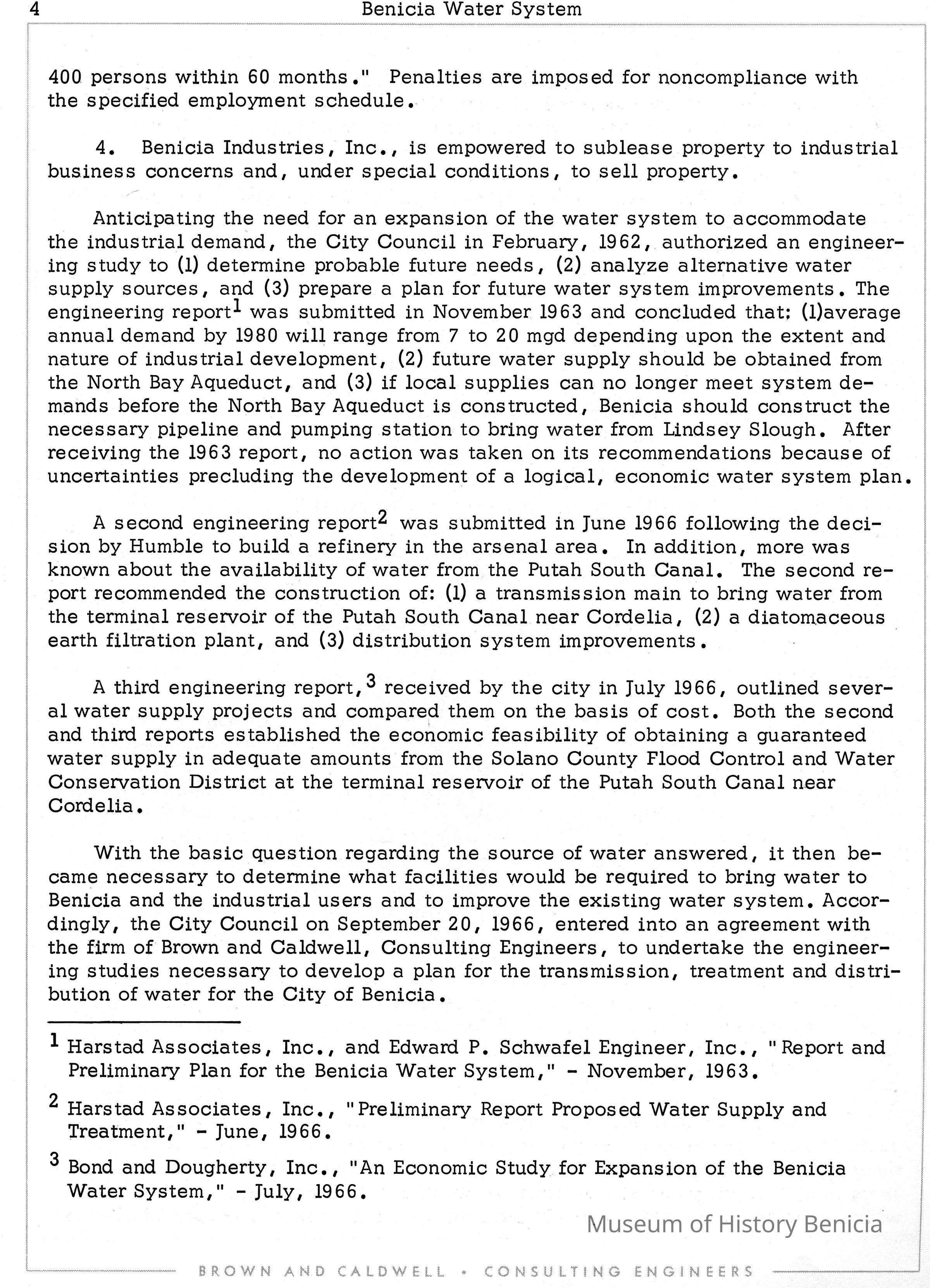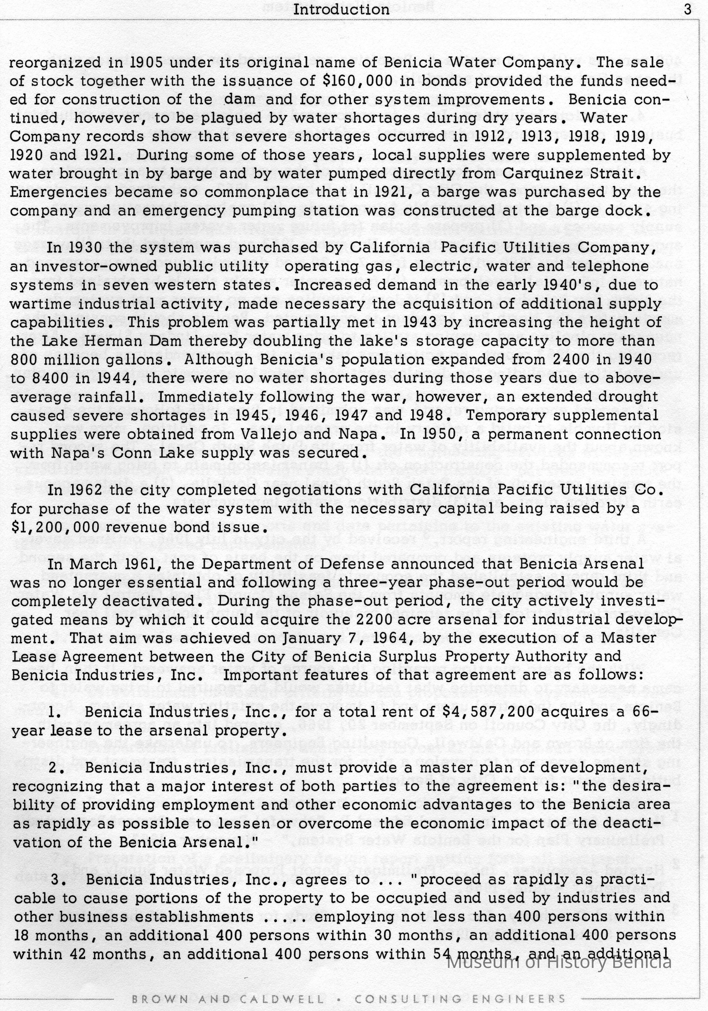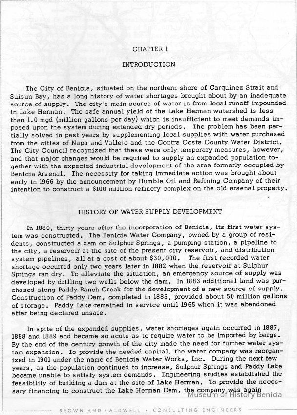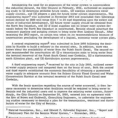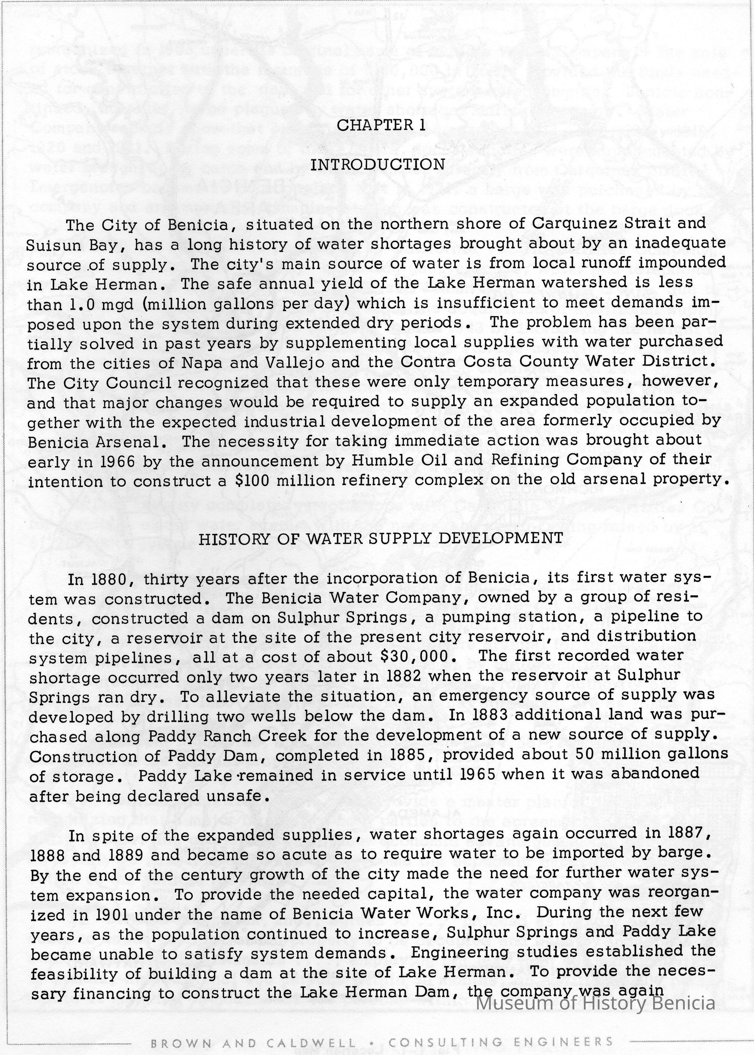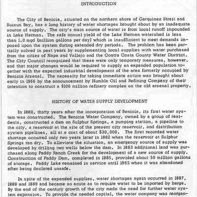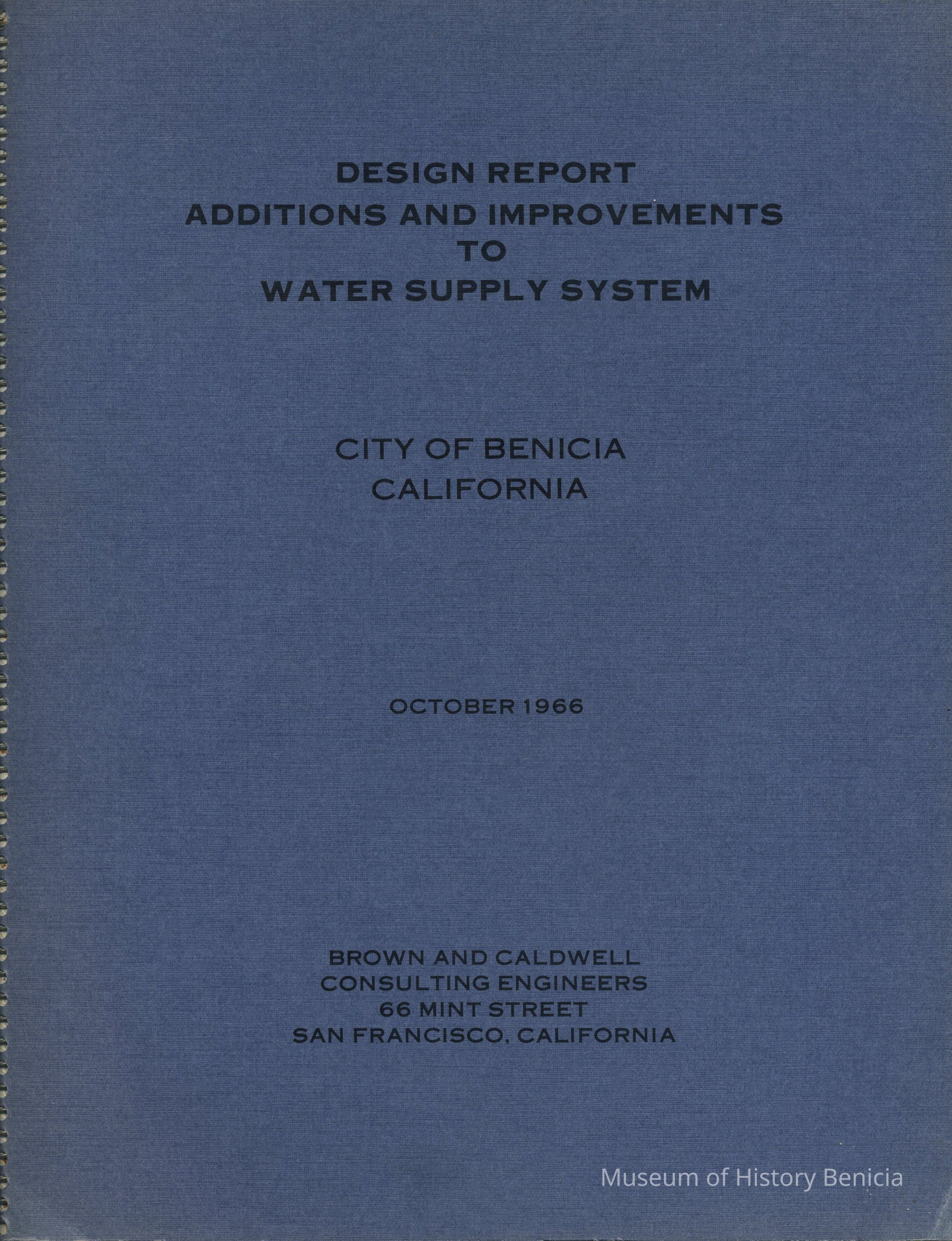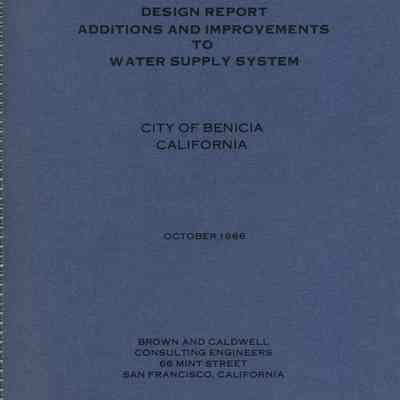 This report covers the preliminary design of water system improvements for the City of Benicia under an agreement dated September 20, 1966. It is a recommendation for Stage I of a long- range program to serve an expanded water service area at full development to include: (1) 36" Cordelia transmission main to bring water from Putah South Canal, (2) water treatment plant having a capacity of 8 million gallons per day, (3) 24" transmission main connecting the inlet of the treatment plant with Lake Herman, (4) raw water pumping station to supply untreated water to the Humble refinery, (5) major supply conduits to deliver treated water to distribution system, (6) enlargement and revisions to the existing Arsenal filtration plant to enhance reliability and (7) distribution system improvements consisting of one reservoir, one booster pumping sttion, about 8-1/2 miles of 6" to 30" pipelines with 73 fire hydrants and necessary valves, fittings and other appurtenances.