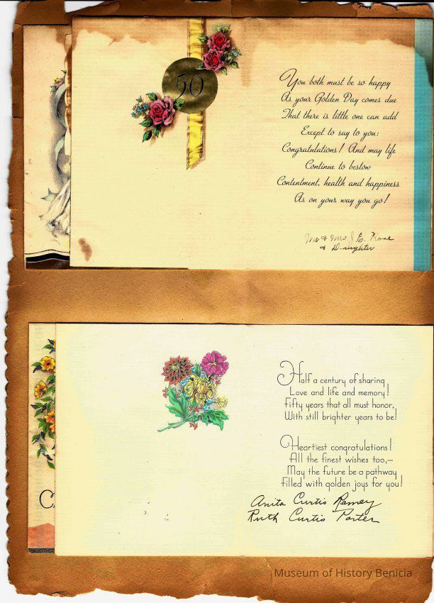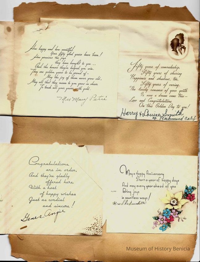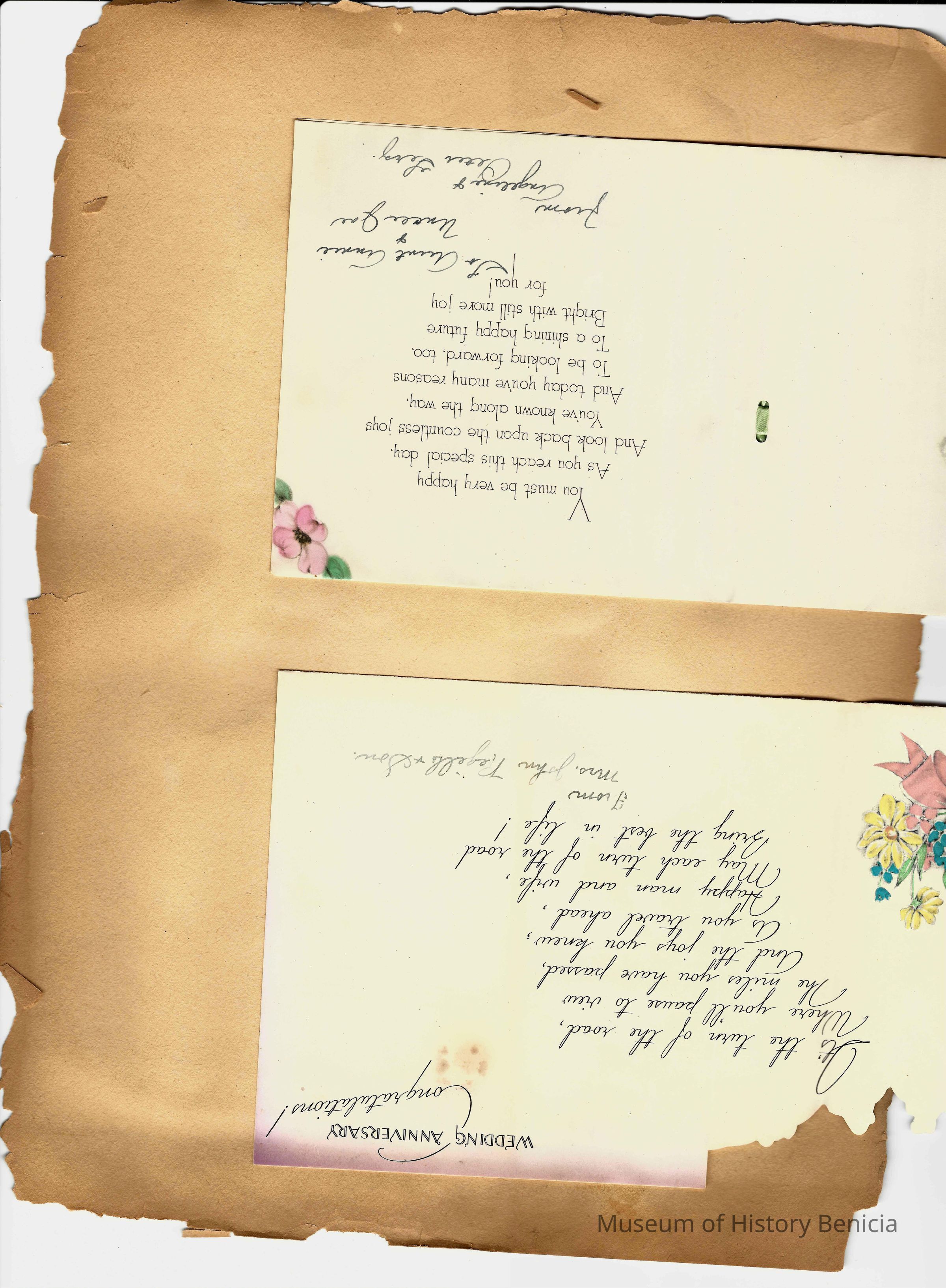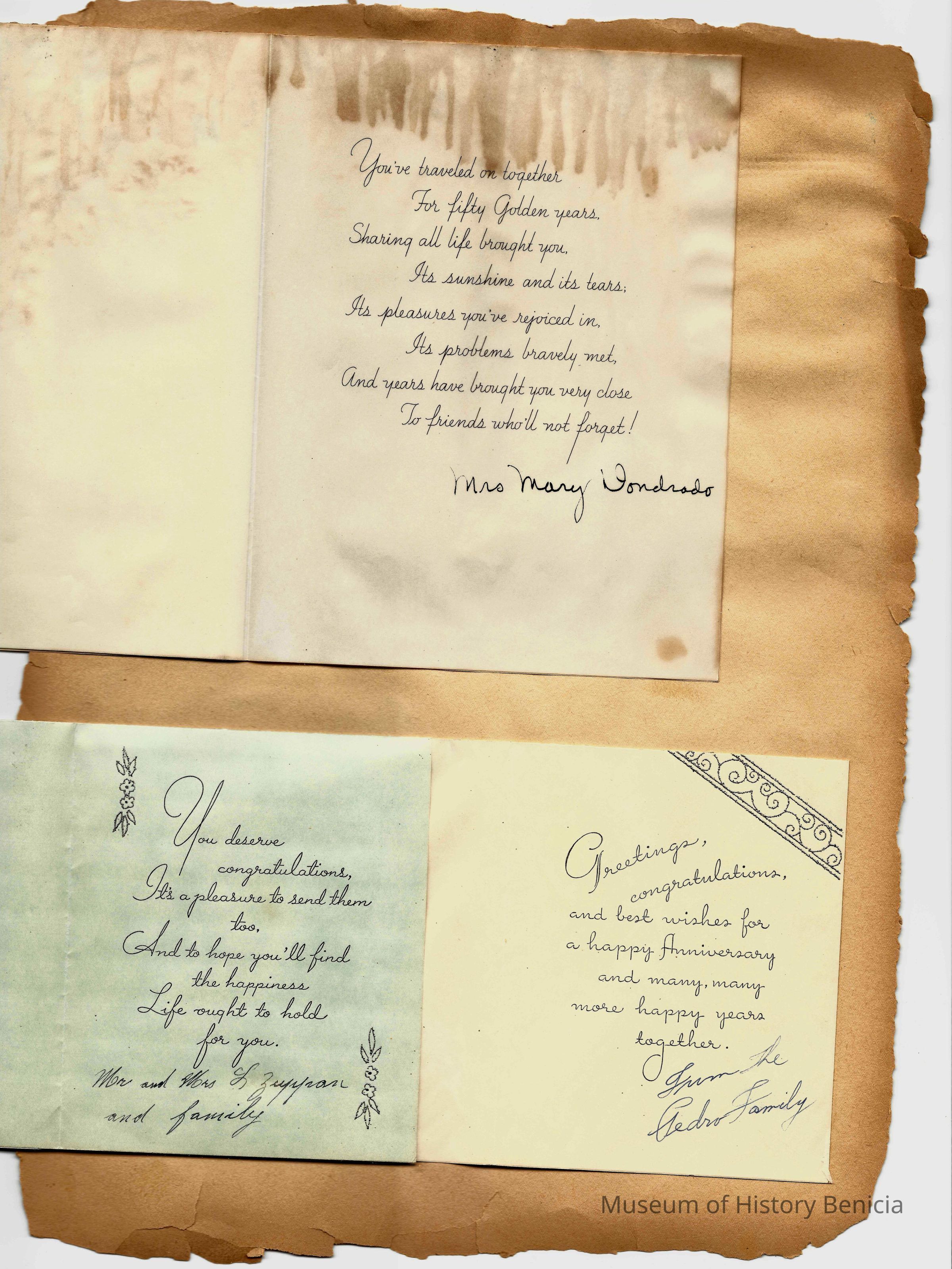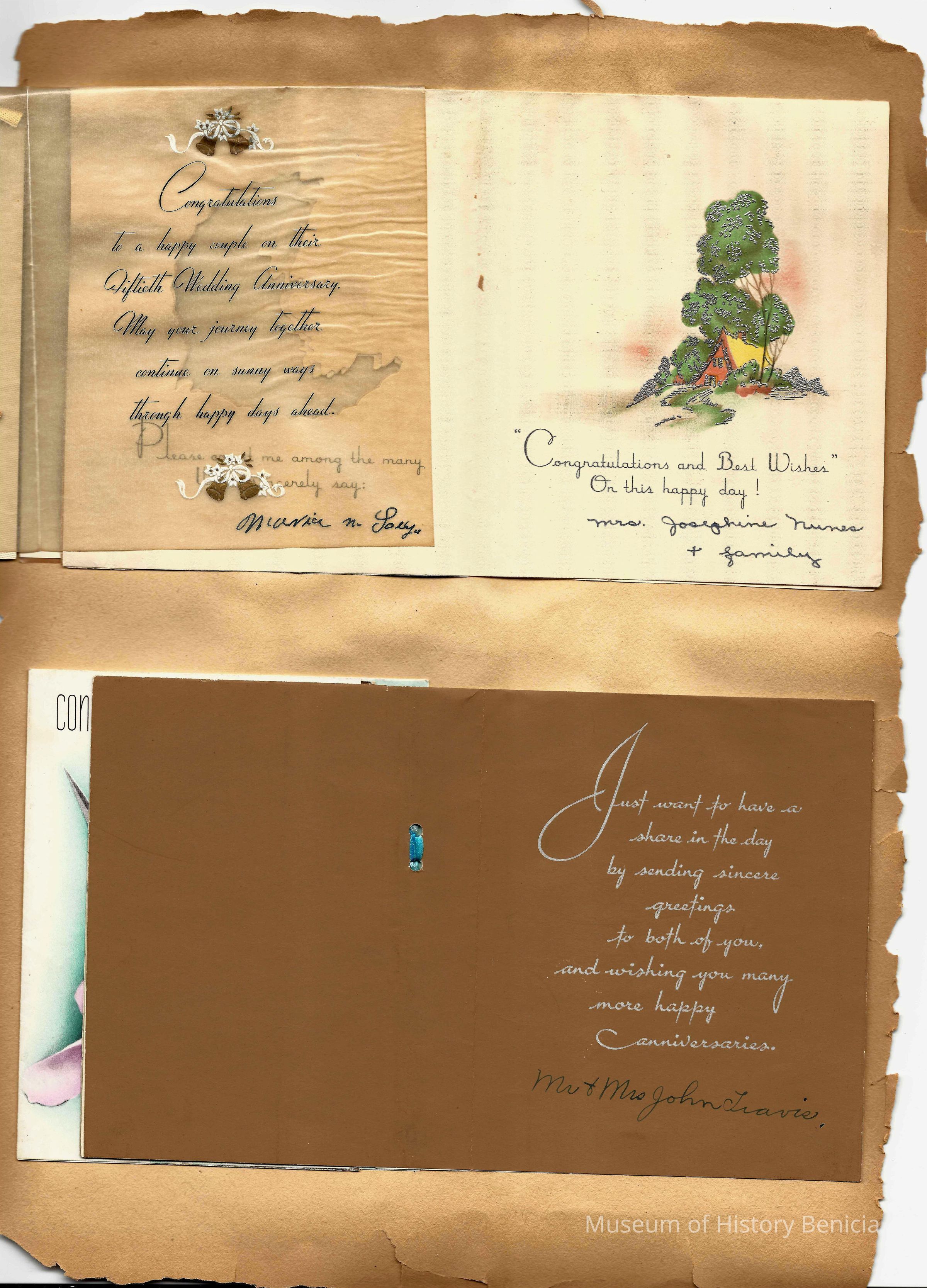 Scrapbook made for the 50th anniversary of Mr & Mrs Joseph DeSilva Sr. The celebration was in 1939 and they were married in 1889. It includes letters, cards, signatures, etc. and an original marriage license for a couple called Silvara. At the back of the scrapbook is a list of people who sent sympathy cards and flower arrangements. The book must have been used for a funeral at some time. This is the scrapbook. It is 11.5" x 15". Items from the scrapbook are accessioned separately.