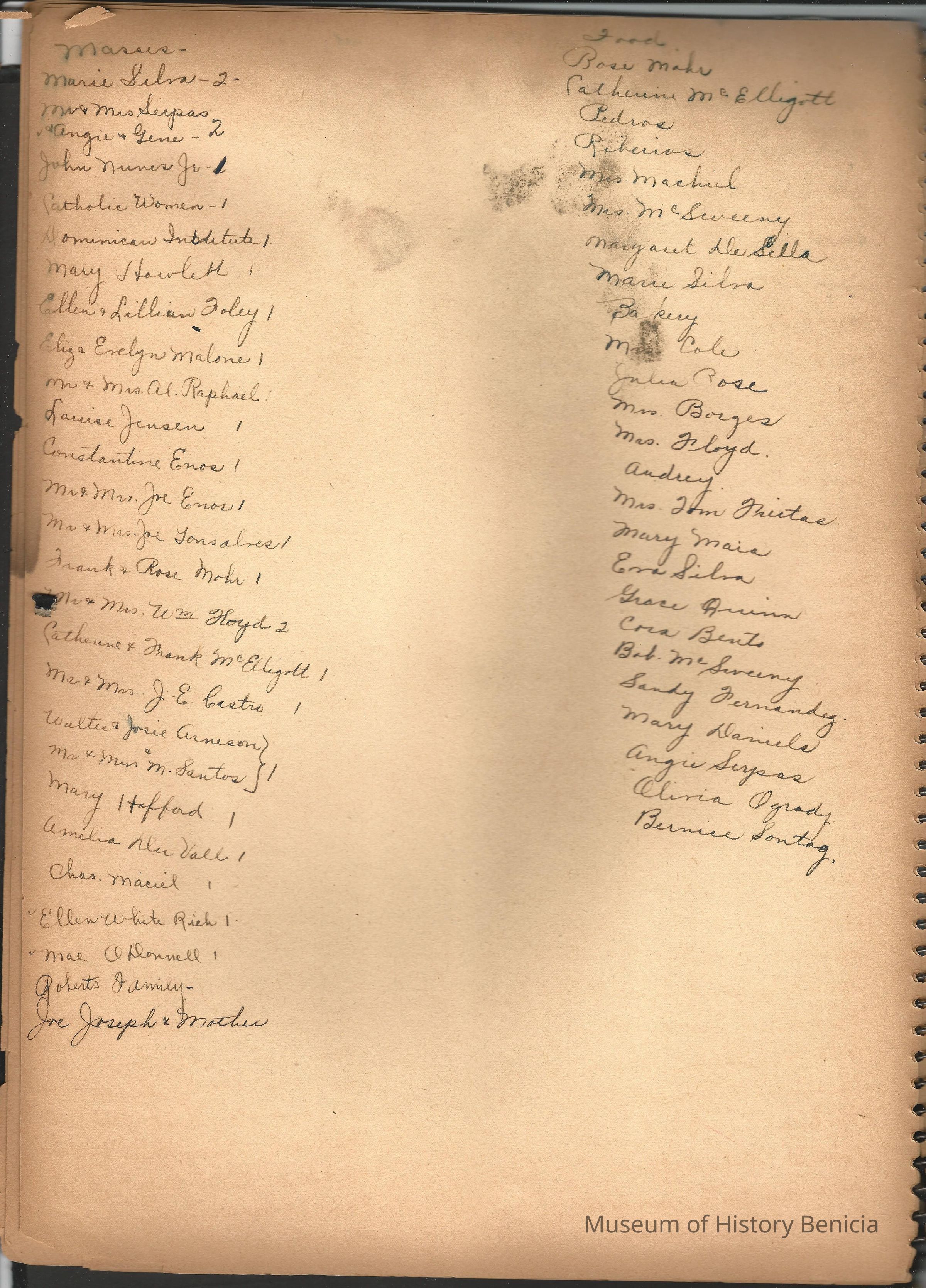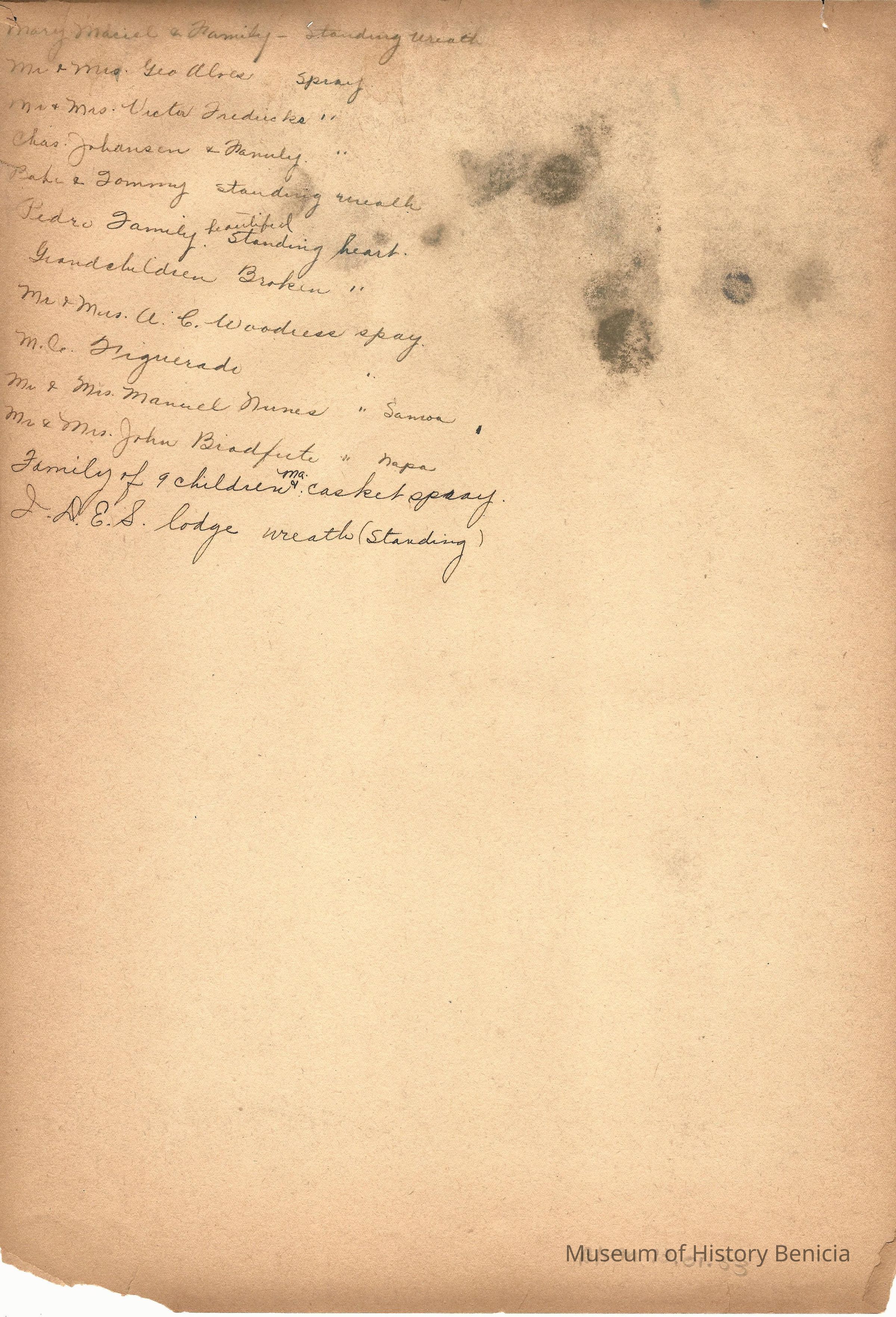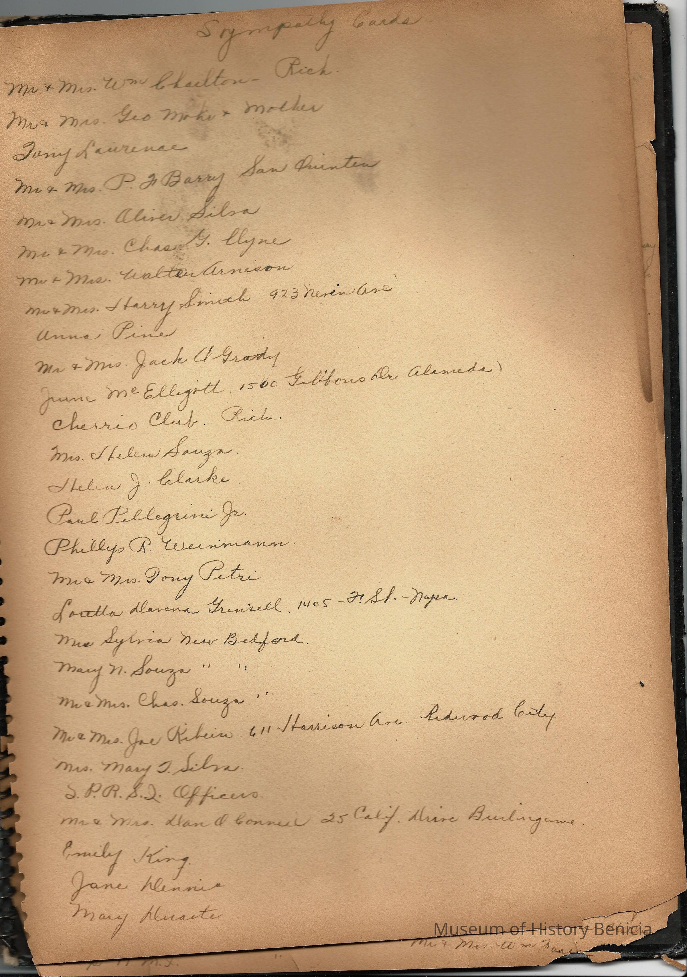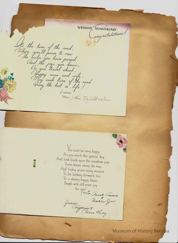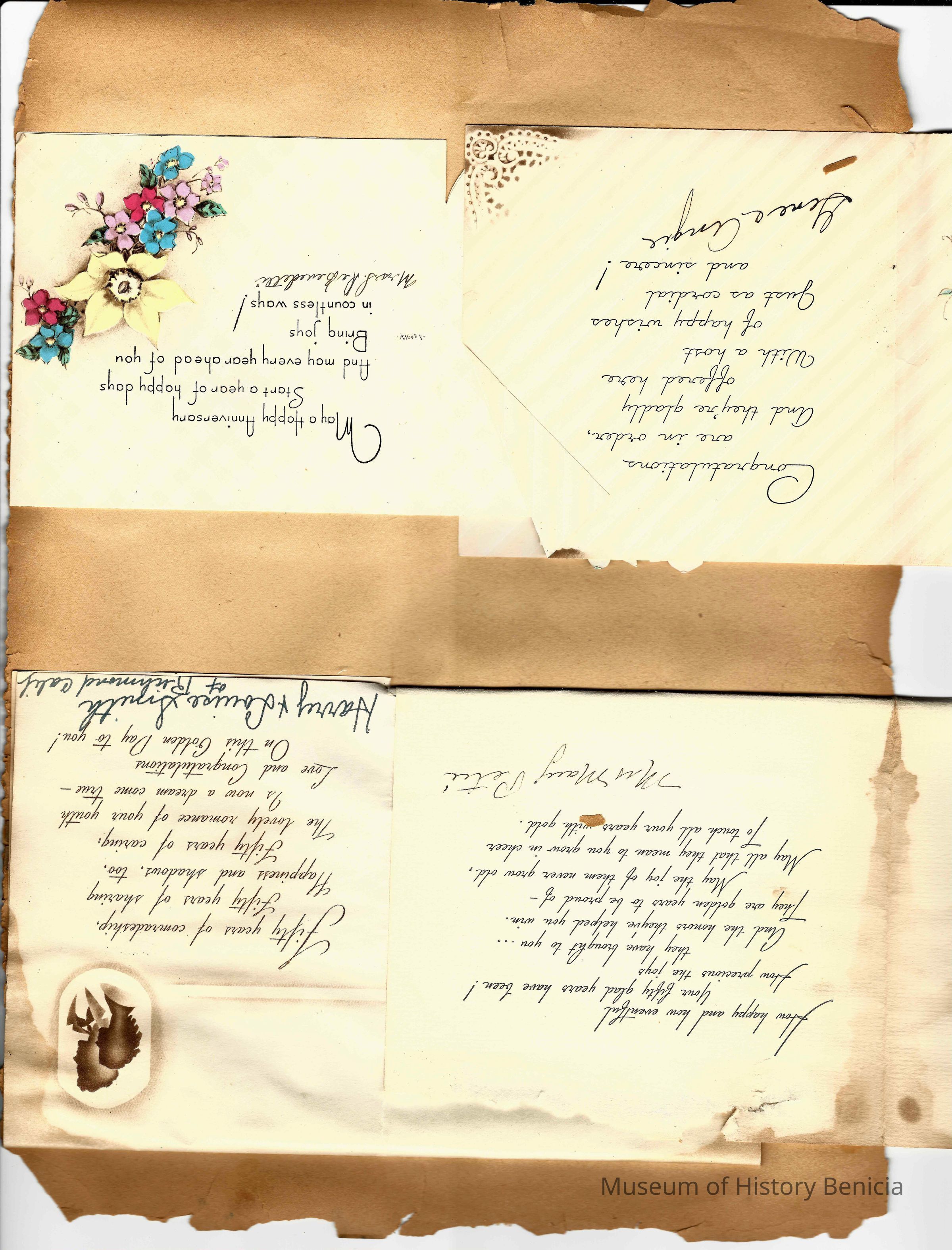 Scrapbook made for the 50th anniversary of Mr & Mrs Joseph DeSilva Sr. The celebration was in 1939 and they were married in 1889. It includes letters, cards, signatures, etc. and an original marriage license for a couple called Silvara. At the back of the scrapbook is a list of people who sent sympathy cards and flower arrangements. The book must have been used for a funeral at some time. This is the scrapbook. It is 11.5" x 15". Items from the scrapbook are accessioned separately.