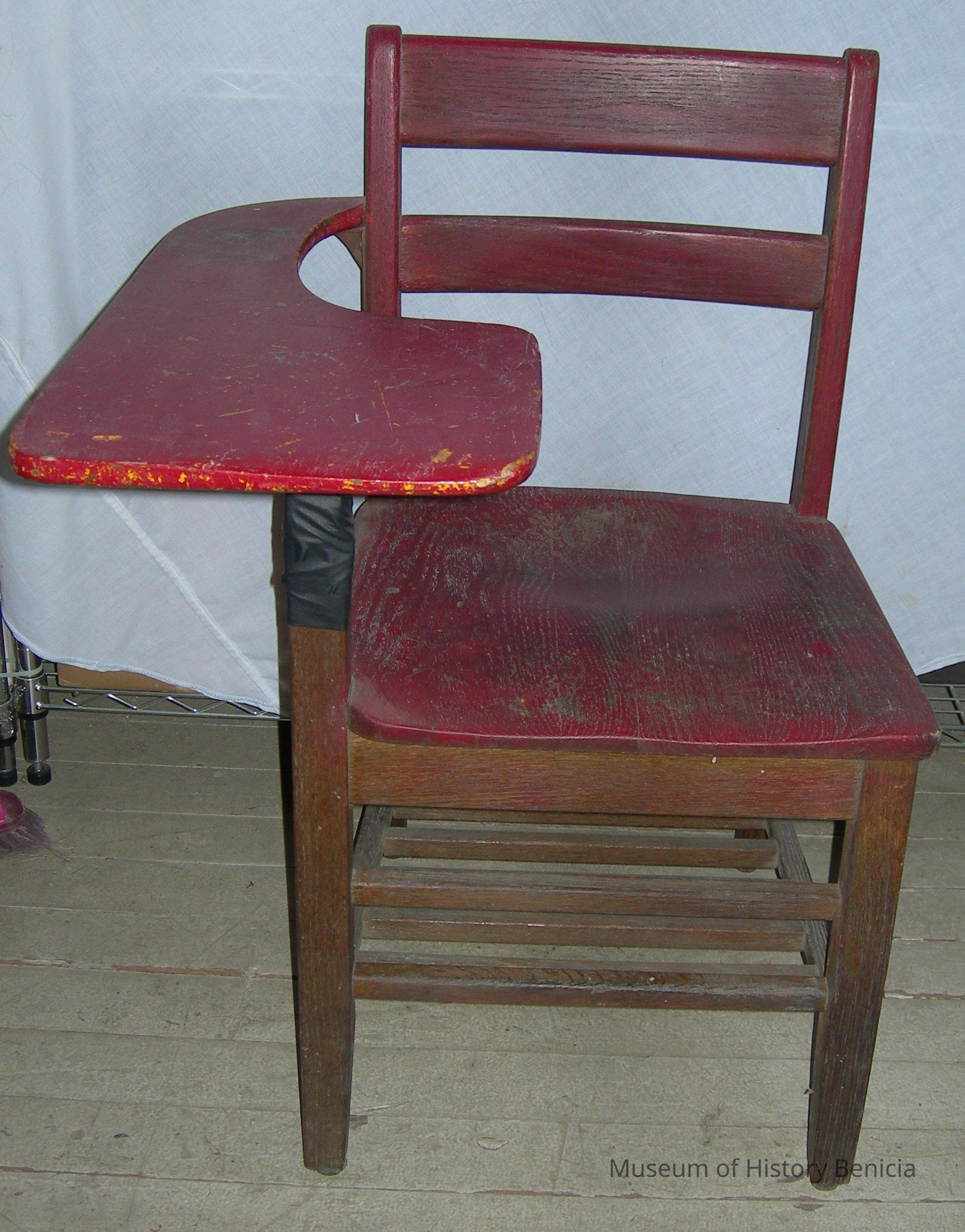 has arm rest with room to write on right side; storage shelf underneath seat to hold books; underside of the seat in large white letters: BHSCollection