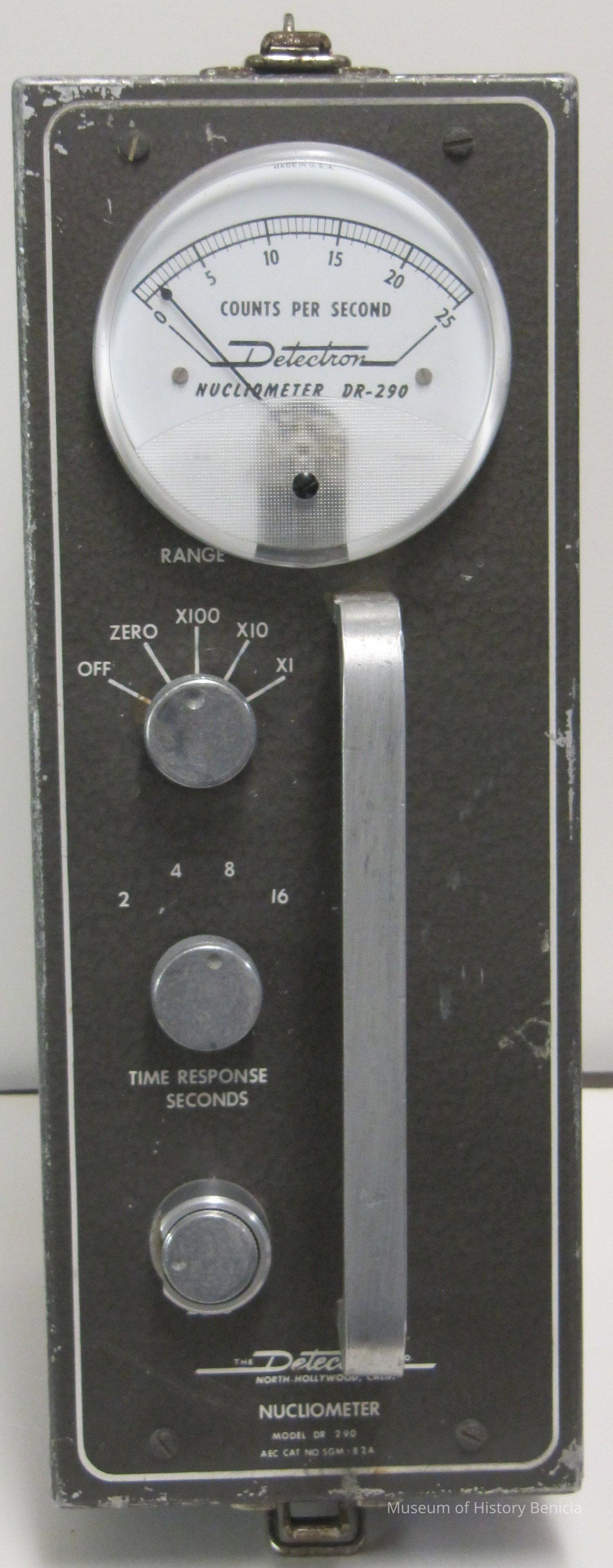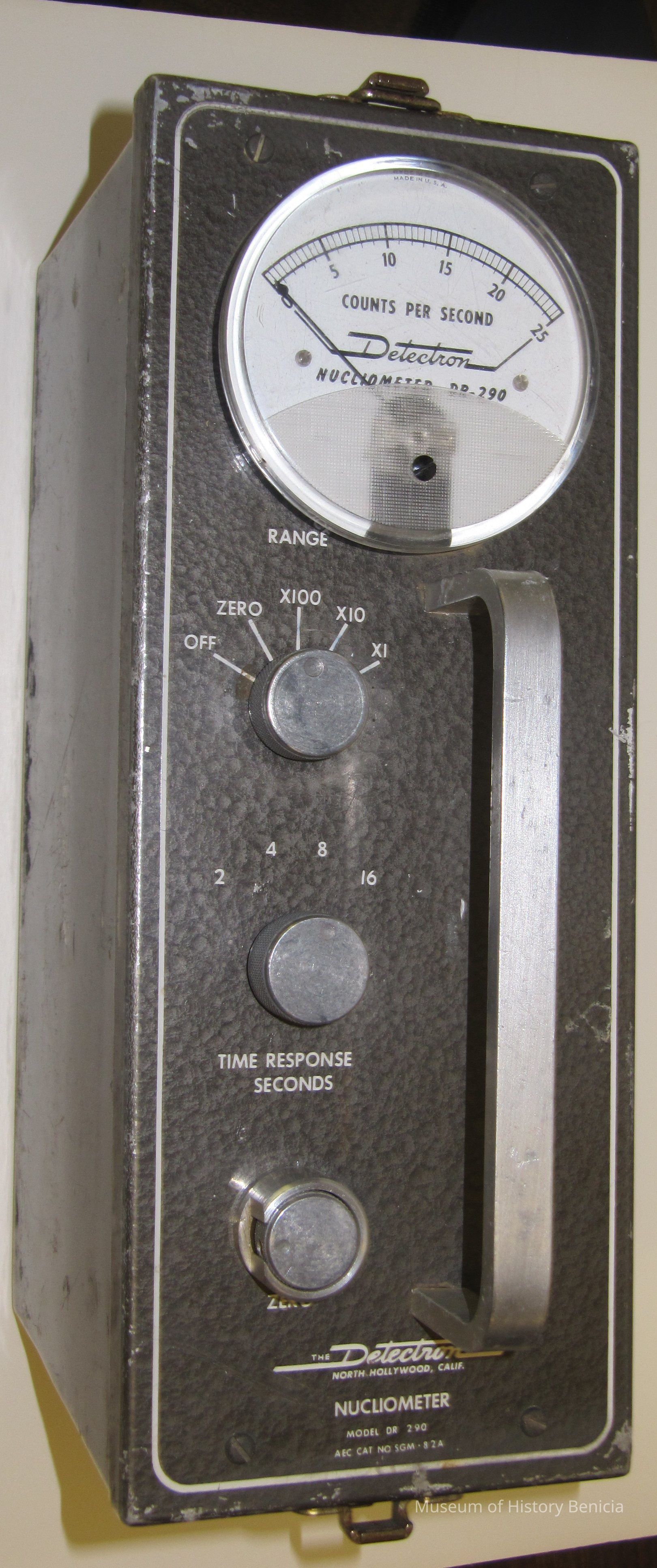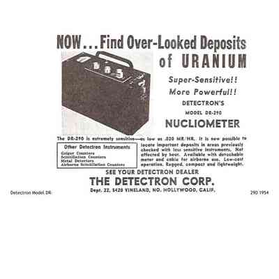 The Nucliometer Model DR-290 was offered in 1954. It was a super-sensitive instrument measuring to 0.02 mR/h. It was designed to recheck areas where less sensitive equipment may have overlooked the deposits. It was unaffected by desert heat. It was available with a detachable meter and cable for airborne use. It was low cost and lightweight. It was also available with the new bismuth tube. It sold for $545.Collection