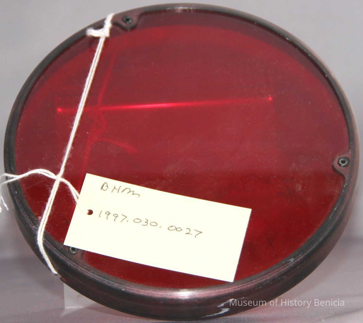 Darkroom red plastic lens in a metal holder. Used to cover a light? 1JC7132-G1 on inside of rim.