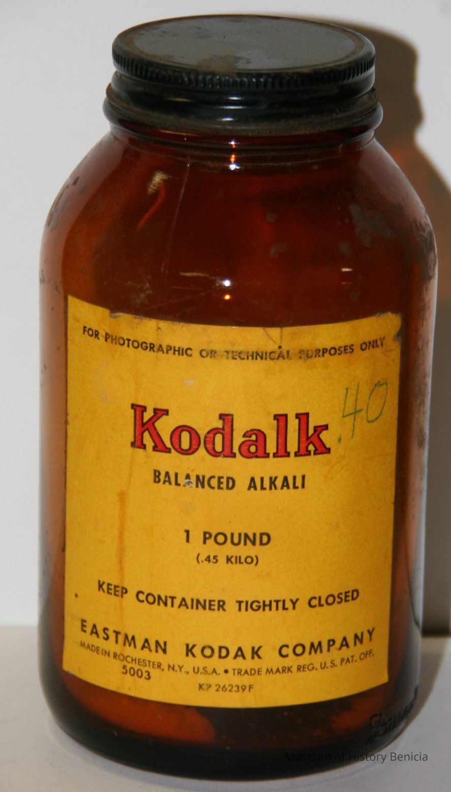 Empty bottle of 1 pound Kodak Balanced Alkali chemical for photo developing. Inventory sheet #1433 says this was found in the store room. No donor number recorded in the inventory book.Collection