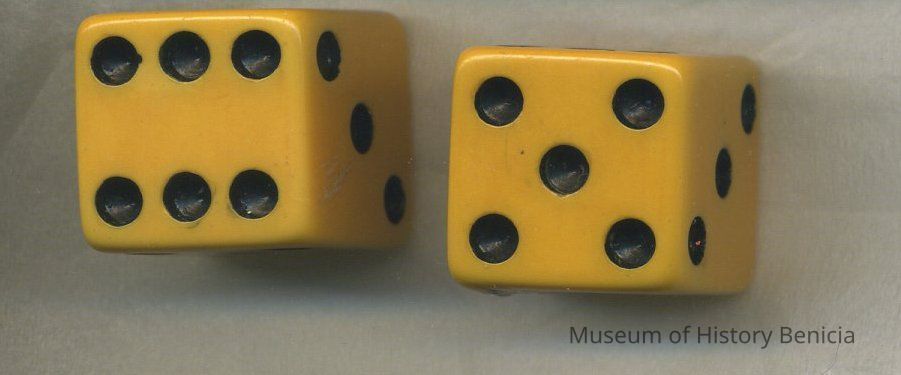 Set of dice - yellow plastic with black painted divots (from one to six) on each side 9/16" square