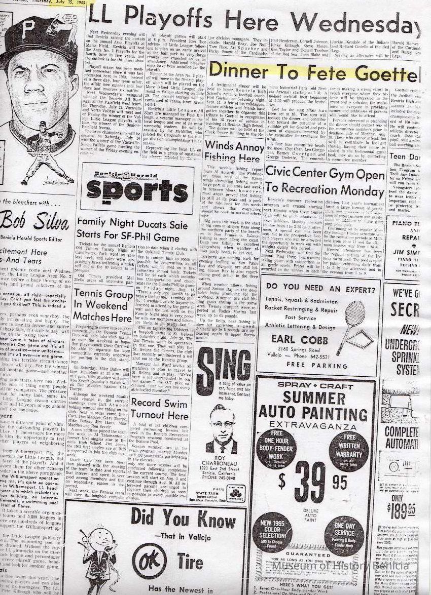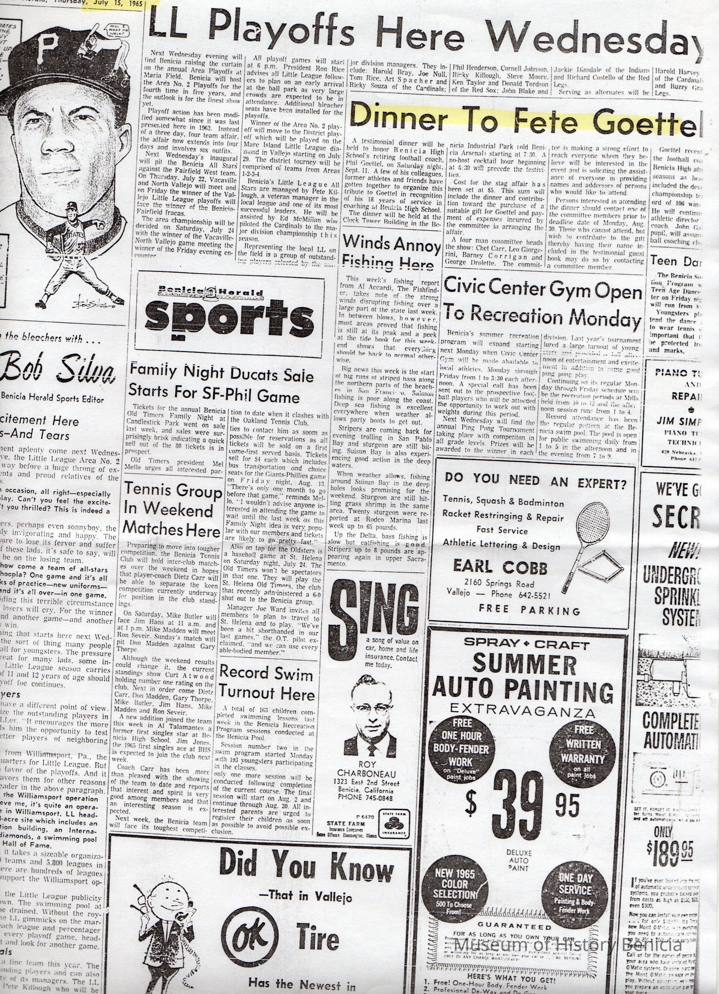Photocopy of Benicia Herald newspaper article about Phil Goettel. July 15, 1965 - Dinner to Fete Goettel