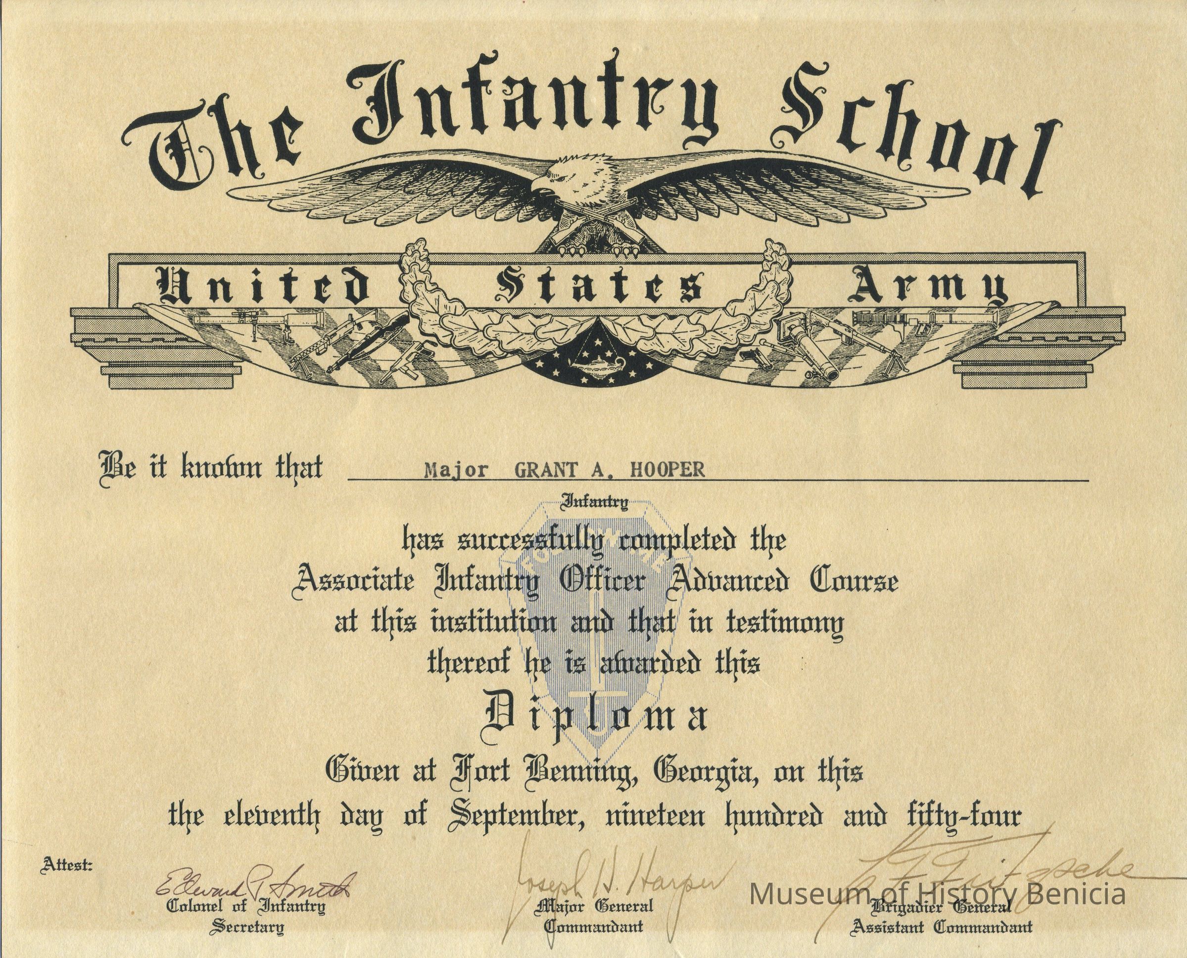 Diploma: The Infantry School, U.S. Army, Major Grant Hooper completed the Associate "Infantry Officer Advanced Course" at Fort Benning, Georgia, on 11th day of September 1954.