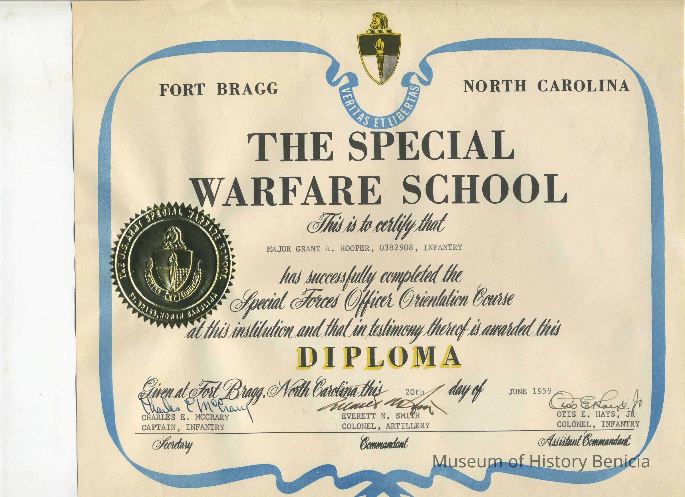 Diploma: The Special Warfare School, Major Grant Hooper completed "The Special Forces Officer Orientation Course" at Fort Bragg, North Carolina, 20th day of June 1959.