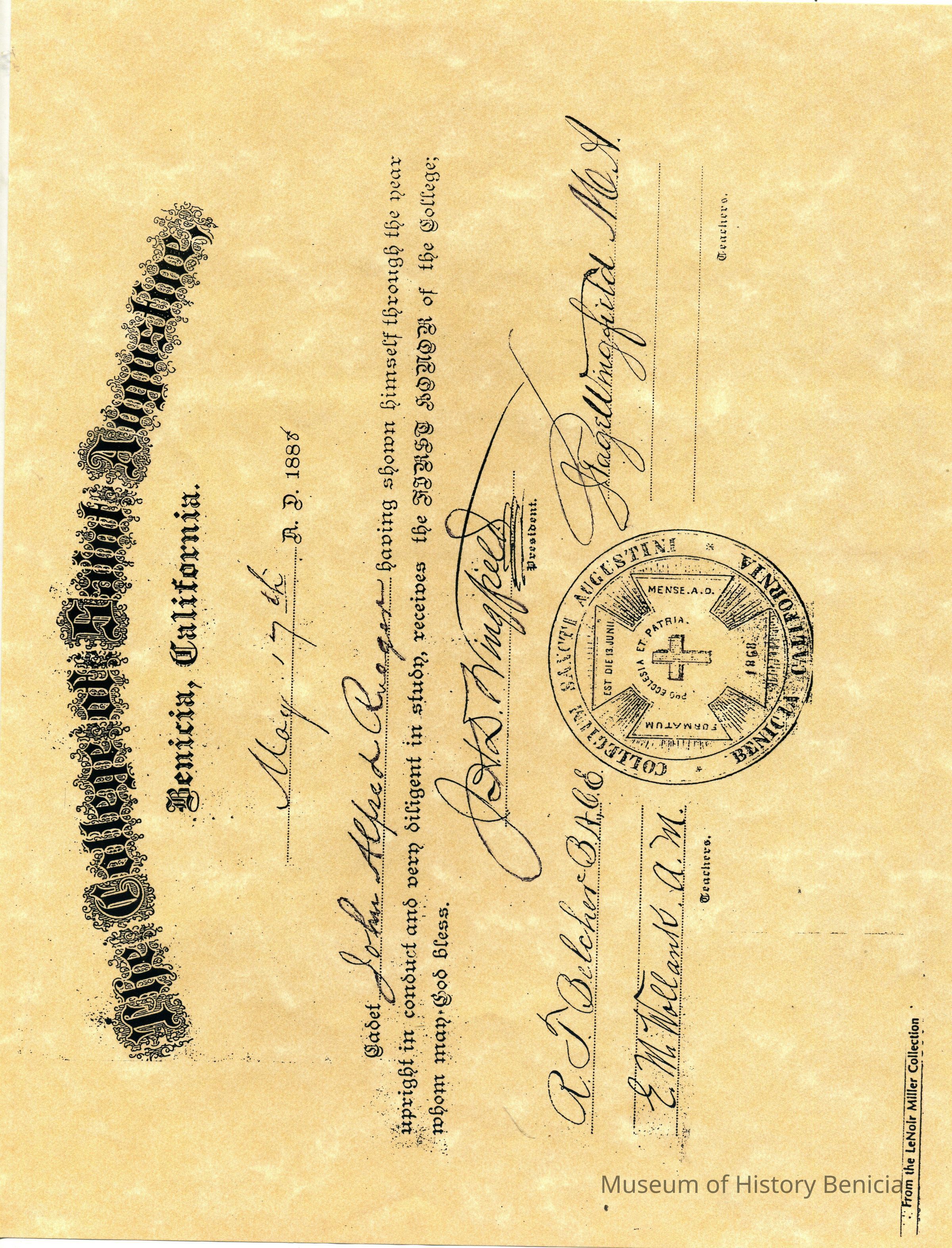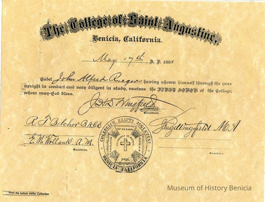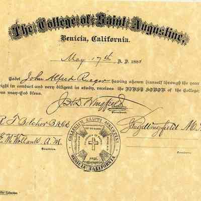 This is a diploma from St. Augustine's College given to John Alfred Rueger on May 7th, 1888. He is graduated with "First Honor". The diploma looks like a copy of the original.Collection