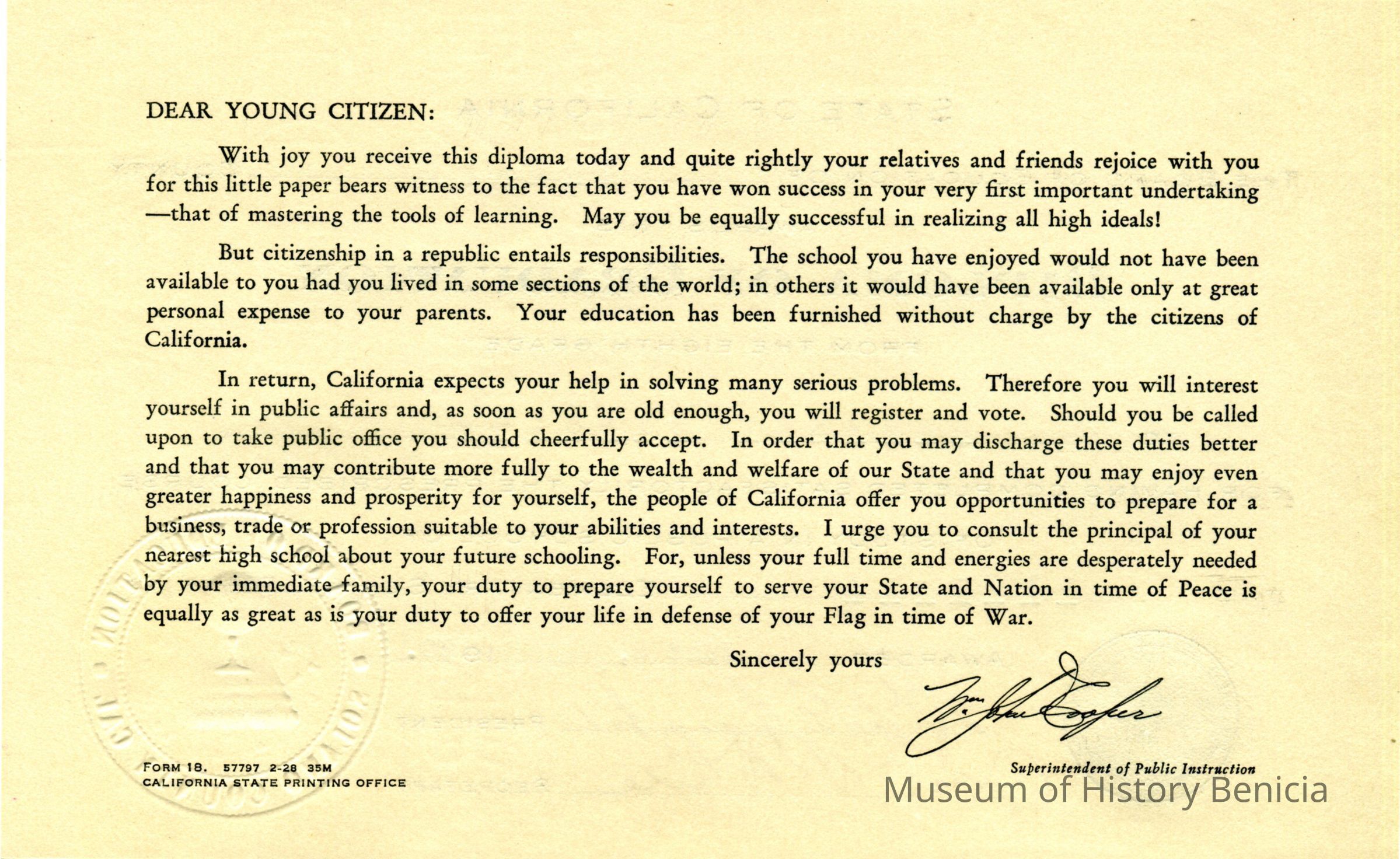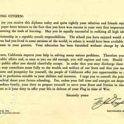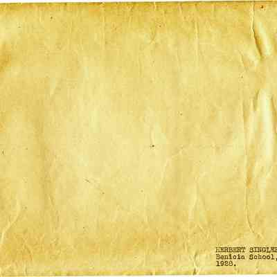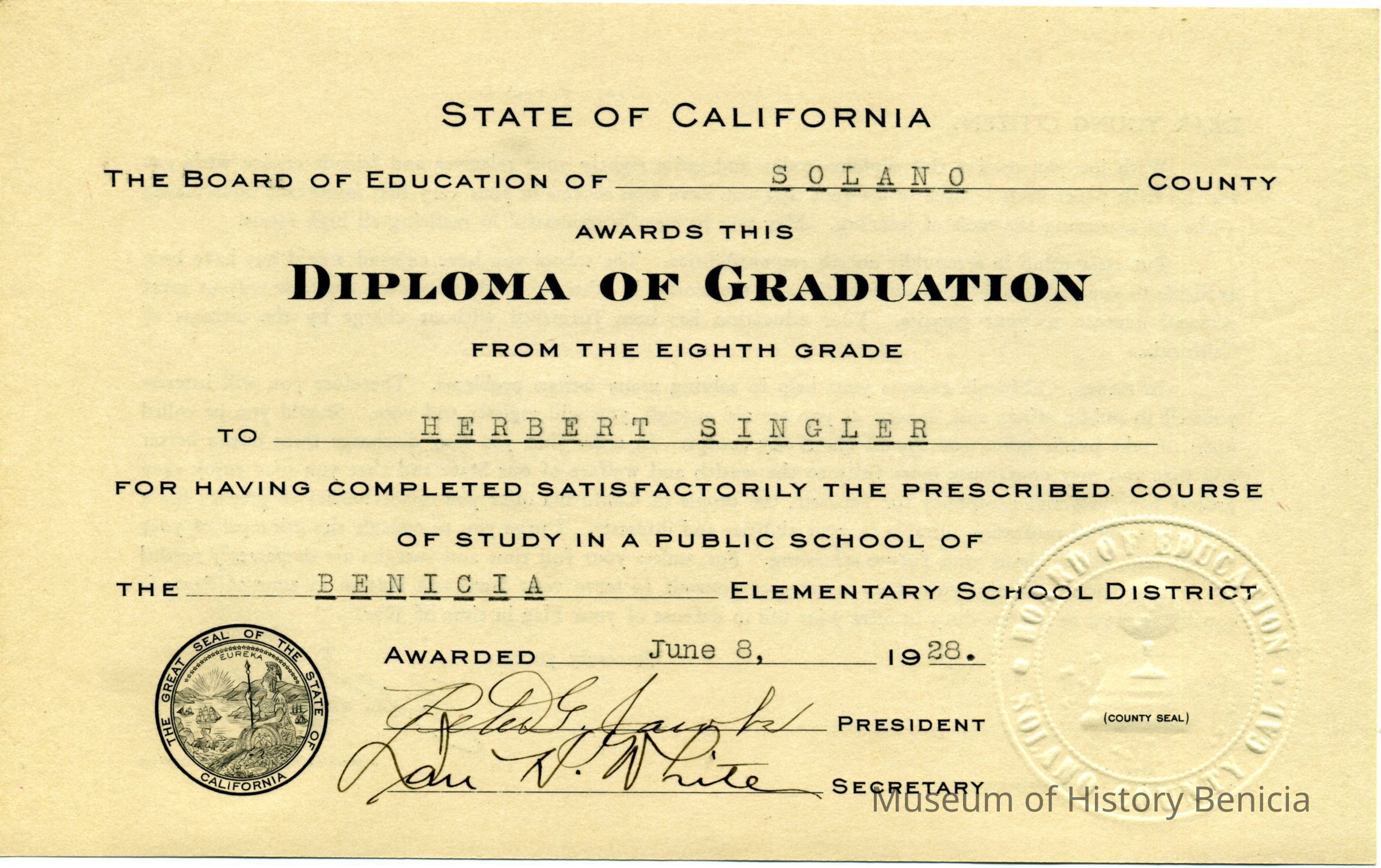 This is a diploma for Herbert Singler from the eigth grade in Benicia schools. It is in a paper holder with "Solano County Schools California" stamped in gold on the outside.