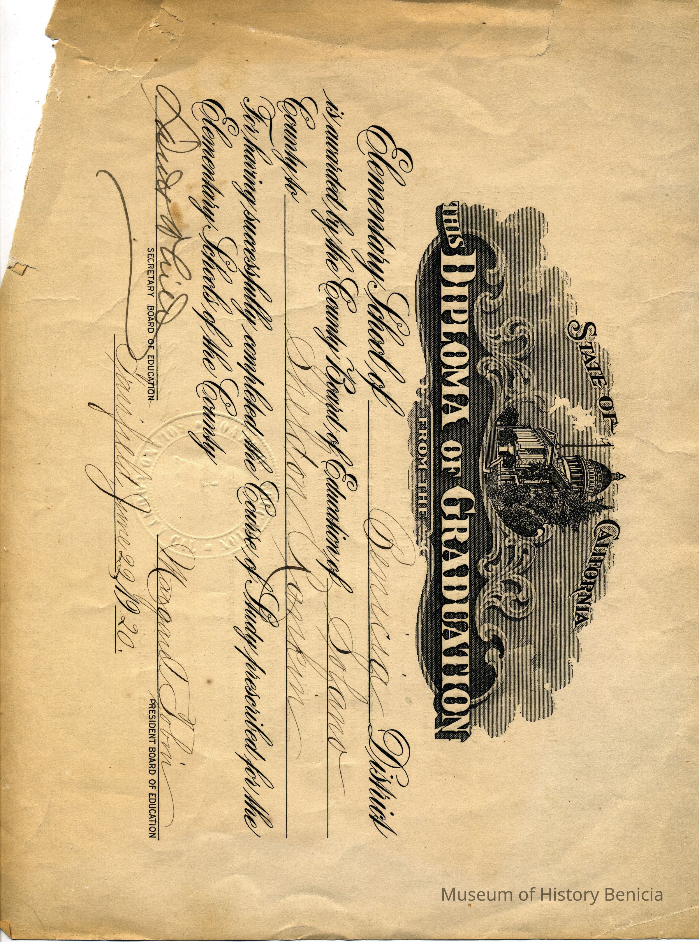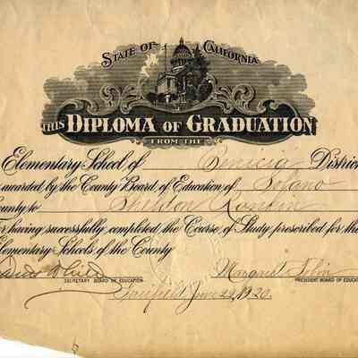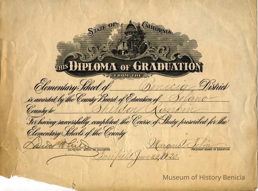 Certificate of Graduation from the Benicia District for Sheldon Rankin dated 06/22/1920. It is signed by Margaret Tobin and David White.