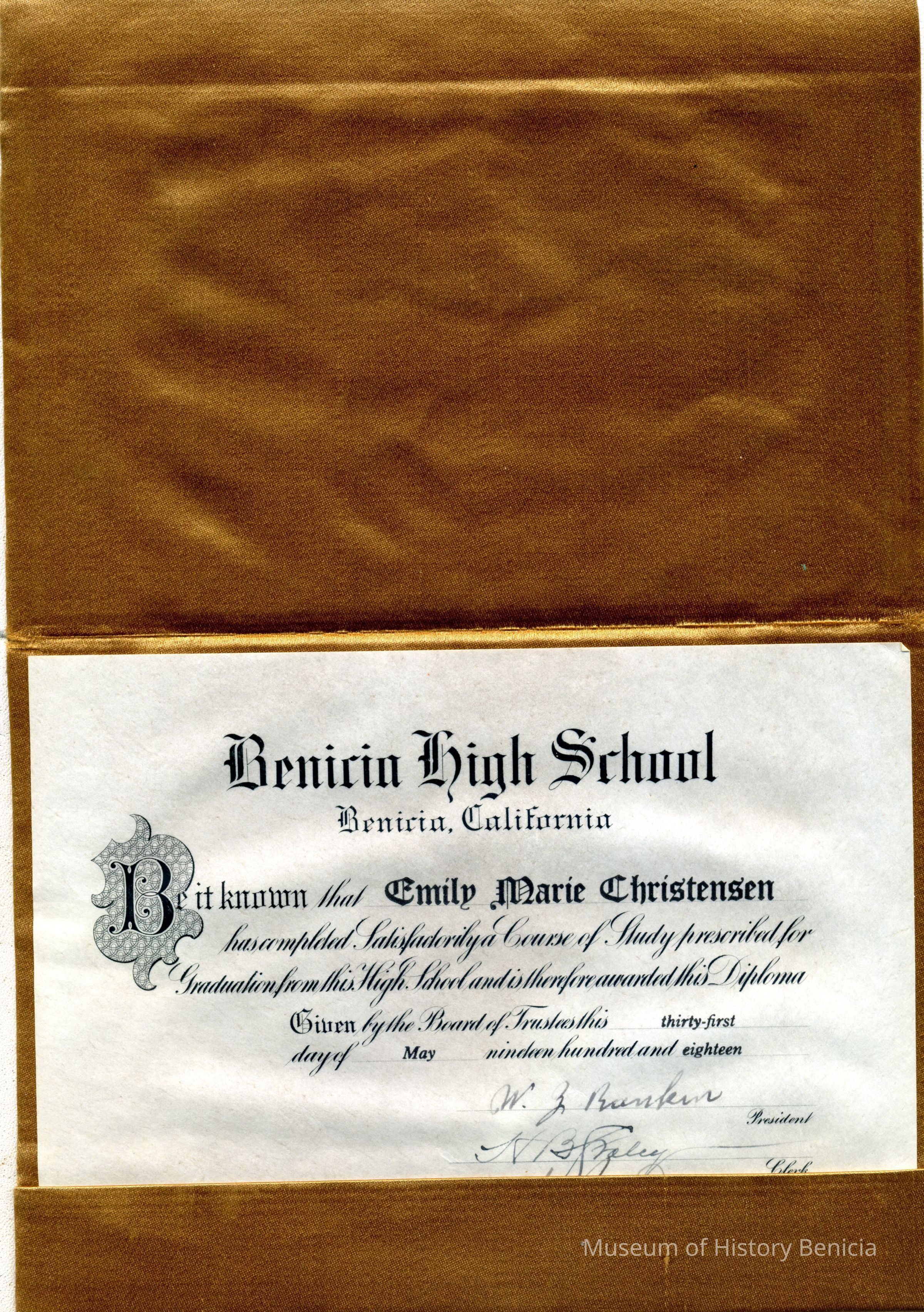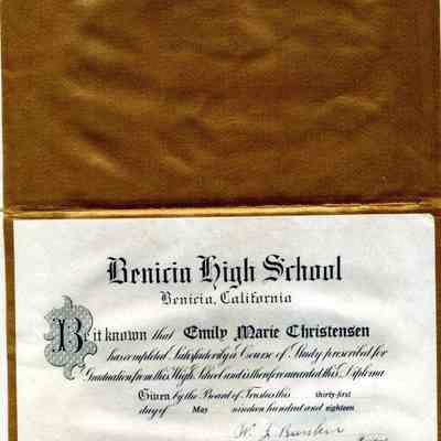 A diploma for Emily Marie Christensen from Benicia High School for 1918 in a calfskin cover.