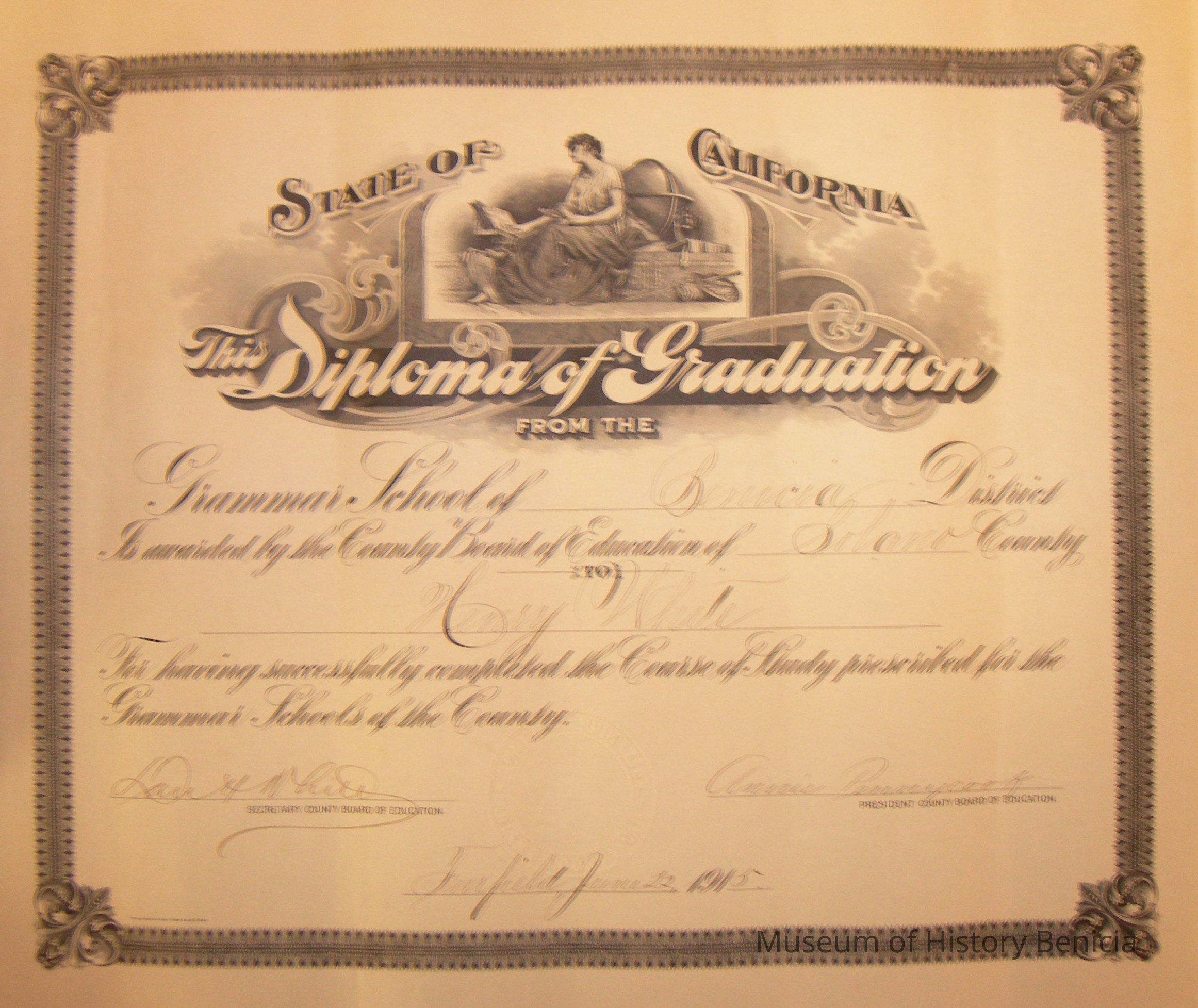 This Diploma of Graduation / from the / Grammar School of Benicia District is awarded by the County Board of Education of Solano County / to / Henry White