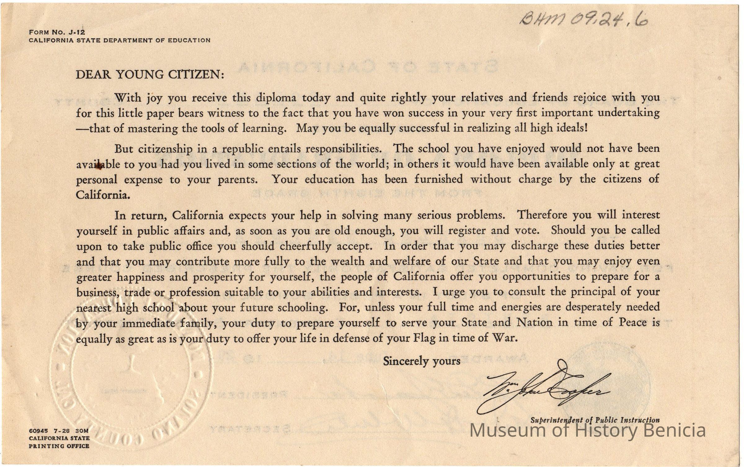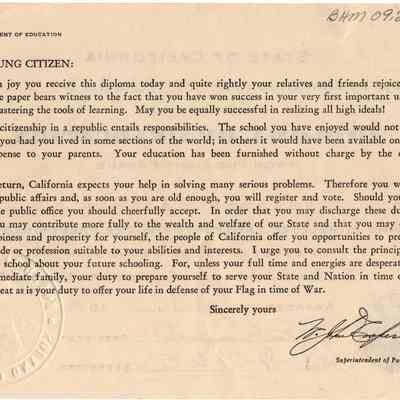 note on back "Dear Young Citizen...." talks of student's obligations and responsibilities of citizenship in a republic; also duty to State and Nation in time or Peace or time of War.