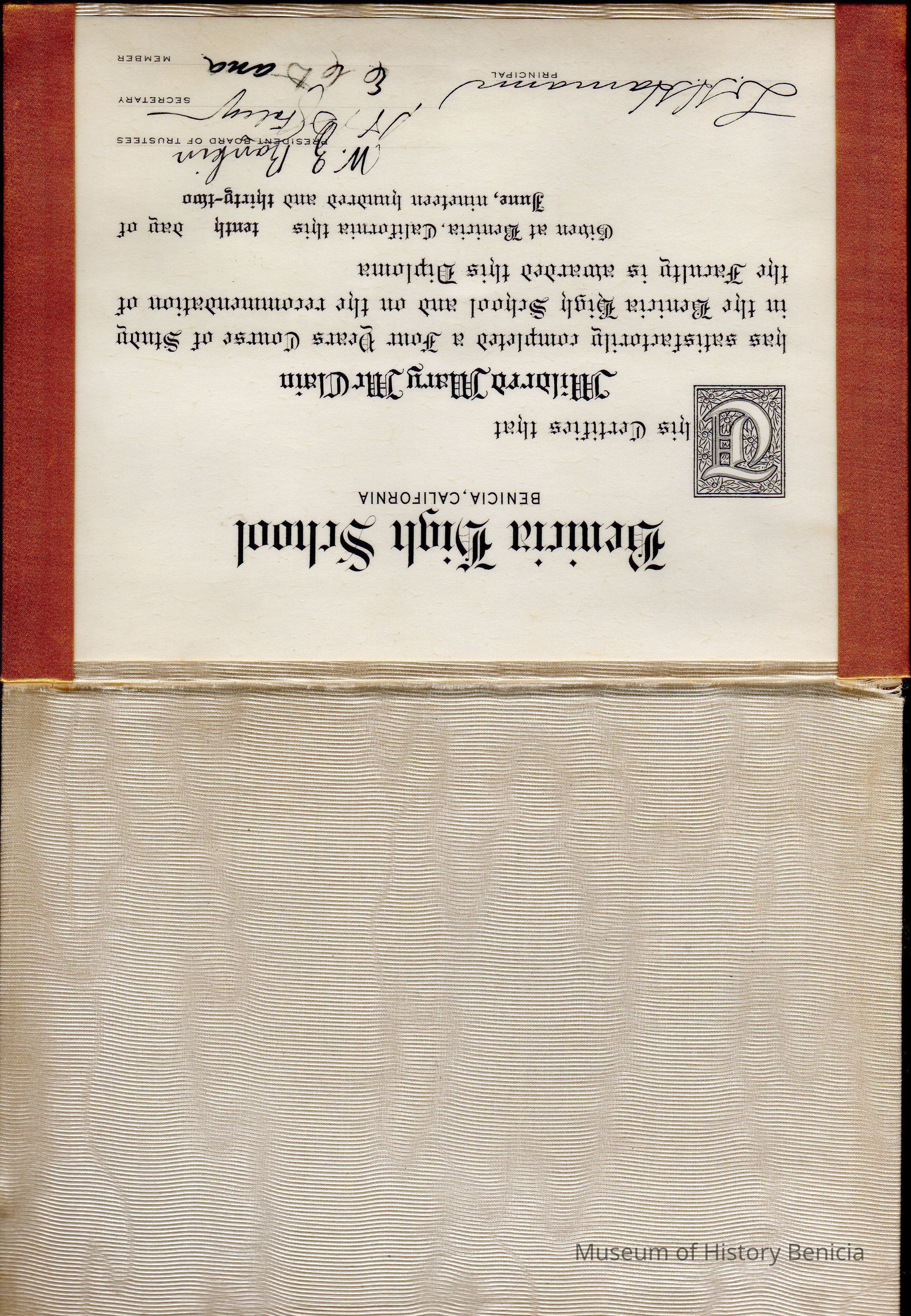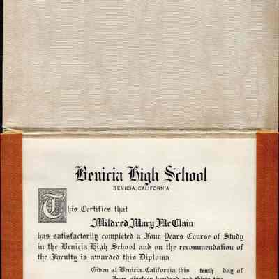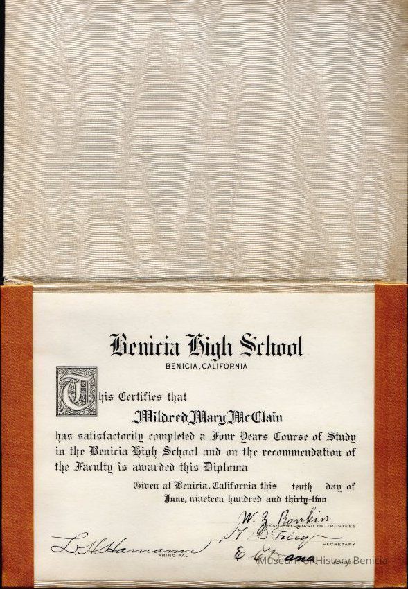 Mildred McClains Benicia High School diploma from 1932.