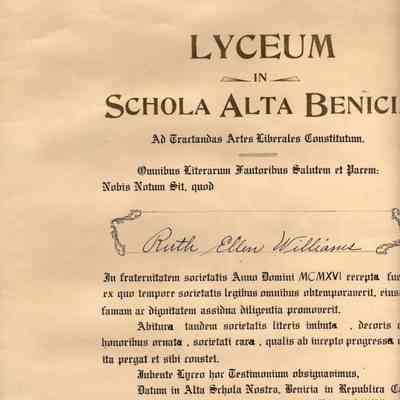 greets the supports of all things literary and lets everyone know that Ruth Ellen Williams gave testimony and followed the laws of the society to give contant care and promote all things literary. That she is about to leave and is honored as society rarely honors. Her testimony was sealed by order of the Lycem in 1916.