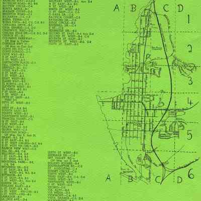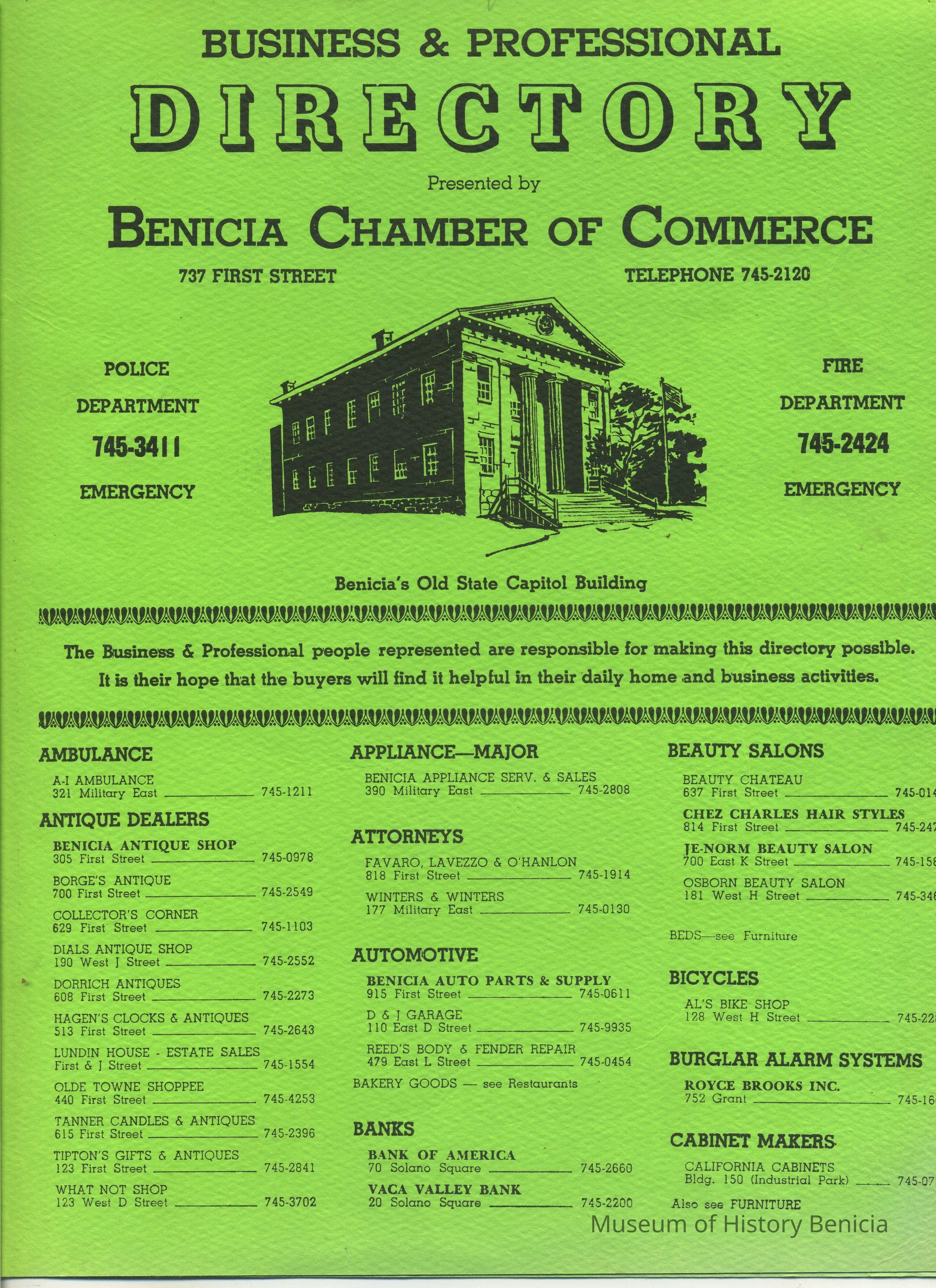 Includes various businesses, listed by type, along with emergency numbers (police and fire) and a map/street listing on the back