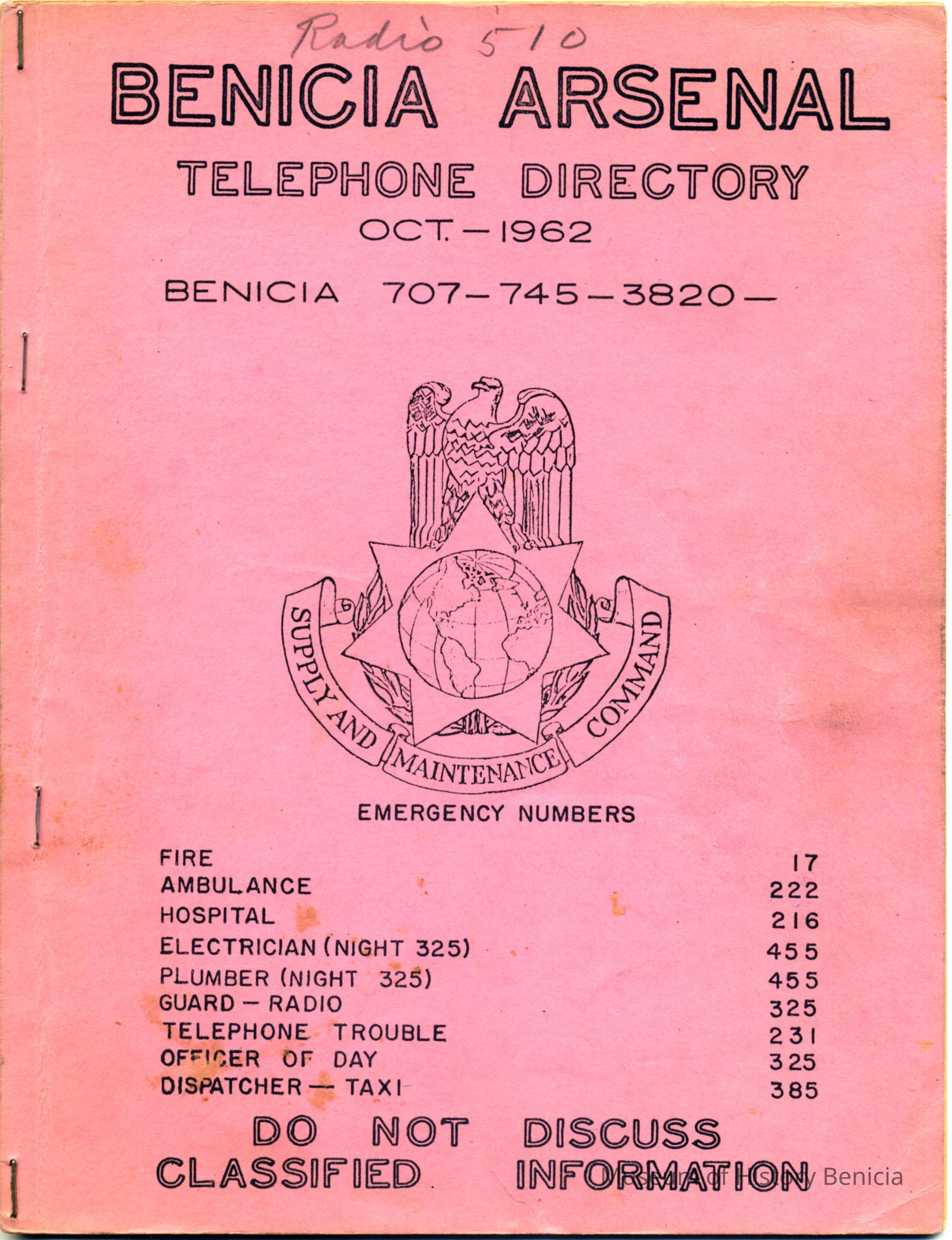 This is a Benicia Arsenal telephone directory for October, 1962.