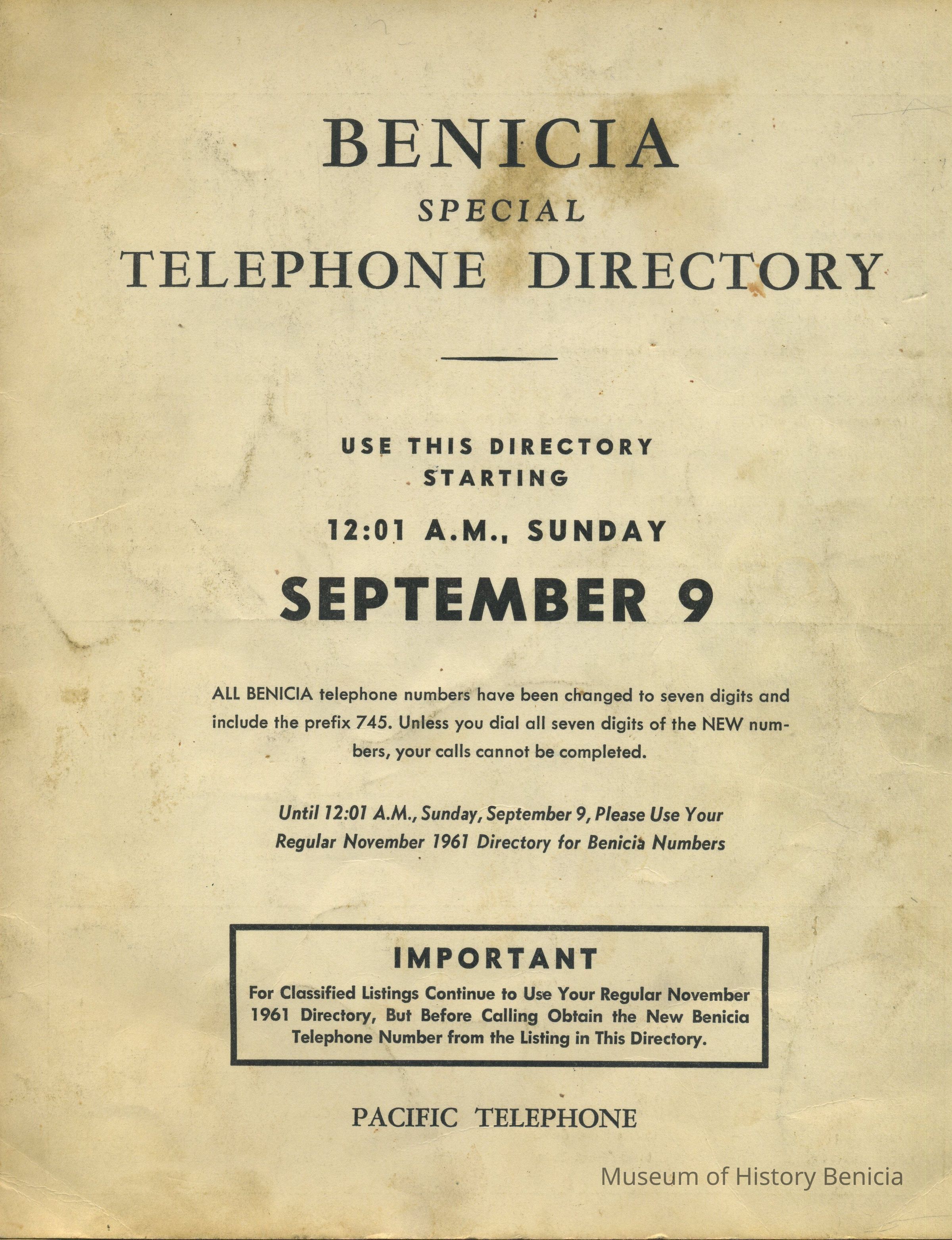 Benicia Special Telephone Directory took effect