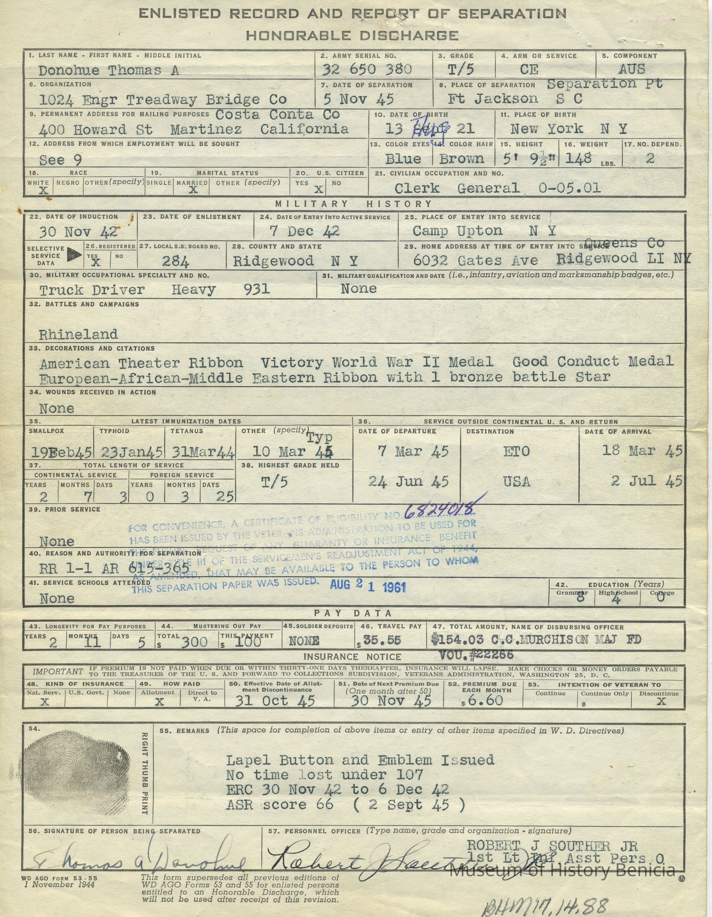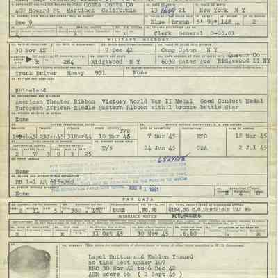 on reverse are listed his personal information, military history, pay data and insurance notice; his right thumb print is included with the fact he was given the Honorable Discharge lapel button and emblem.