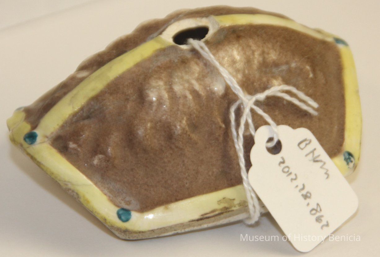 Painted ceramic top for camel # 2012.028.0675. it is shaped like the back of a camel.