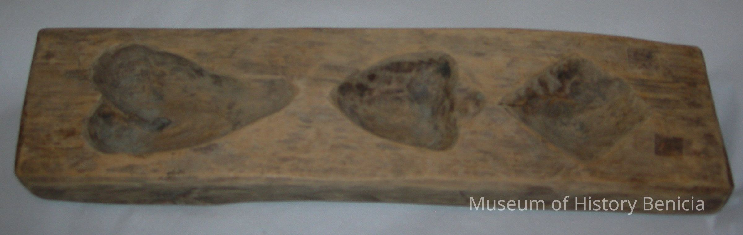 a rectangular piece of wood with three indentations carved into it (for serving food, perhaps nuts?) the shapes are from top to bottom a heart, spade and diamond (card suits); it is fairly smooth on top but a little rough hewn on the bottomCollection