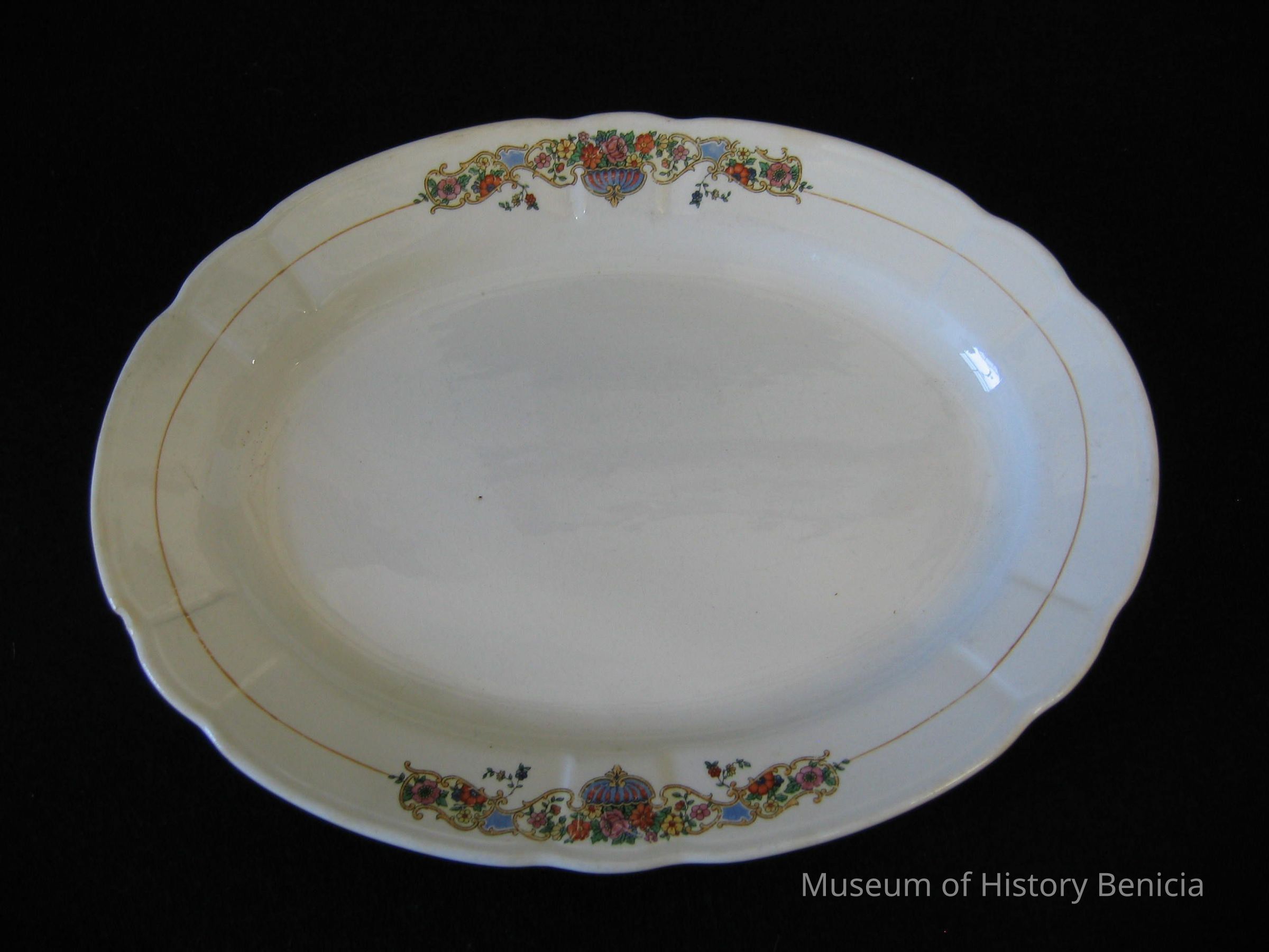 Oval serving dish with two floral designs. On the back is stamped "K. T. & K. Ivory"