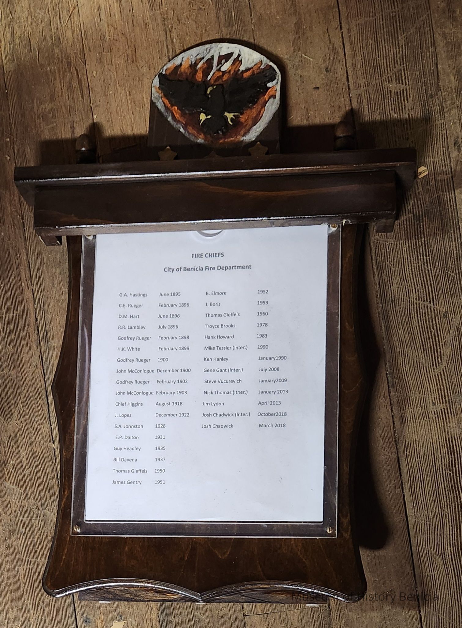 Display of Fire Chiefs of the Benicia Fire Department, tabletop display on wood with plexiglass protective cover.