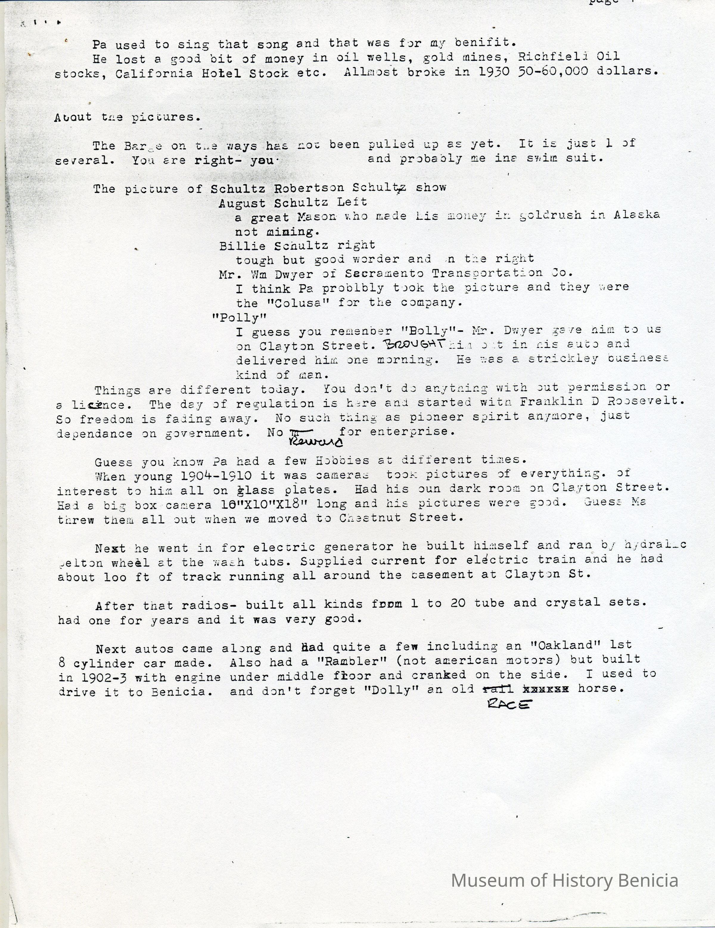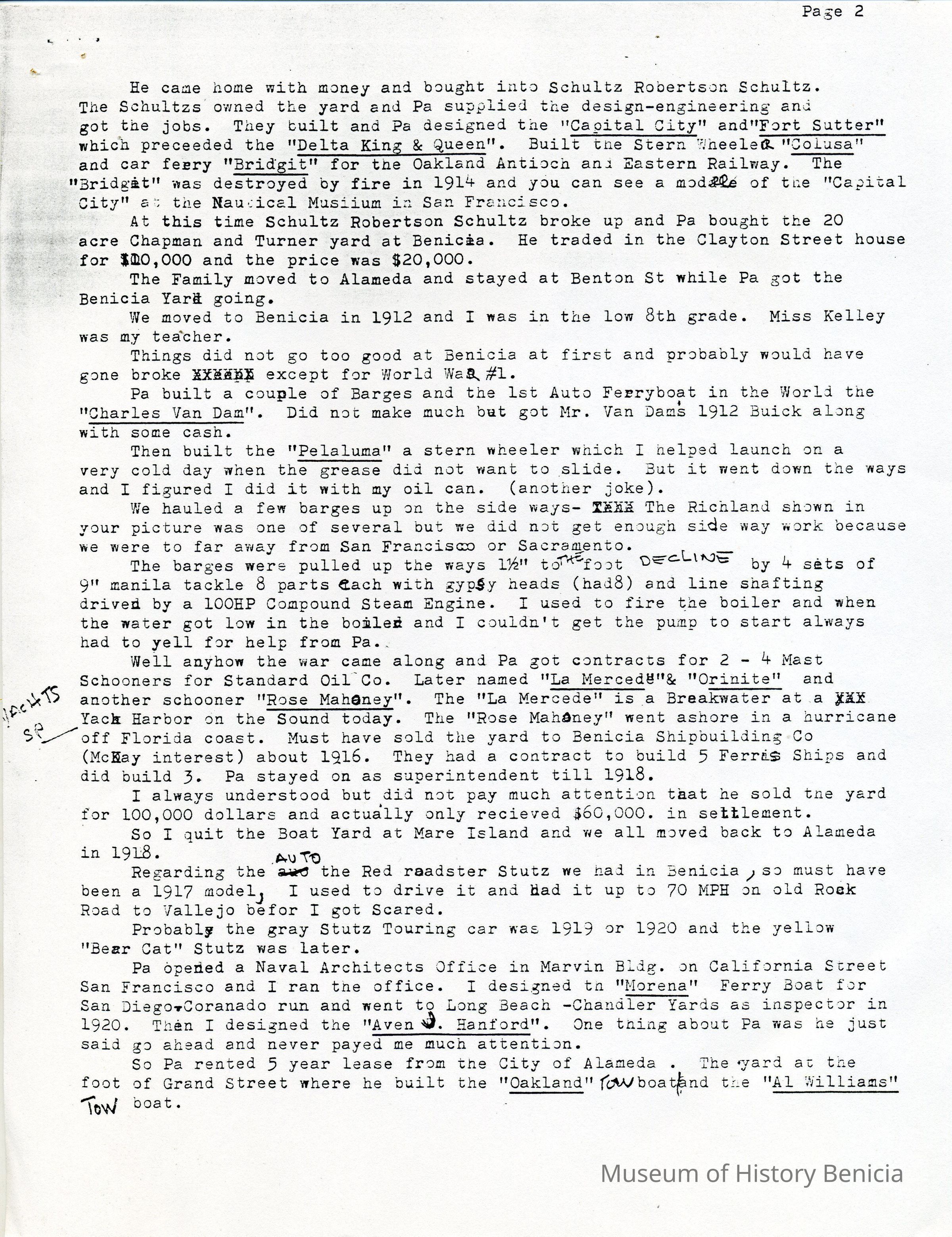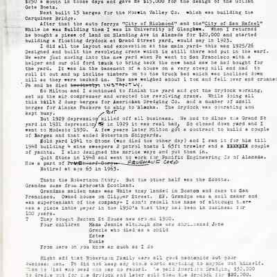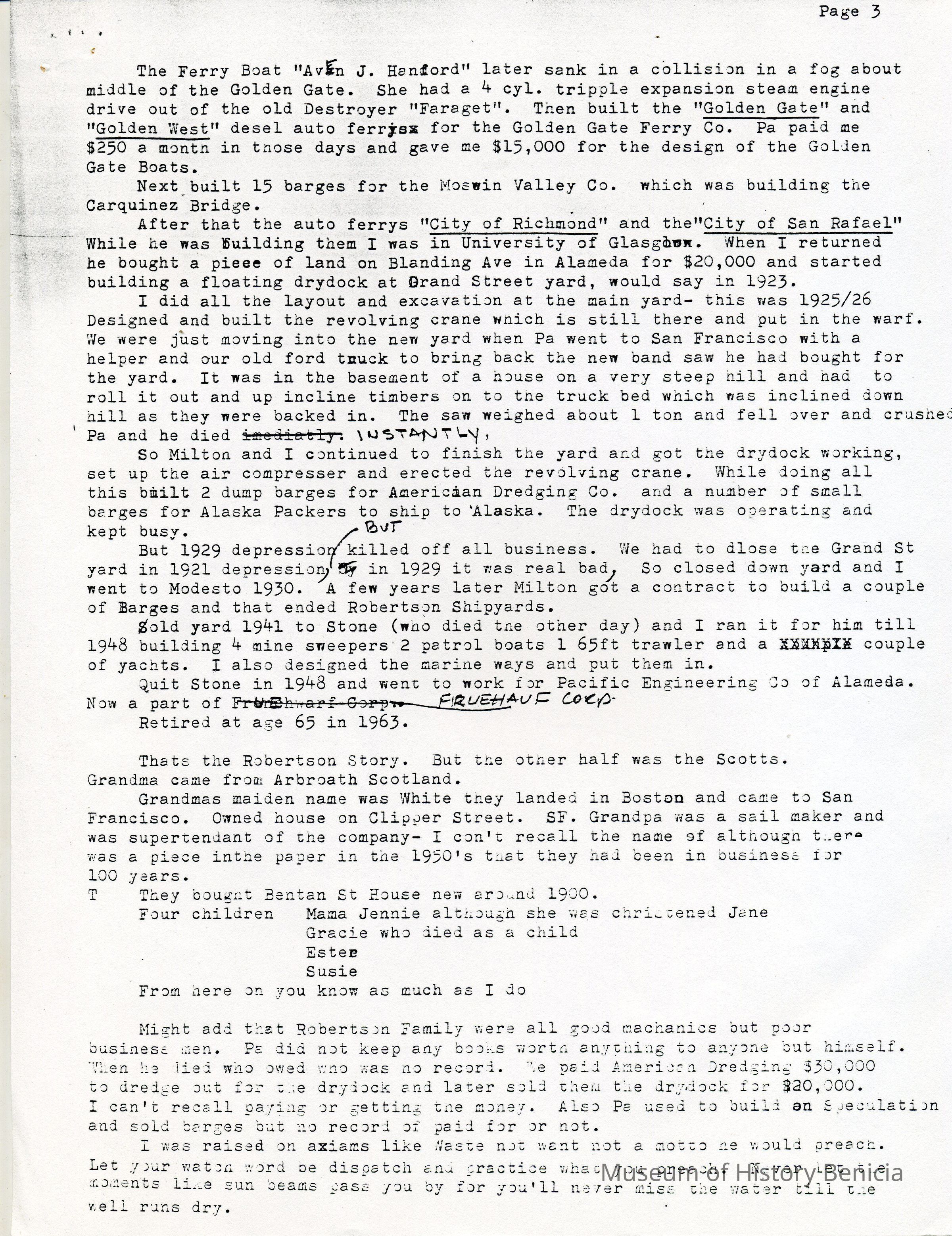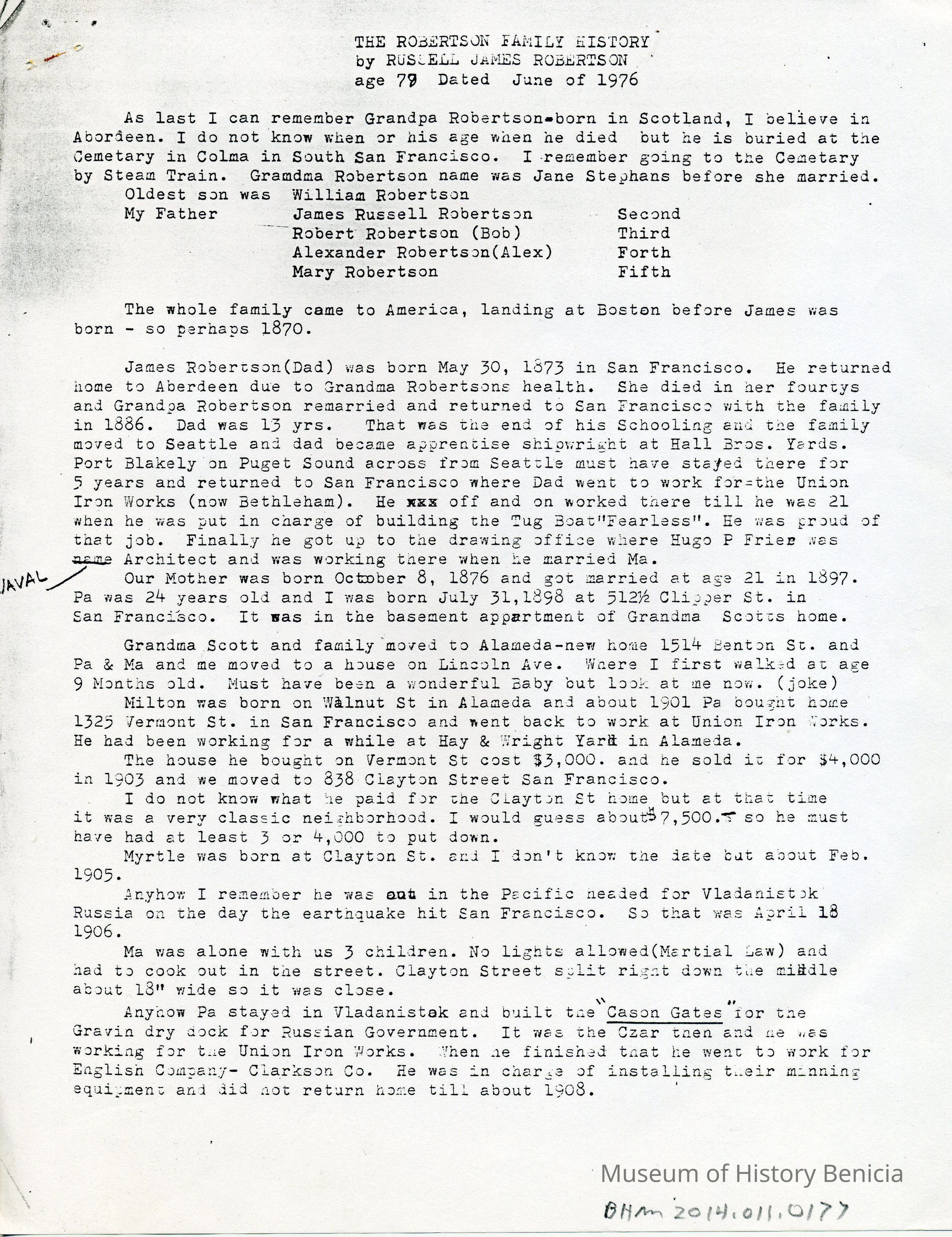 This is a history of the Robertson family written by Russell James Robertson the son of James Russell Robertson who owned the shipyards in Benicia after Turner.Collection