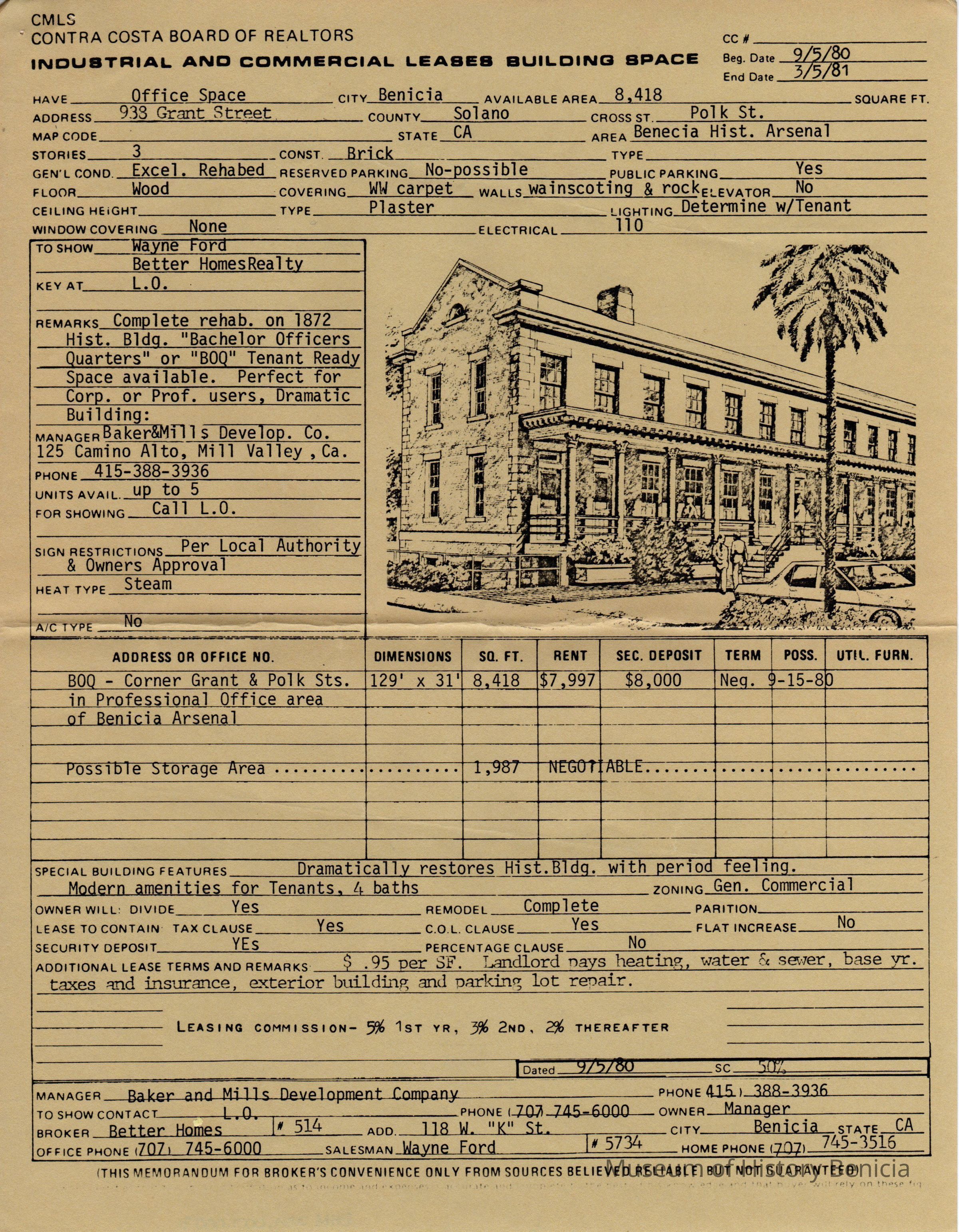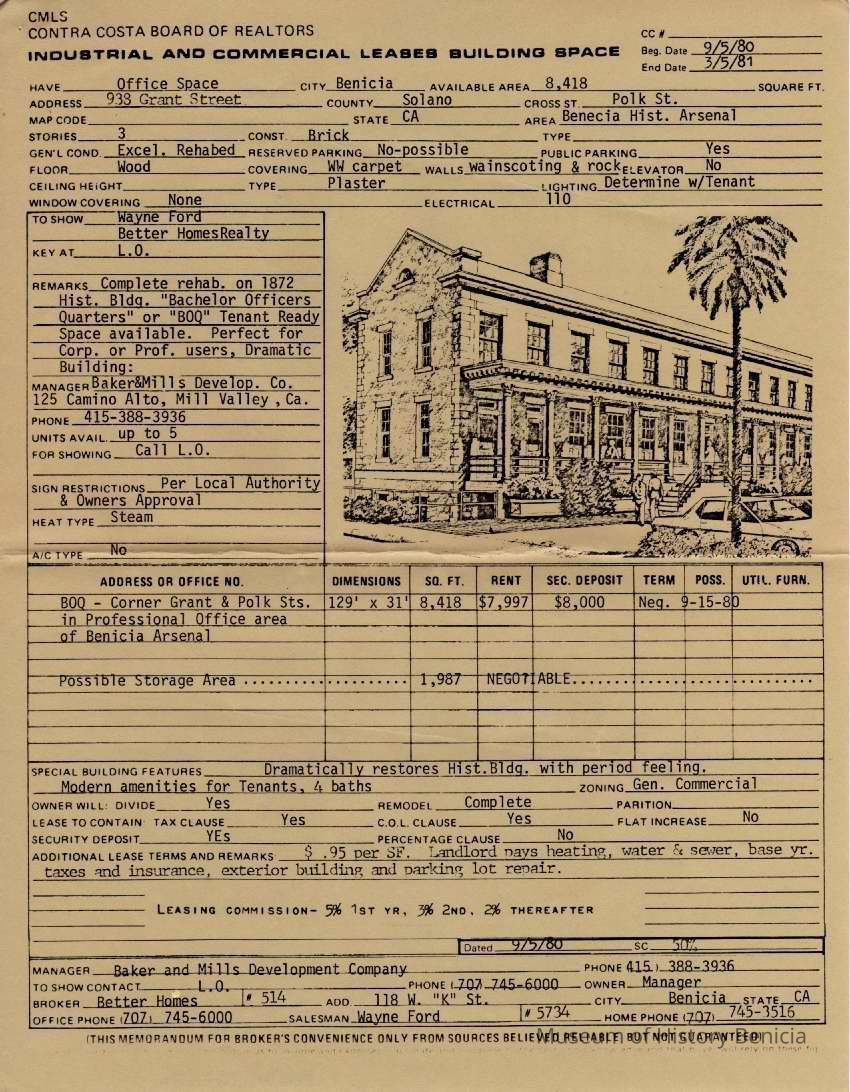 Form for "INDUSTRIAL AND COMMERCIAL LEASES BUILDING SPACE" from the Contra Costa Board of Realtors dated September 5, 1980. Contains information about the building, including rent, history, and an image.Collection