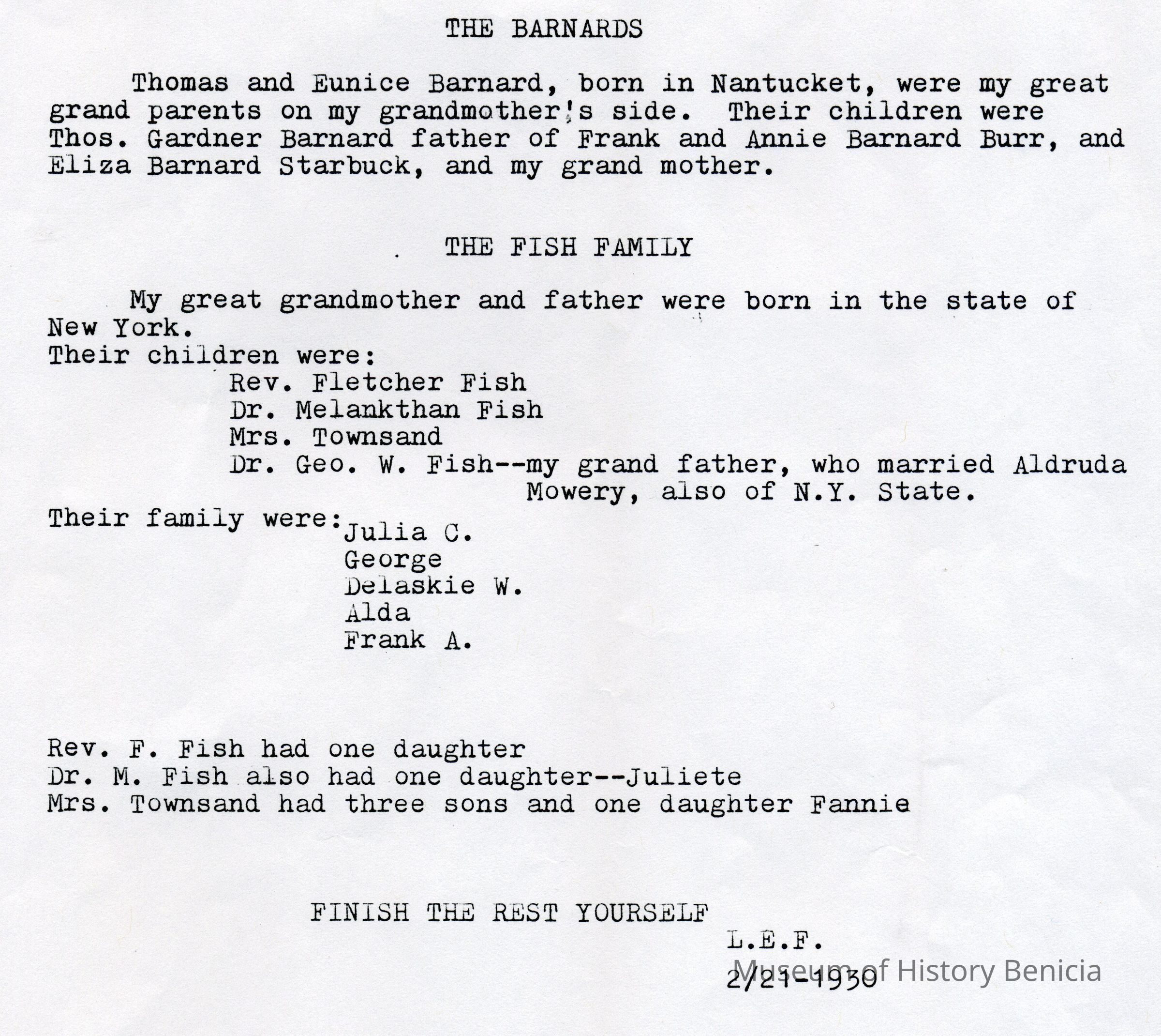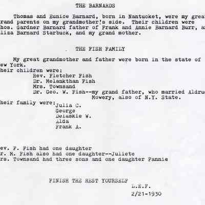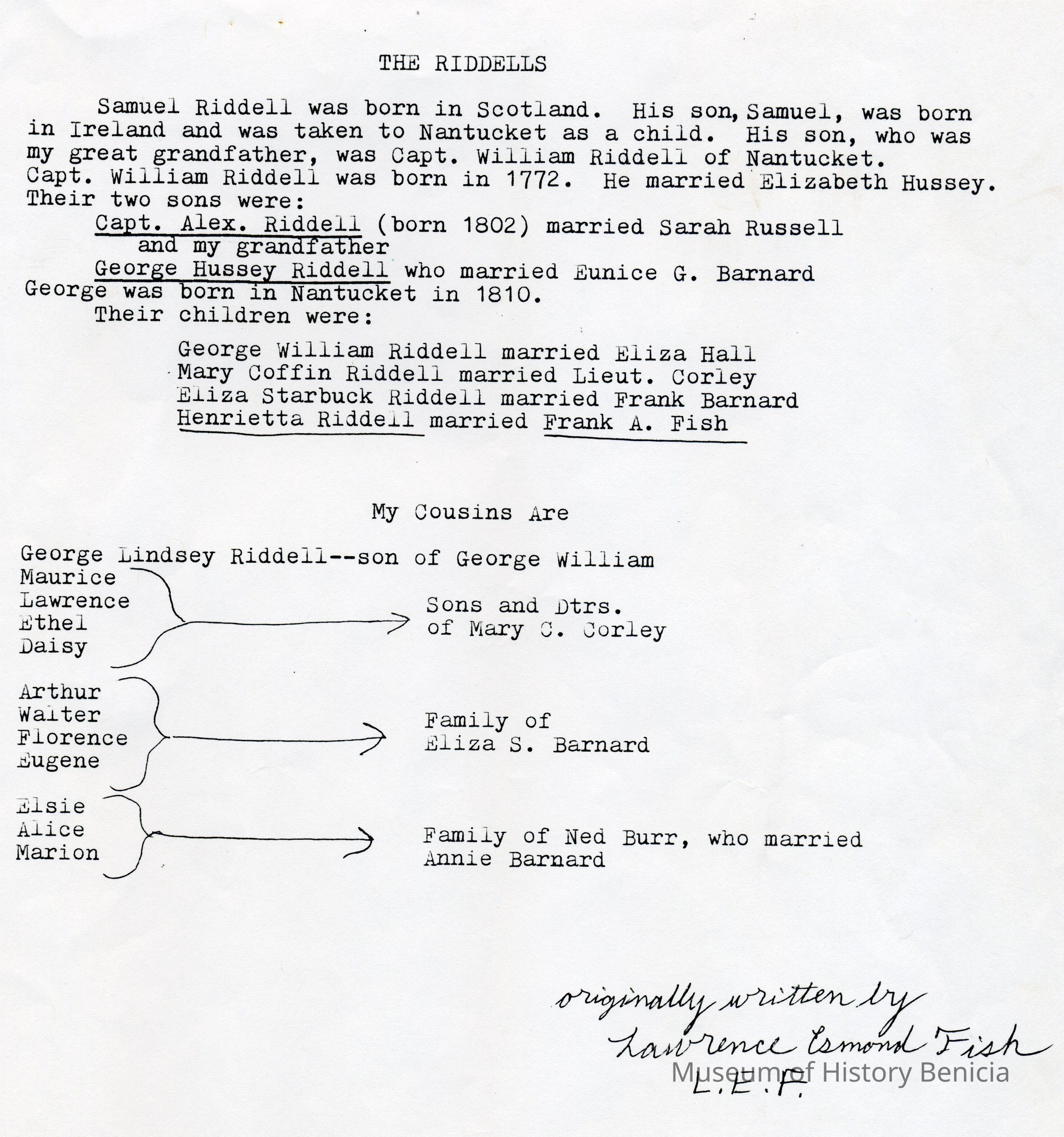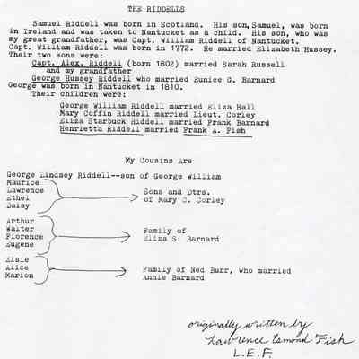 Several typed pages showing the Riddell and Fish families genealogy. A note on the bottom says they were originally written by Lawrence E Fish. They are dated 02/21/1930Collection