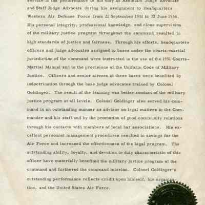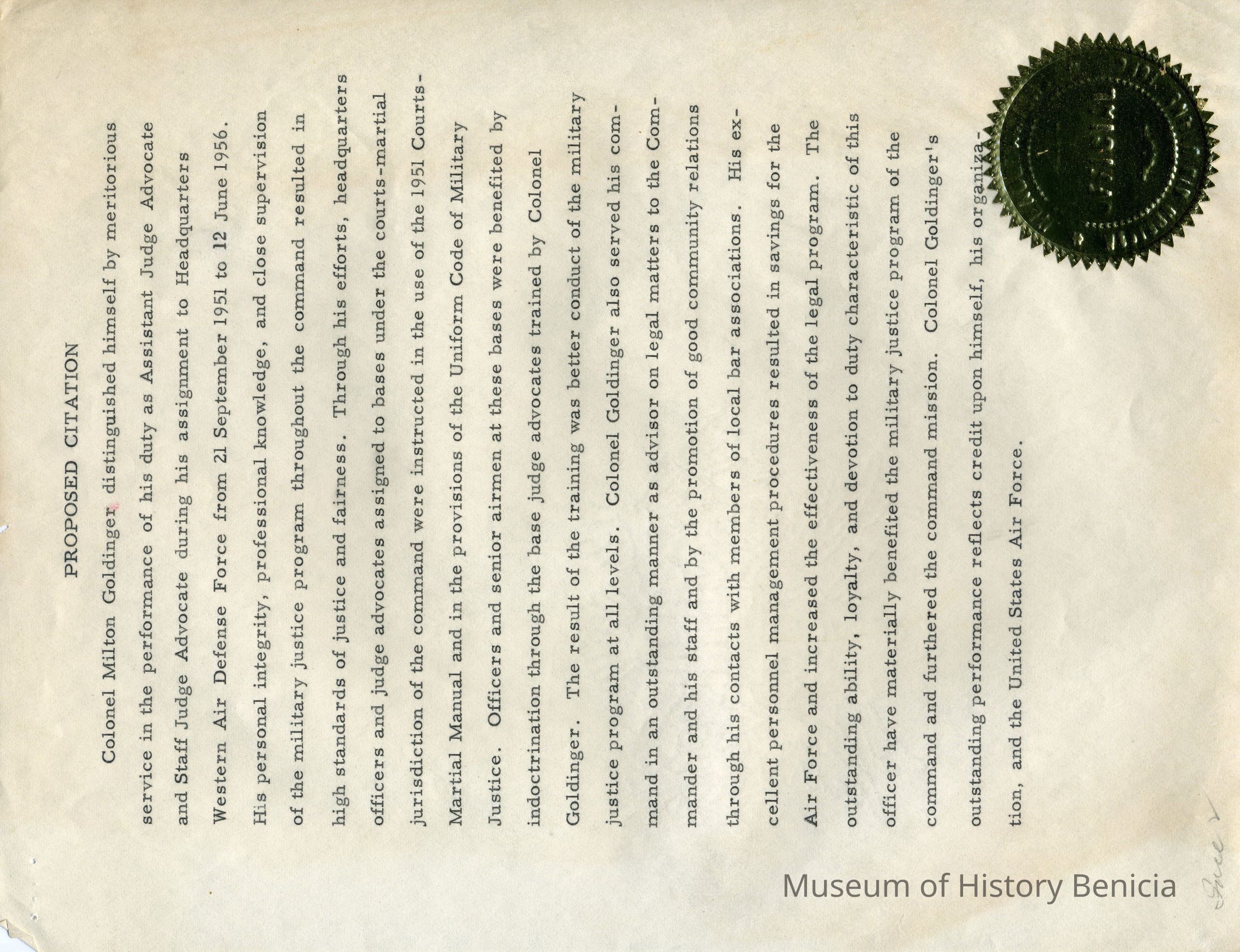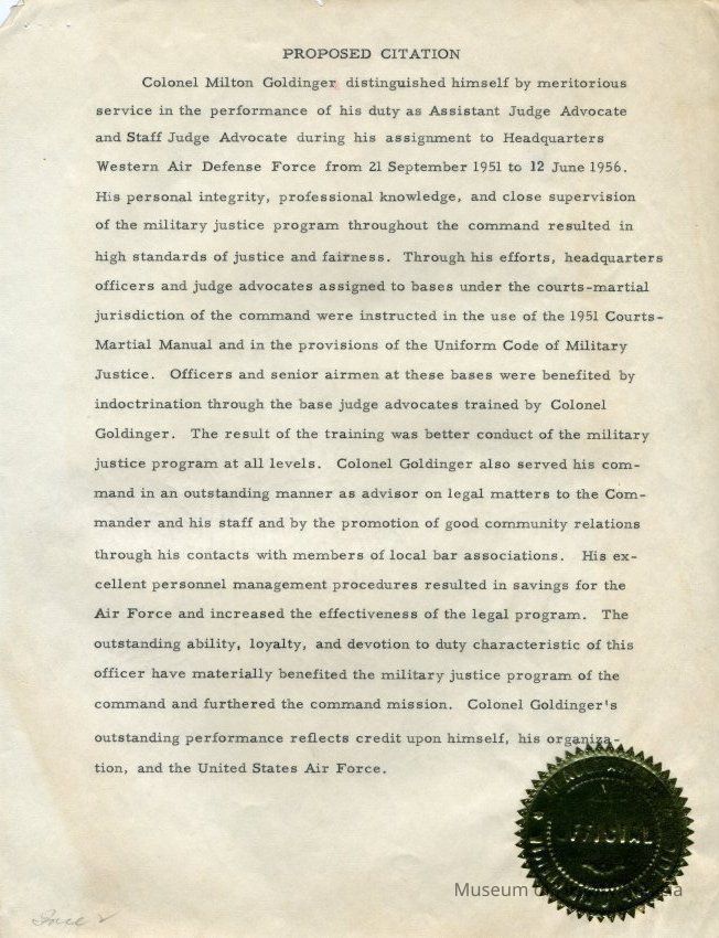 A Proposed Citation for Colonel Milton Goldinger who distinguished himself by meritorious service in his duty as Assistant Judge Advocate. Undated but references service as above from September 21, 1951 to June 12, 1956. Typed document with gold seal.Collection