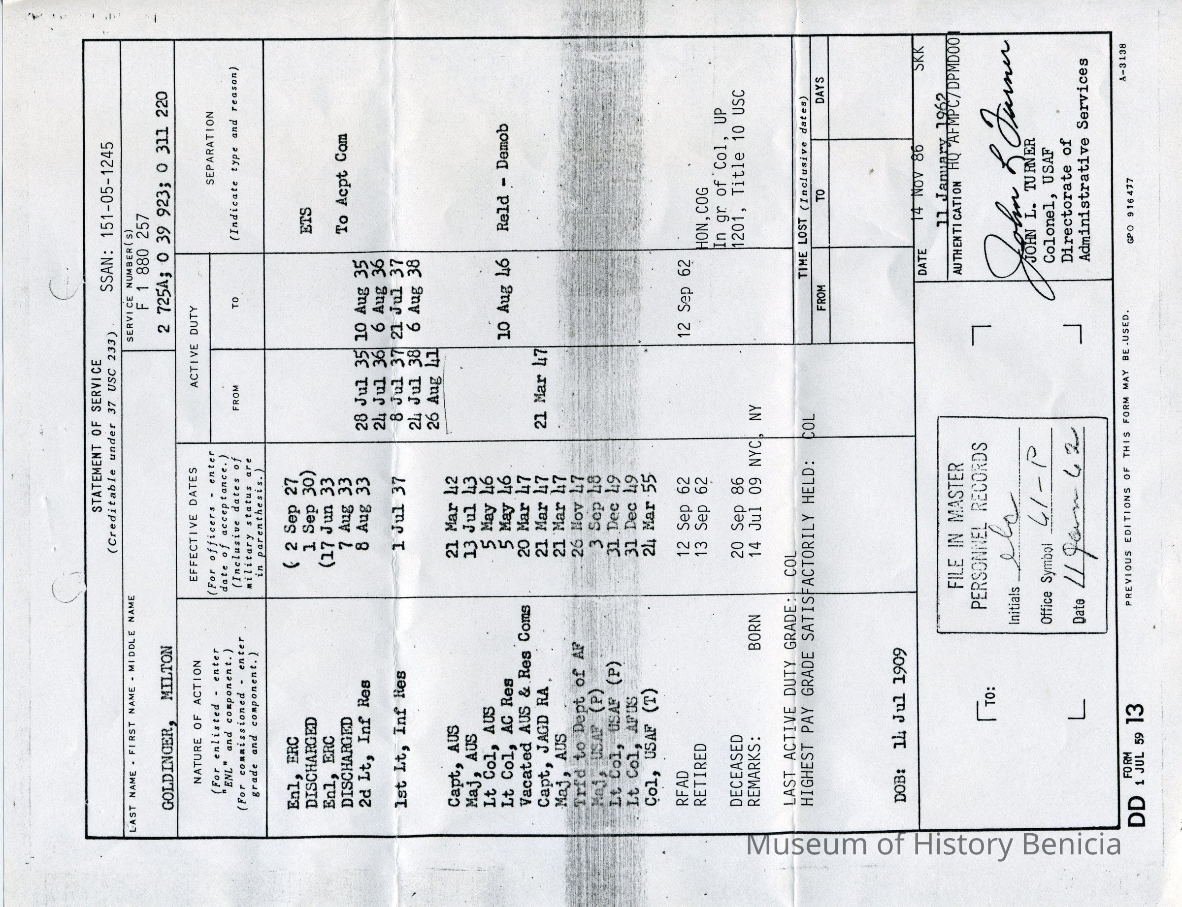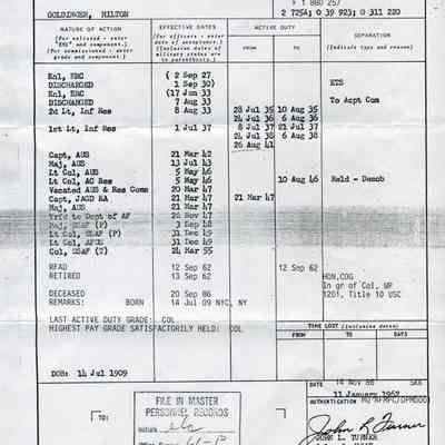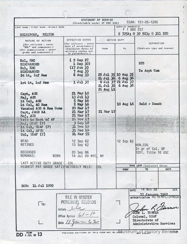 Statement of Service for Milton Goldinger from his enlistment on September 2, 1927 forward sent to his widow. See letter 2007.033.0039. Second of thee identical copies.Collection