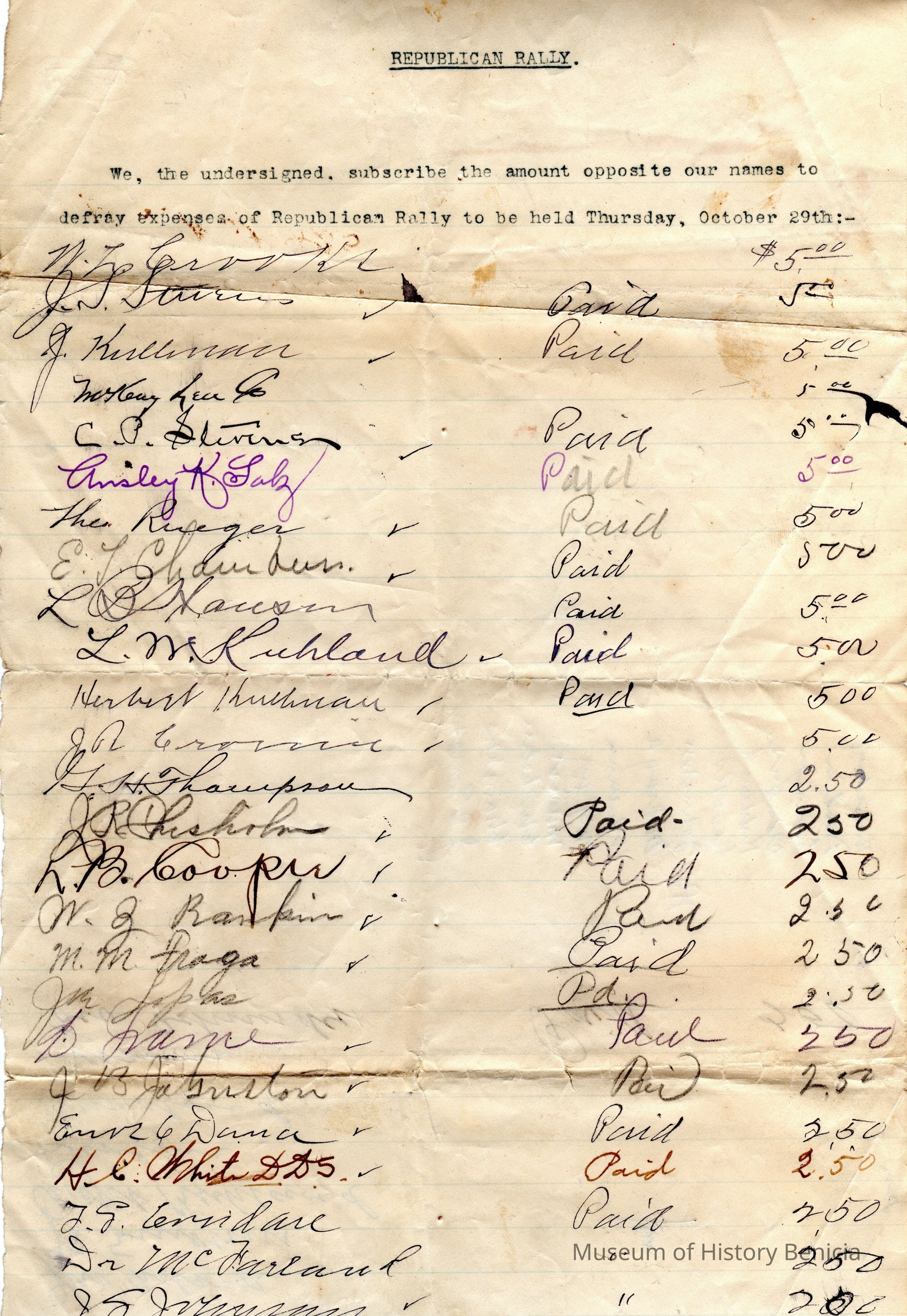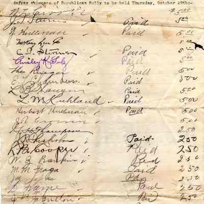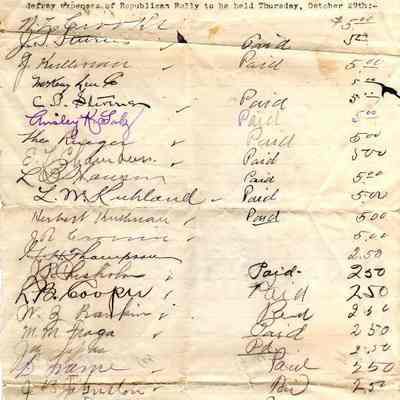 Paper related to pledges for support of the October, 29th Republican rally. It shows supporters names and amounts promised and/or paid. Names include: