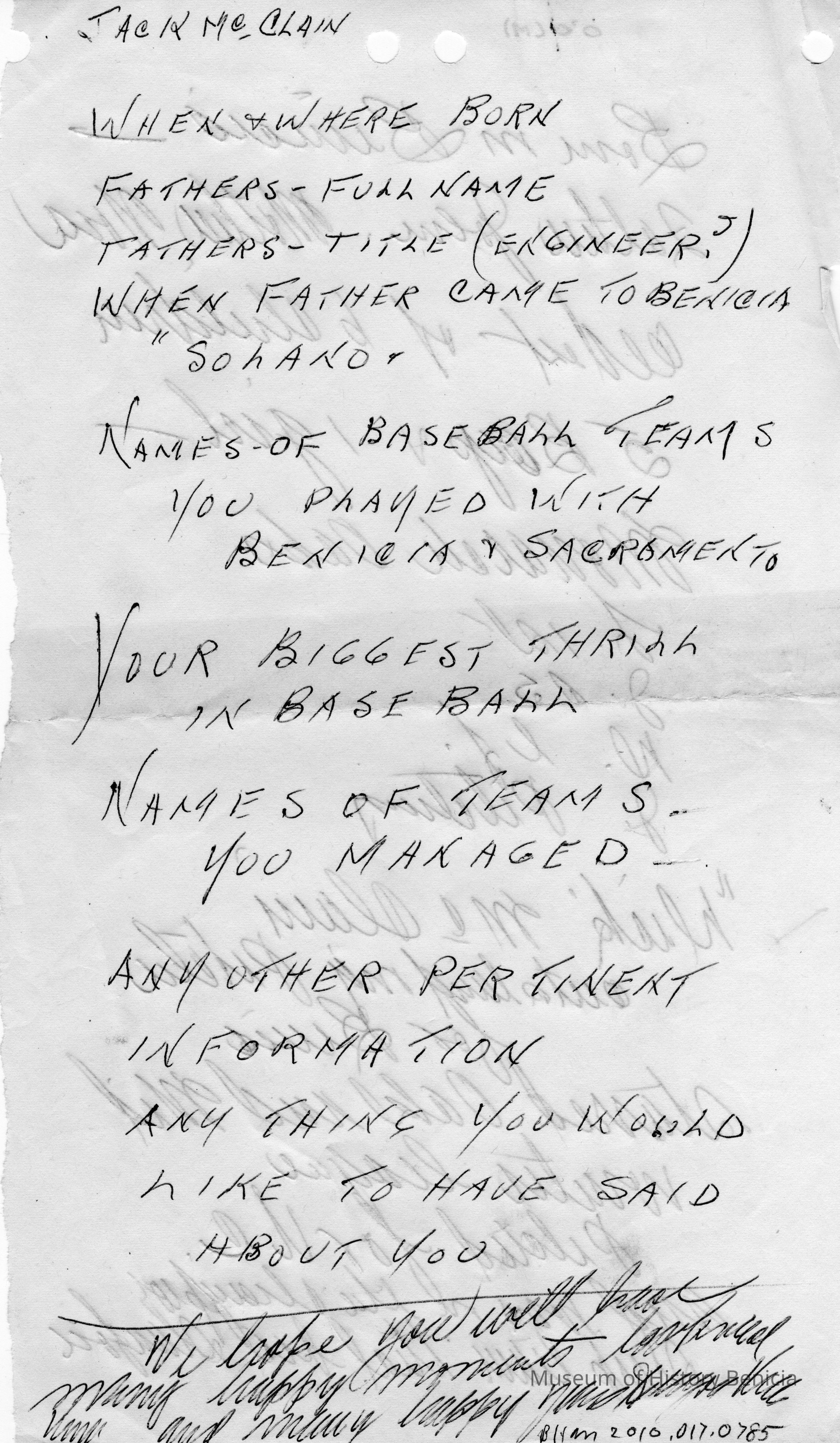 Notes regarding Jack McClain. Probably for a speech Jack O'Grady gave regarding McClain's retirement(?).
