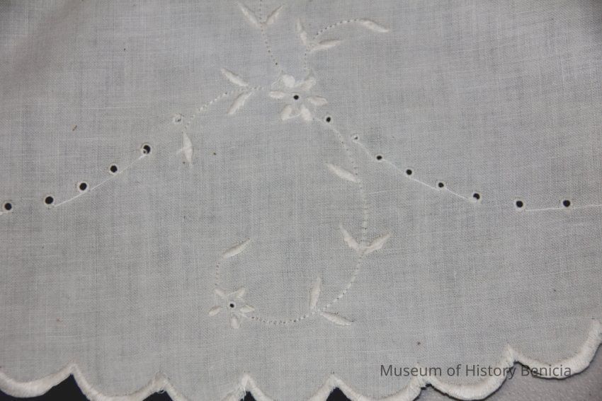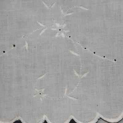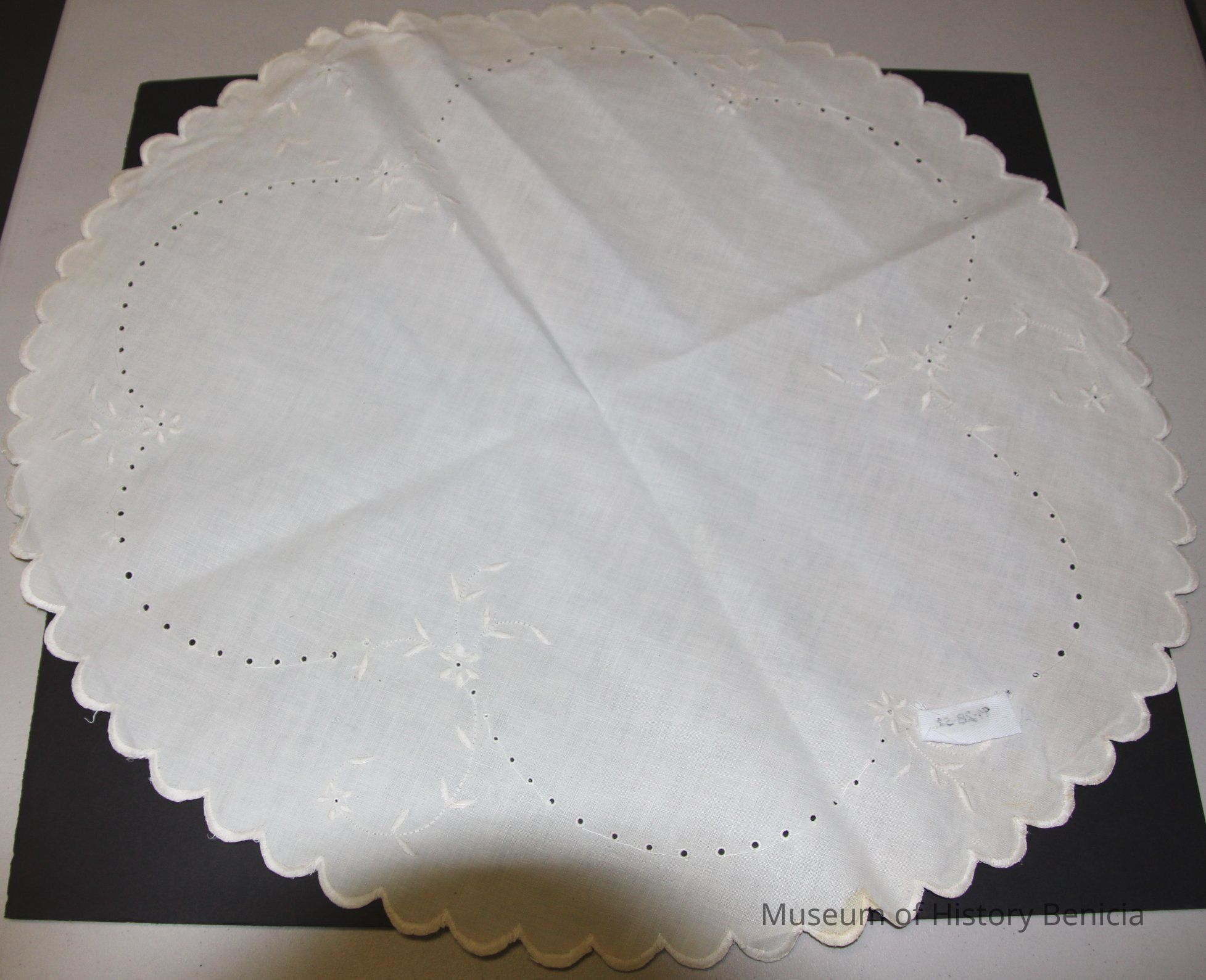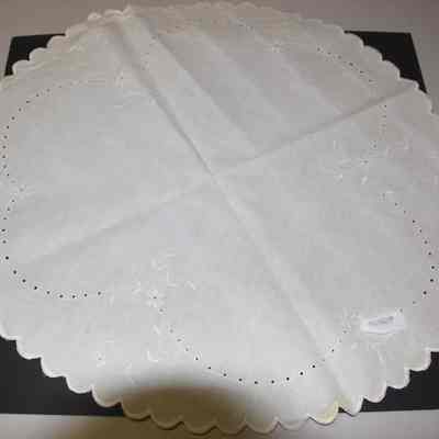 from catalog sheet 7/24/94: large cutwork centerpiece doily with embroidered white flowers and scalloped border done with buttonhole stitch; linen with silk embroidery theadCollection