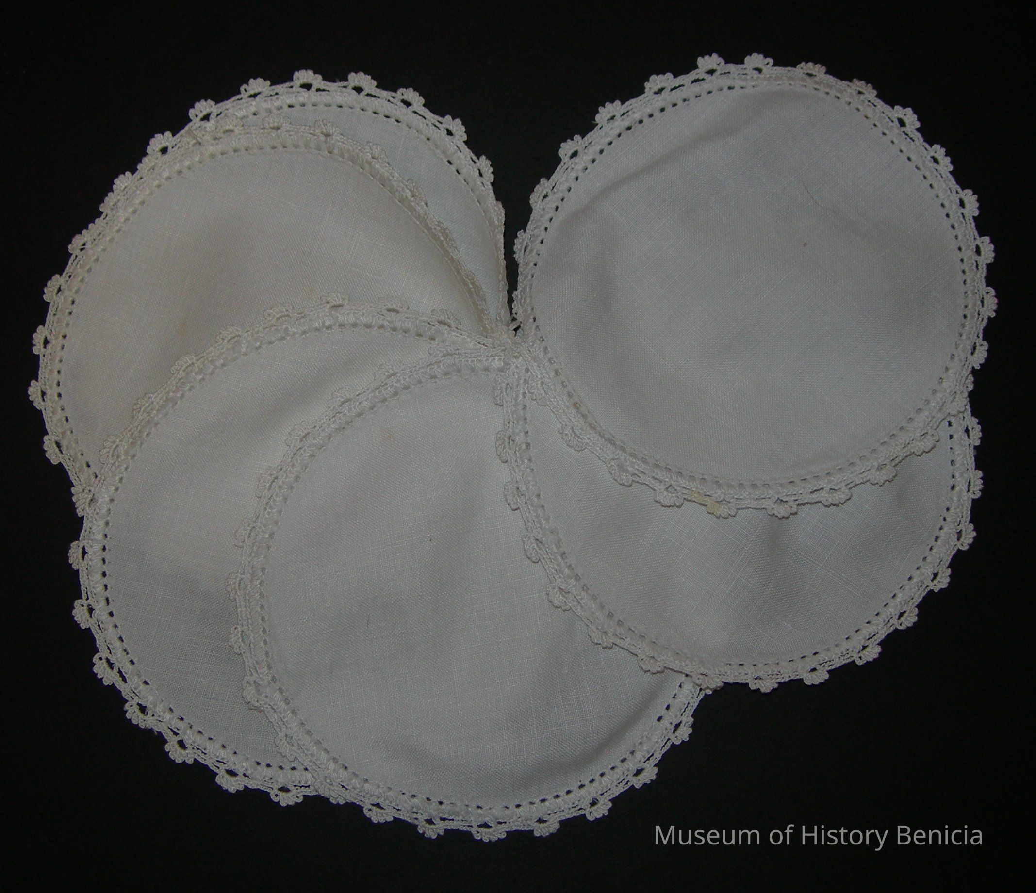 Set of six white doilies with hand crocheted lace trim on edge linen, cotton crocheted edging