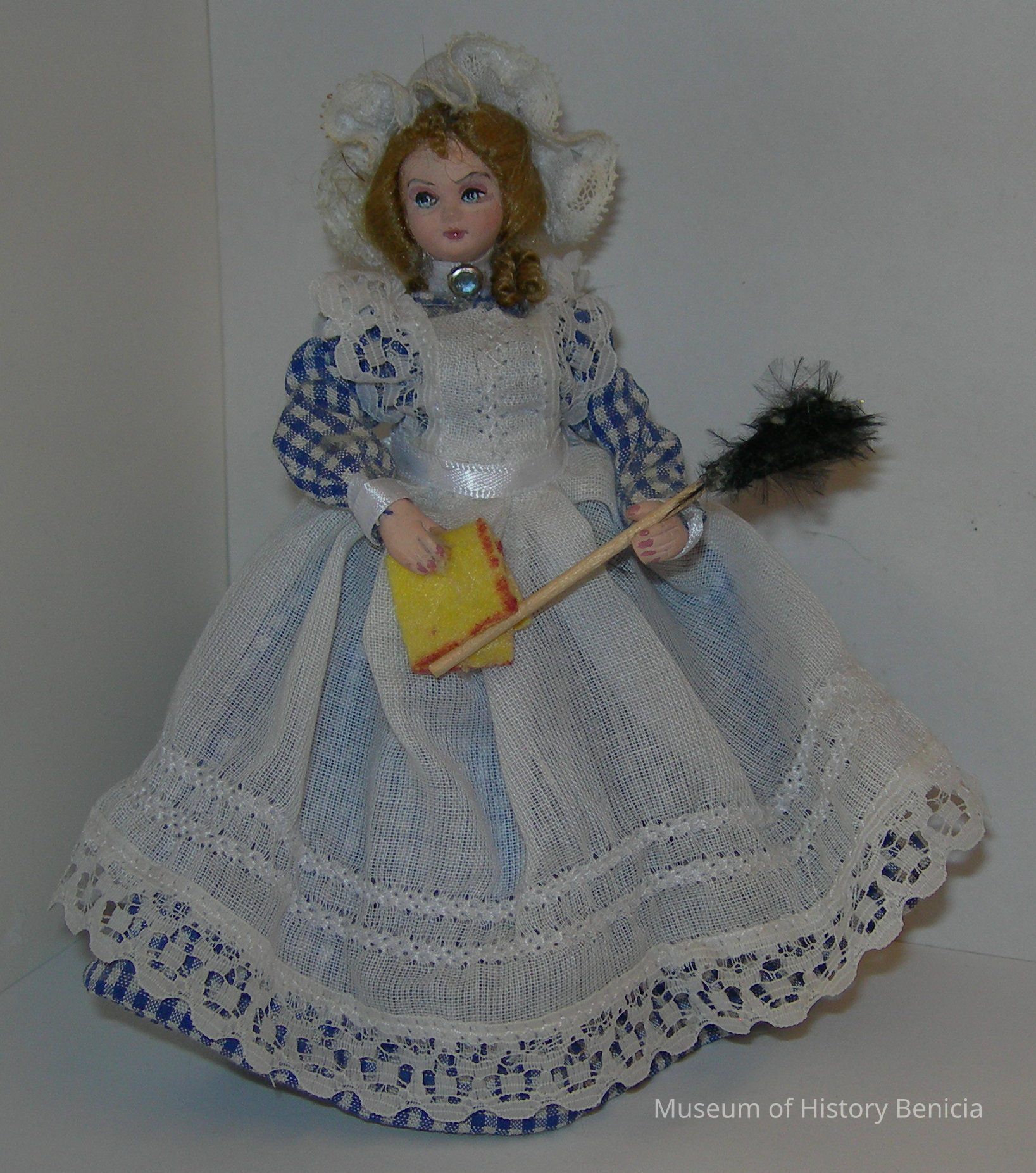 Doll dressed is a blue and white dress with a white pinafore apron and white gathered cap; blonde hair; she is holding a duster on a stick in one hand and a cleaning cloth in the other;