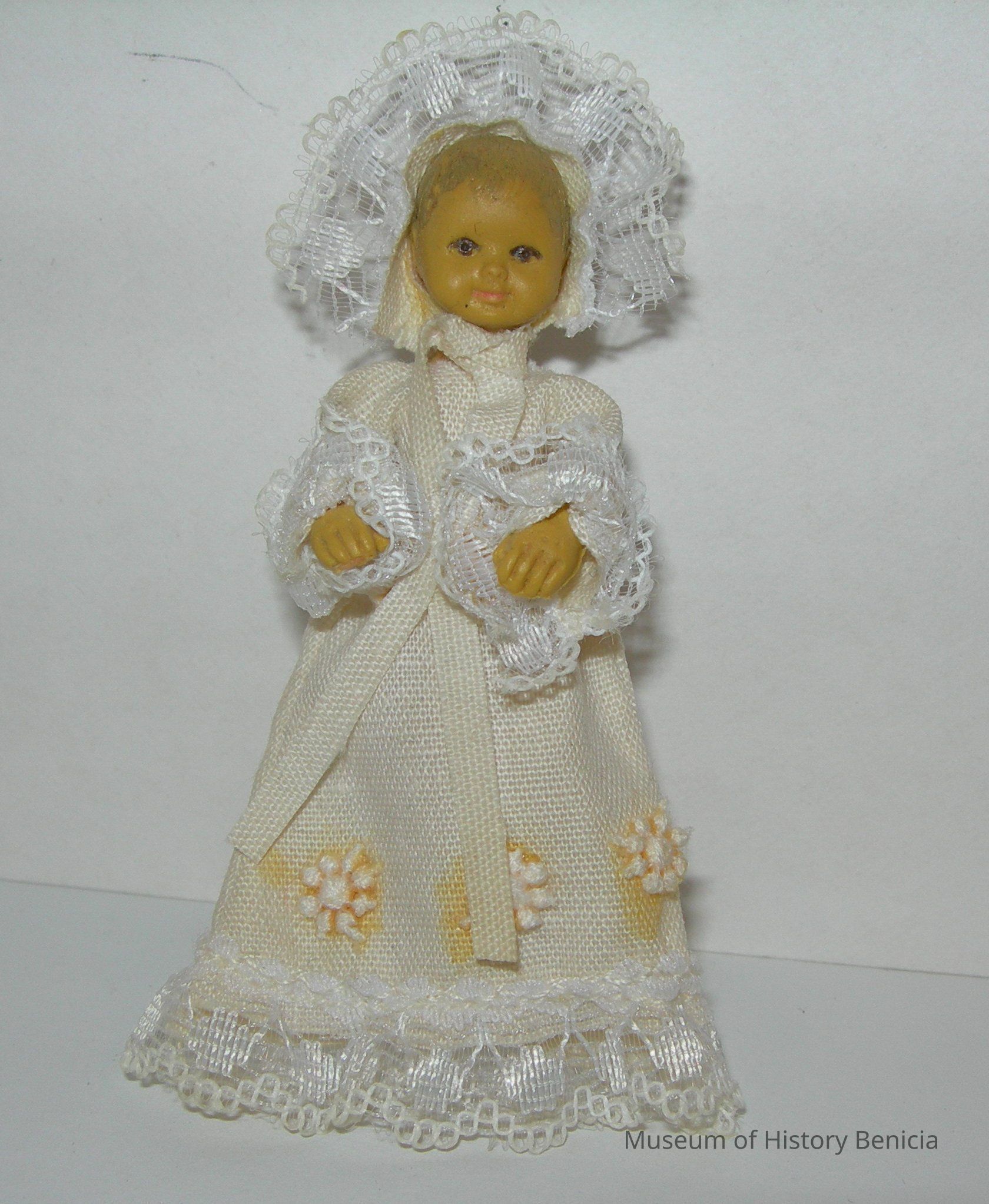 Baby doll in a Christening type gown and bonnett - fancy with lace and embroidery and ribbon (doll is not wearing underwear) lays in the rocking cradle