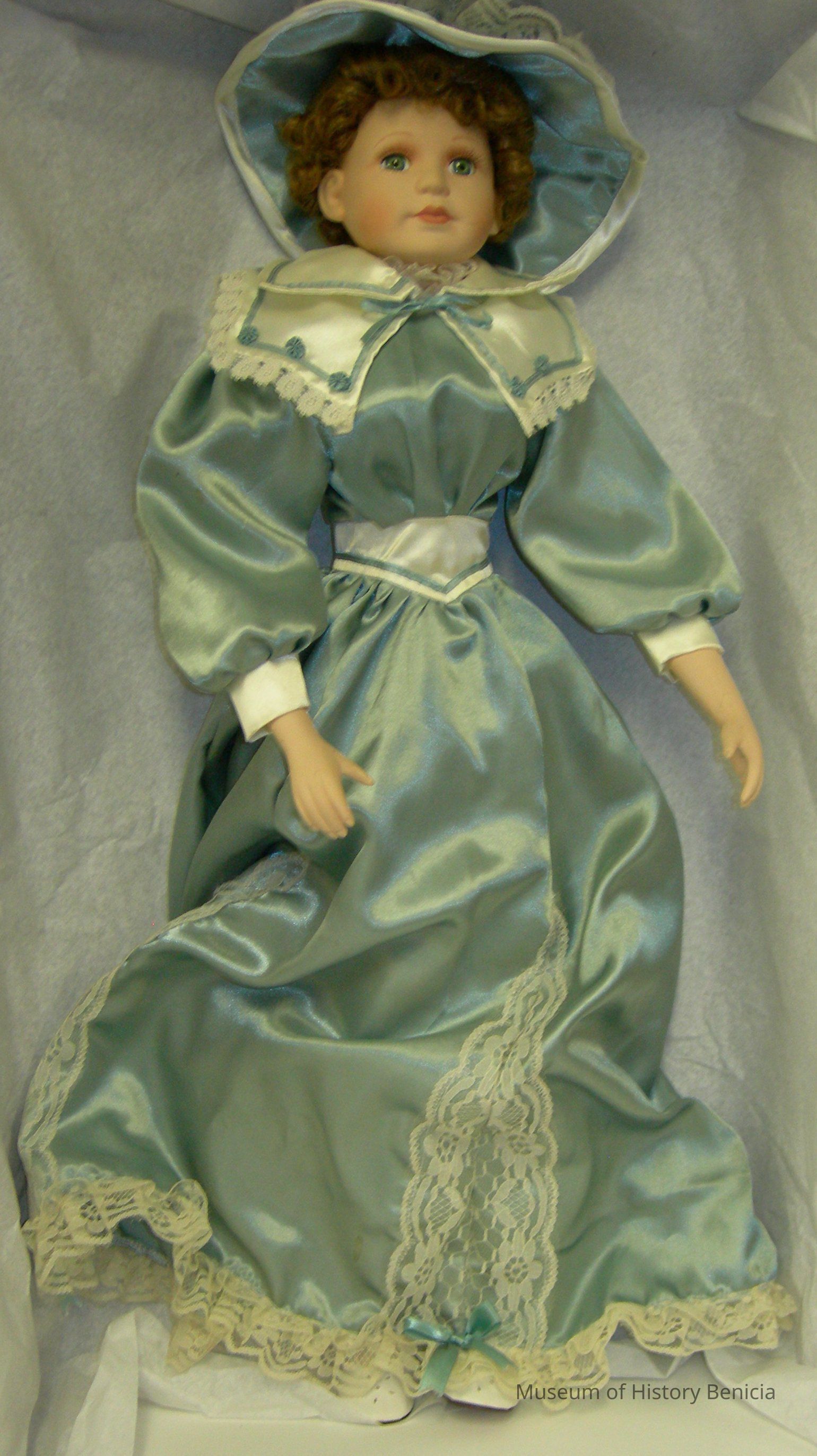 BHM2010.018.0003a - long dress, sage green satin with white satin and white lace trim