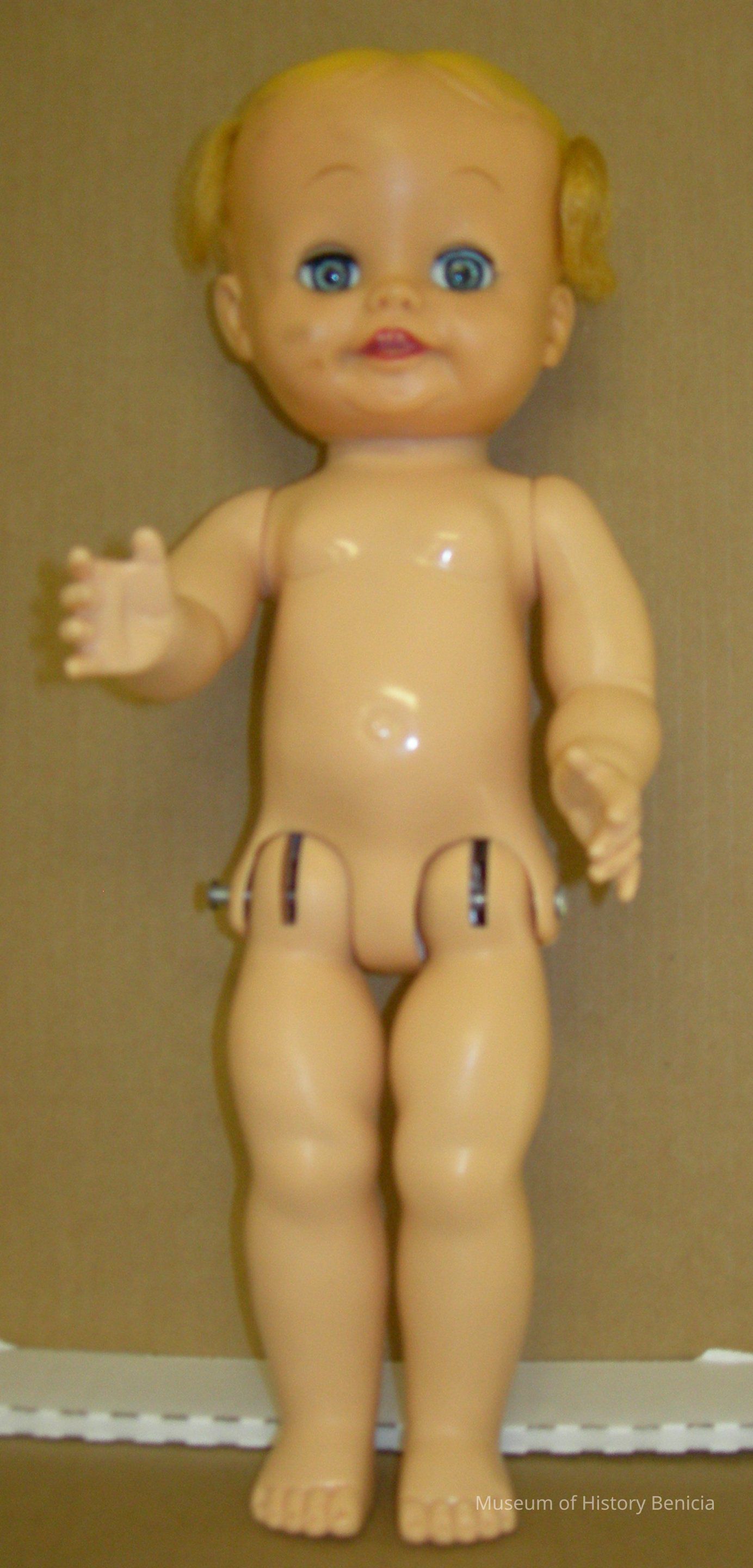 doll - caucasian - soft/pliable head with holded hair (blonde) and a ponytail of synthetic hair on each side, moveable eyes open and close w/lashes, formed mouth is open showing teeth, arms move at shoulder, legs move at hip, doll is unclothedCollection