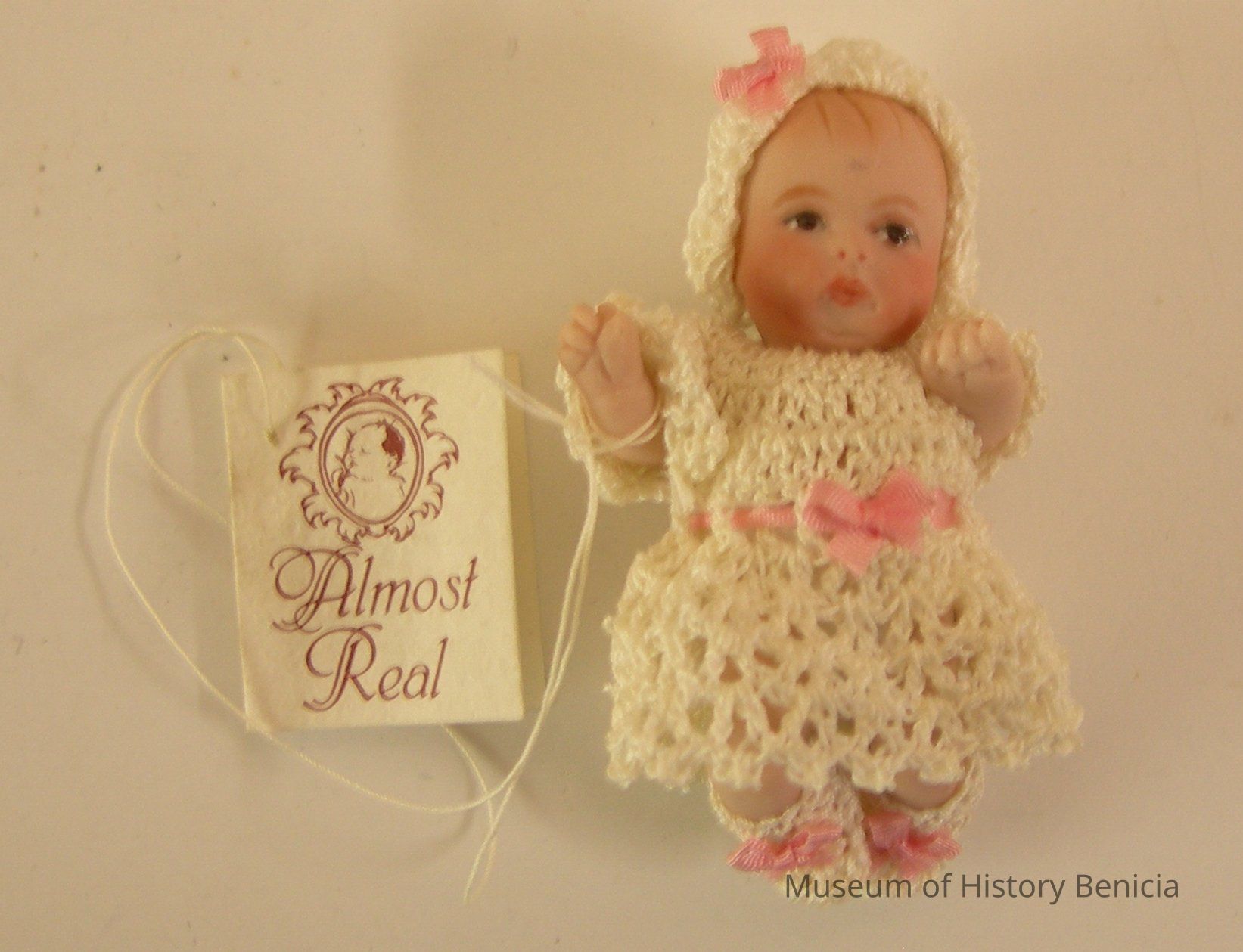 Miniature baby doll in crocheted outfit: bonnet, dress and booties in white with pink ribbons; diaper is cotton; porcelain head and body;