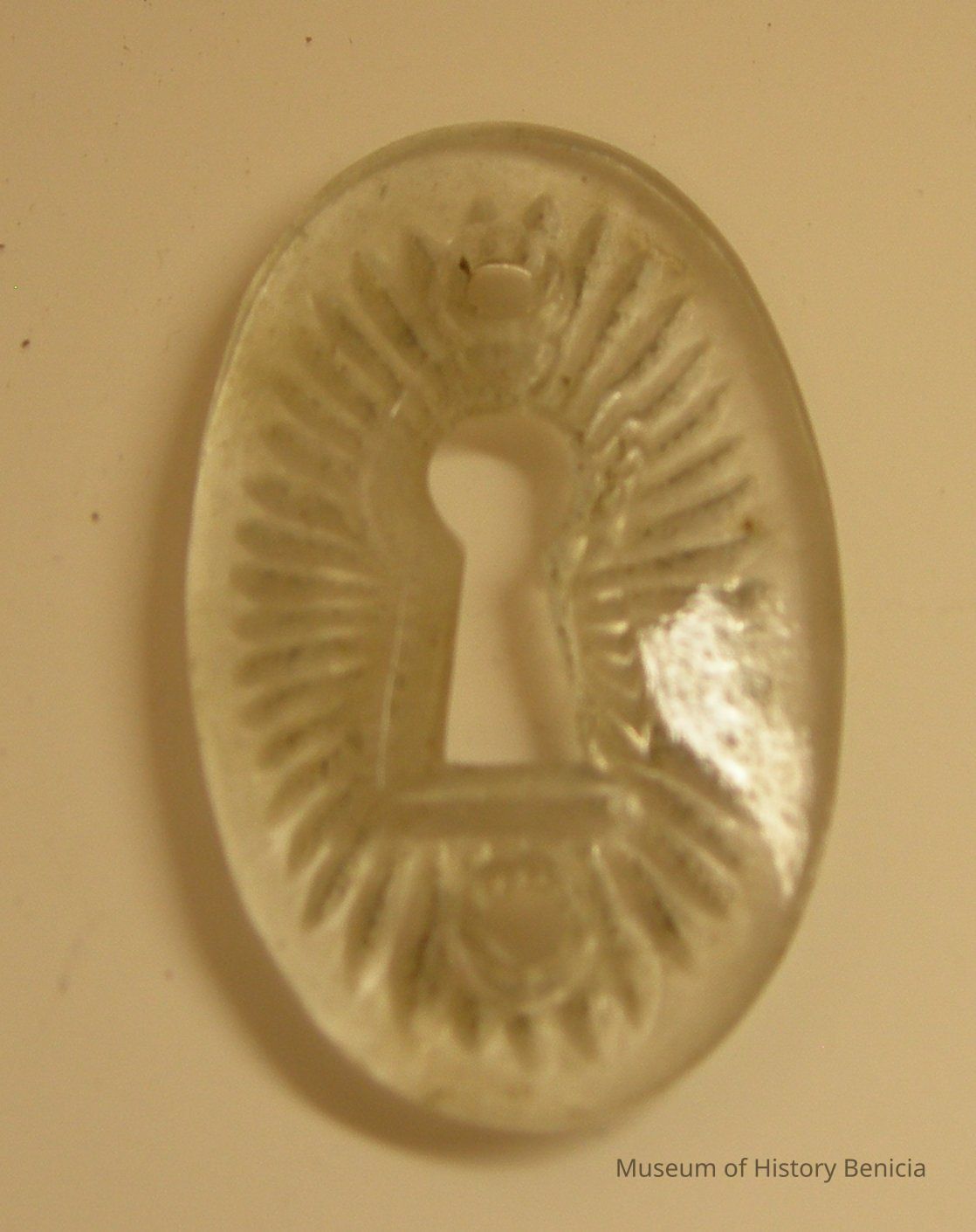 Keyhole plate - clear glass with holes for two attaching screws; 2-1/8" long x 1-1/4" wide.