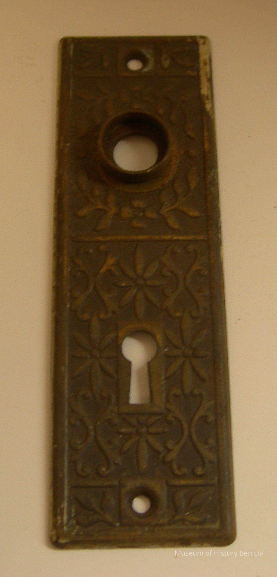 Keyhole plate - decorative metal with holes for the door knob, the key and two attaching screws; 5-3/4" long x 1-3/4" wide.