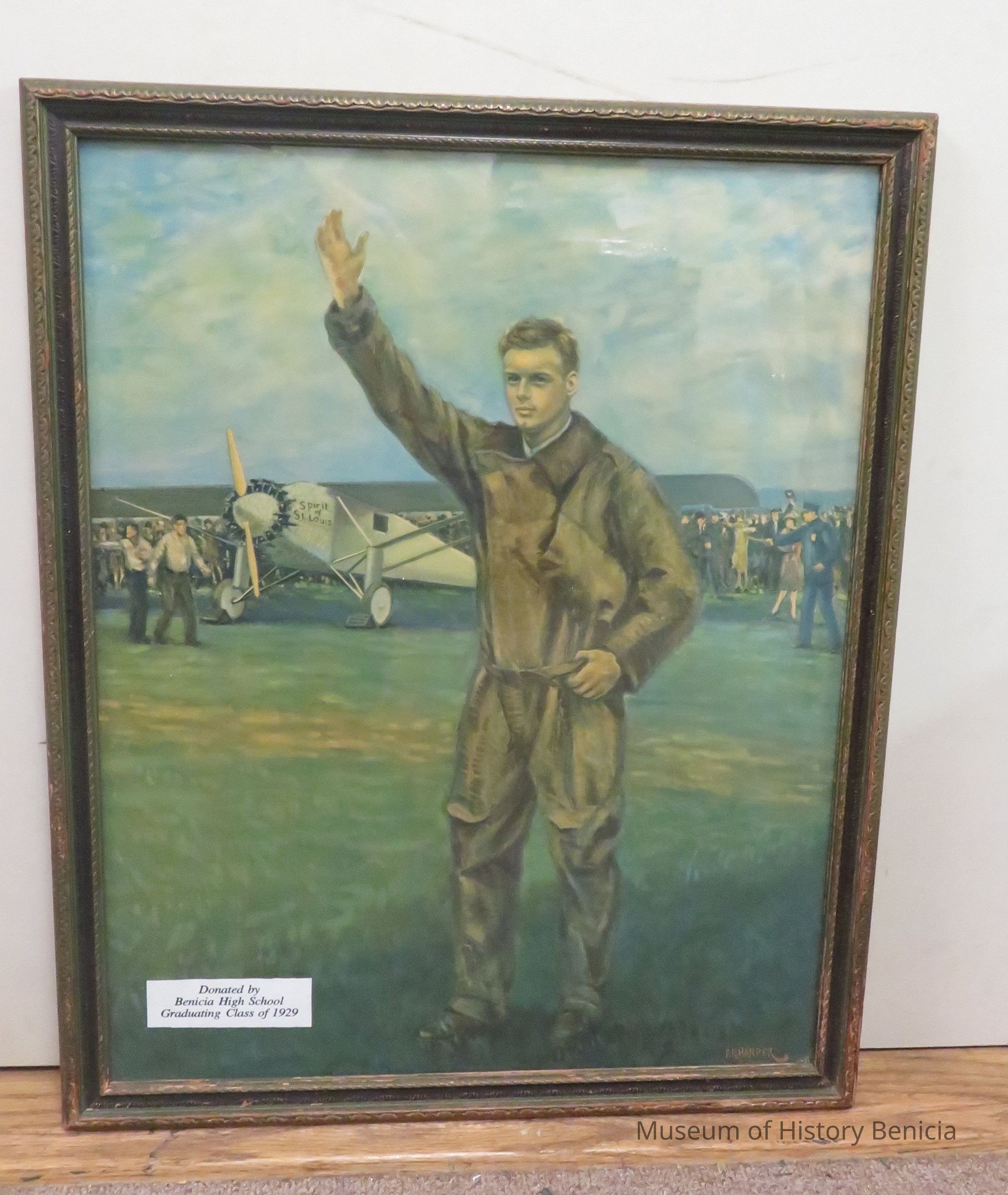 This framed drawing of airplane pilot Charles Lindbergh was donated by Benicia High School Graduating Class of 1929. A young Charles Lindbergh has his right hand raised above his head and in the background is his plane, the "Spirit of St. Louis." People have gathered behind him to celebrate his flight and are being kept back by security. Drawing indicates location is on a grassy field with an ocean behind the people. It appears to be a sunny day with many clouds overhead. Author is Frank R. Harper (written on bottom right).