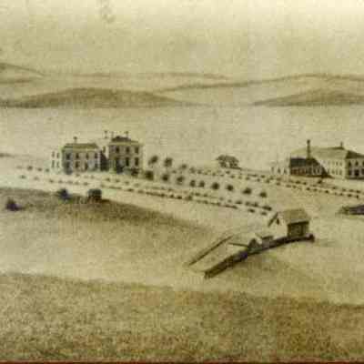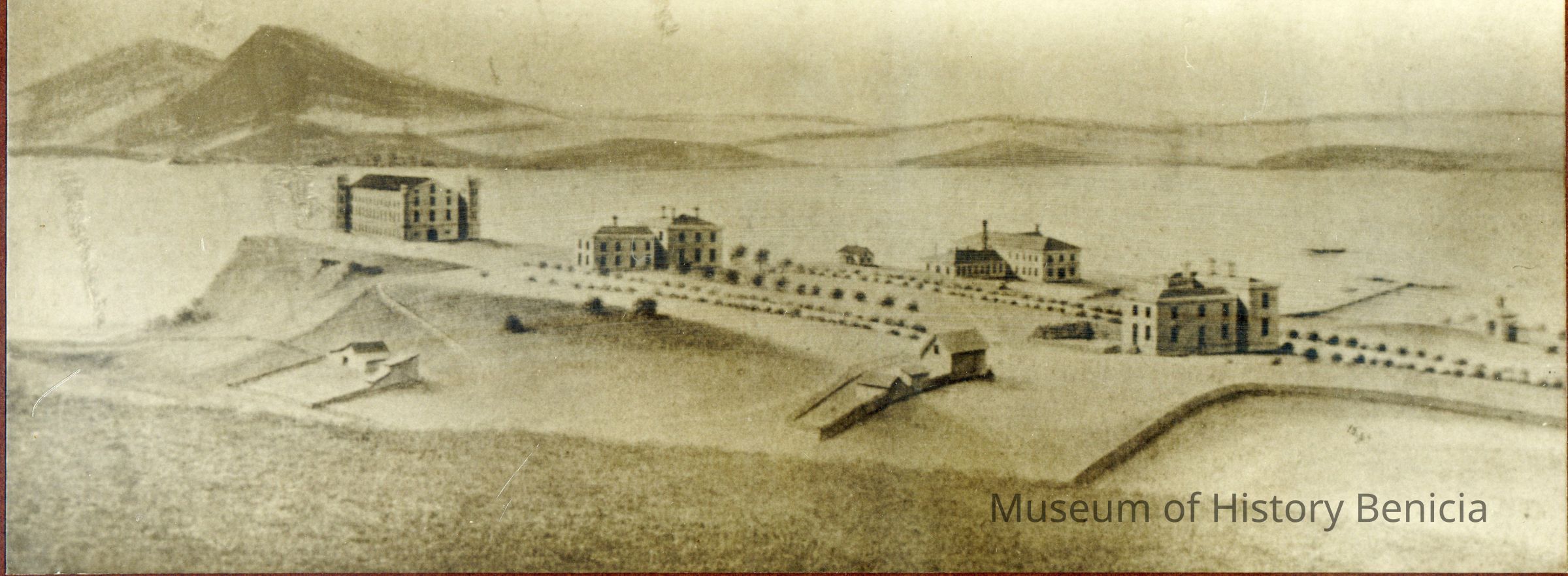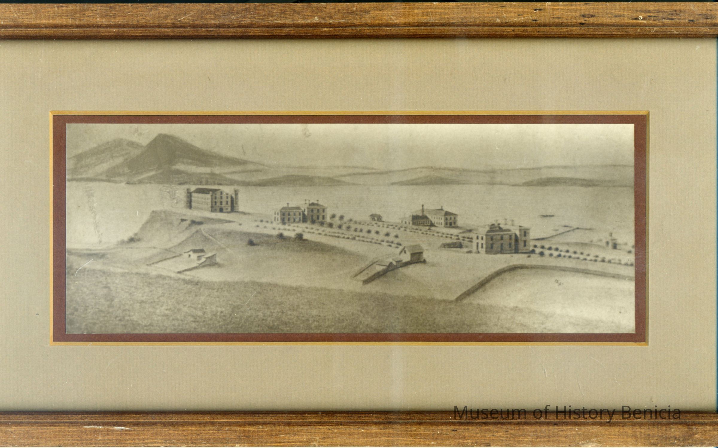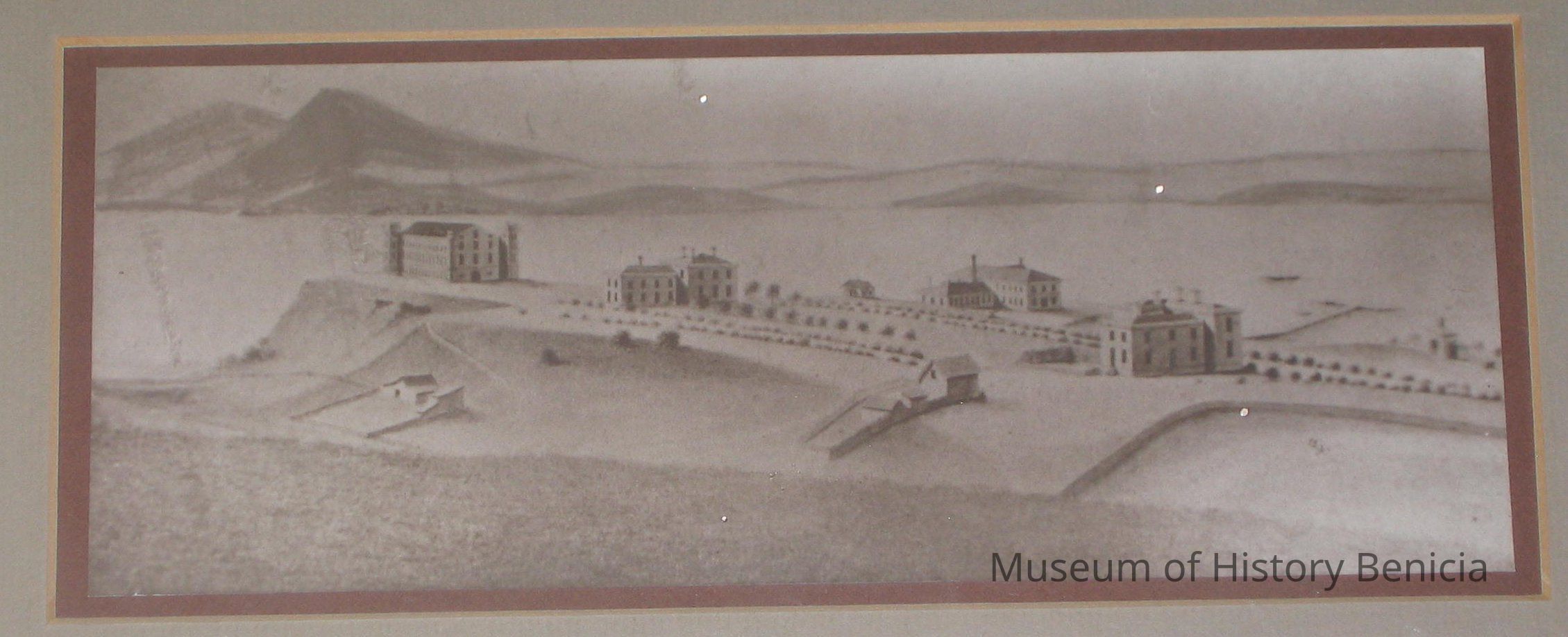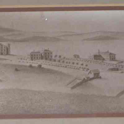 Framed drawing by Hugo Hochholzer C. 1860. View of the Arsenal from Northwest. Shows main arsenal storehourse, commanding officers house and lieutenant's house.Collection