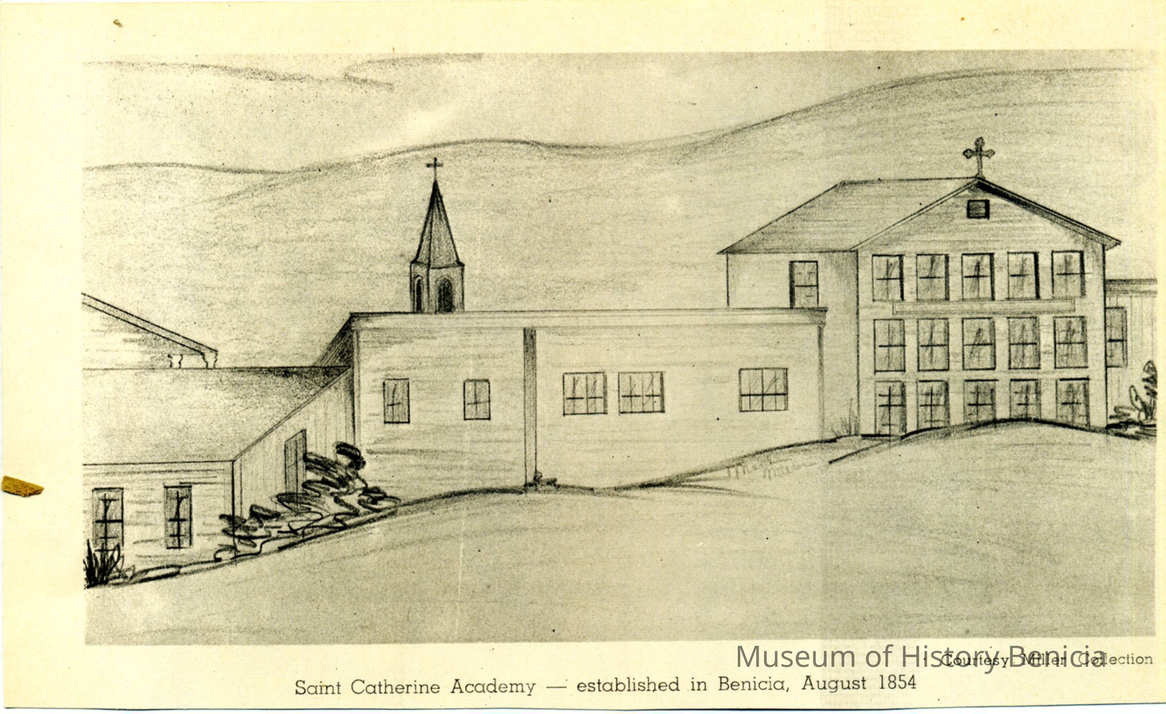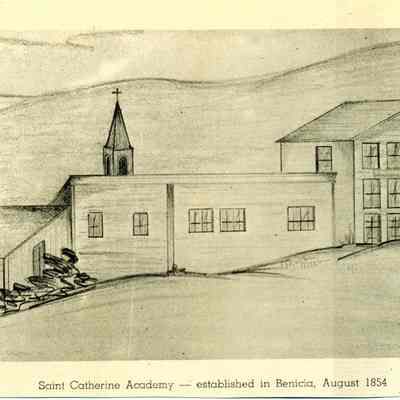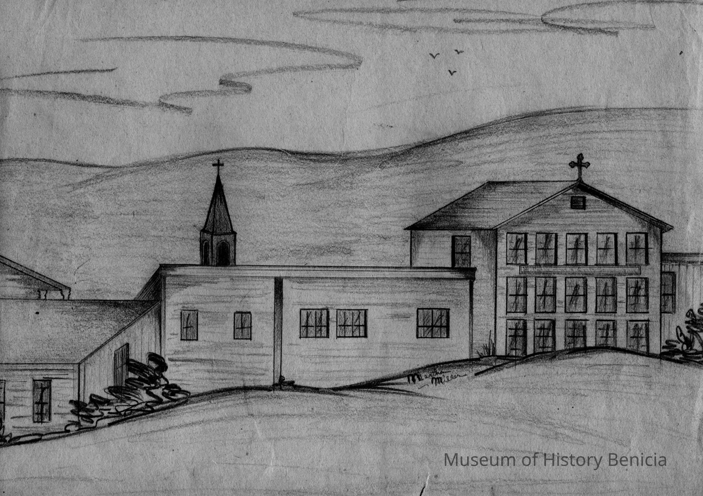 This is apencil drawing of St. Catherine's school. It is signed Martha Miller who is LeNoir Miller's daughter. It is 9 x 12".